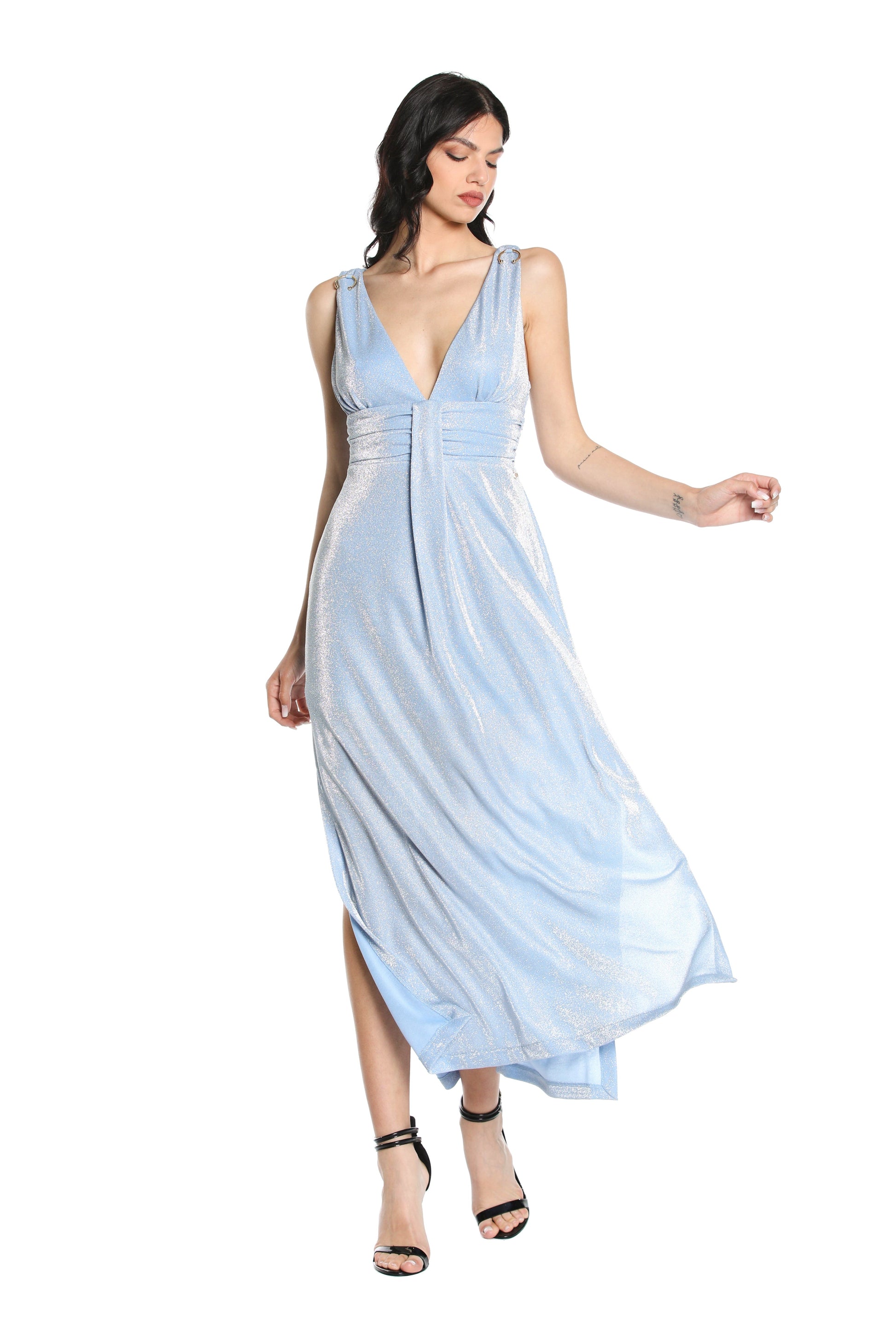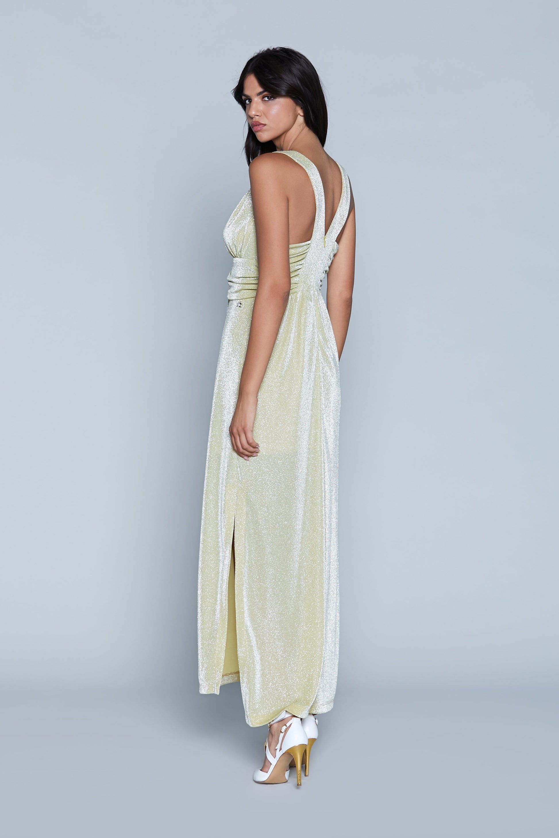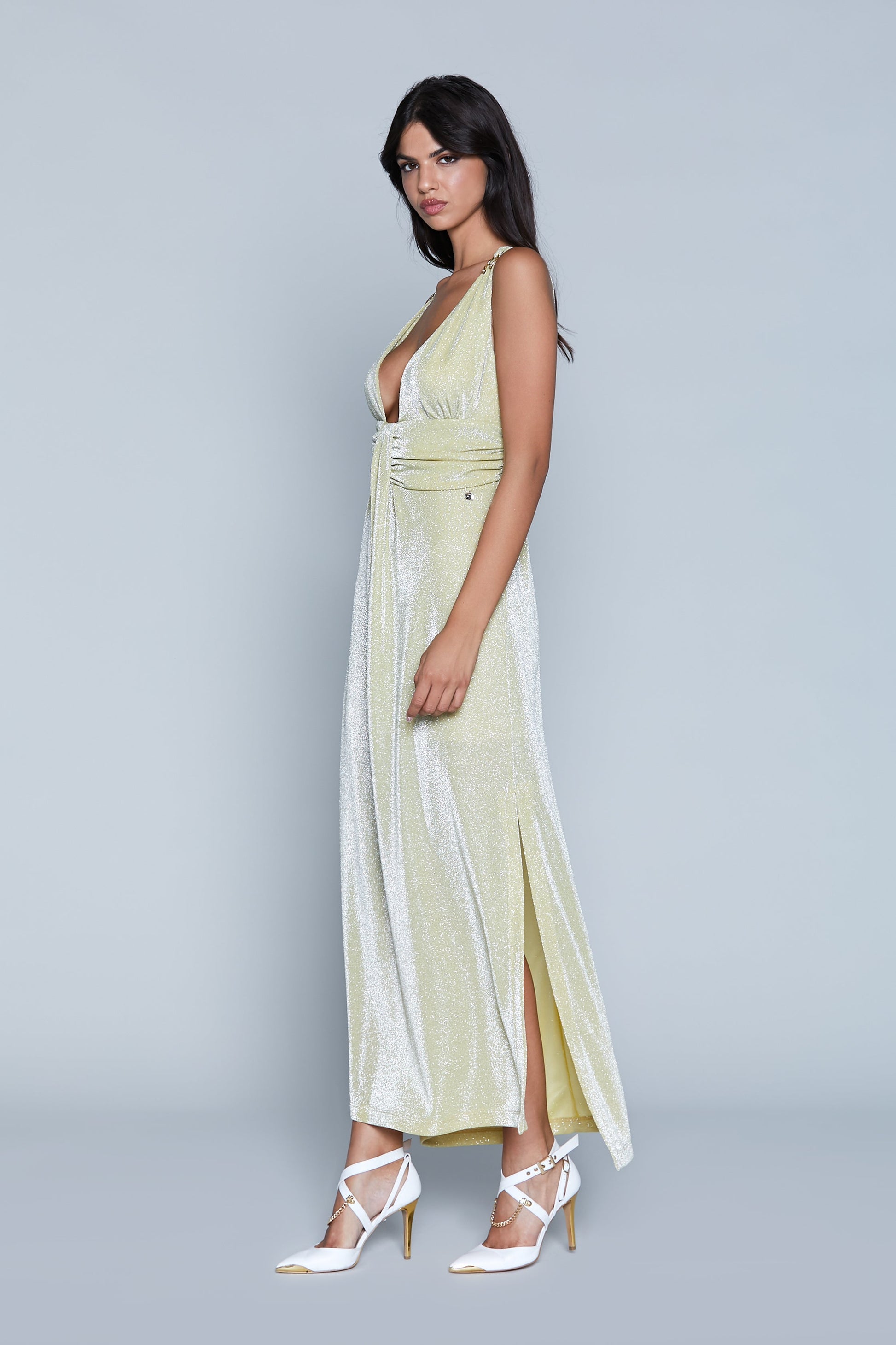 S/M 长 AURORA 连衣裙,带穿孔应用加褶皱加卢勒克斯开衩