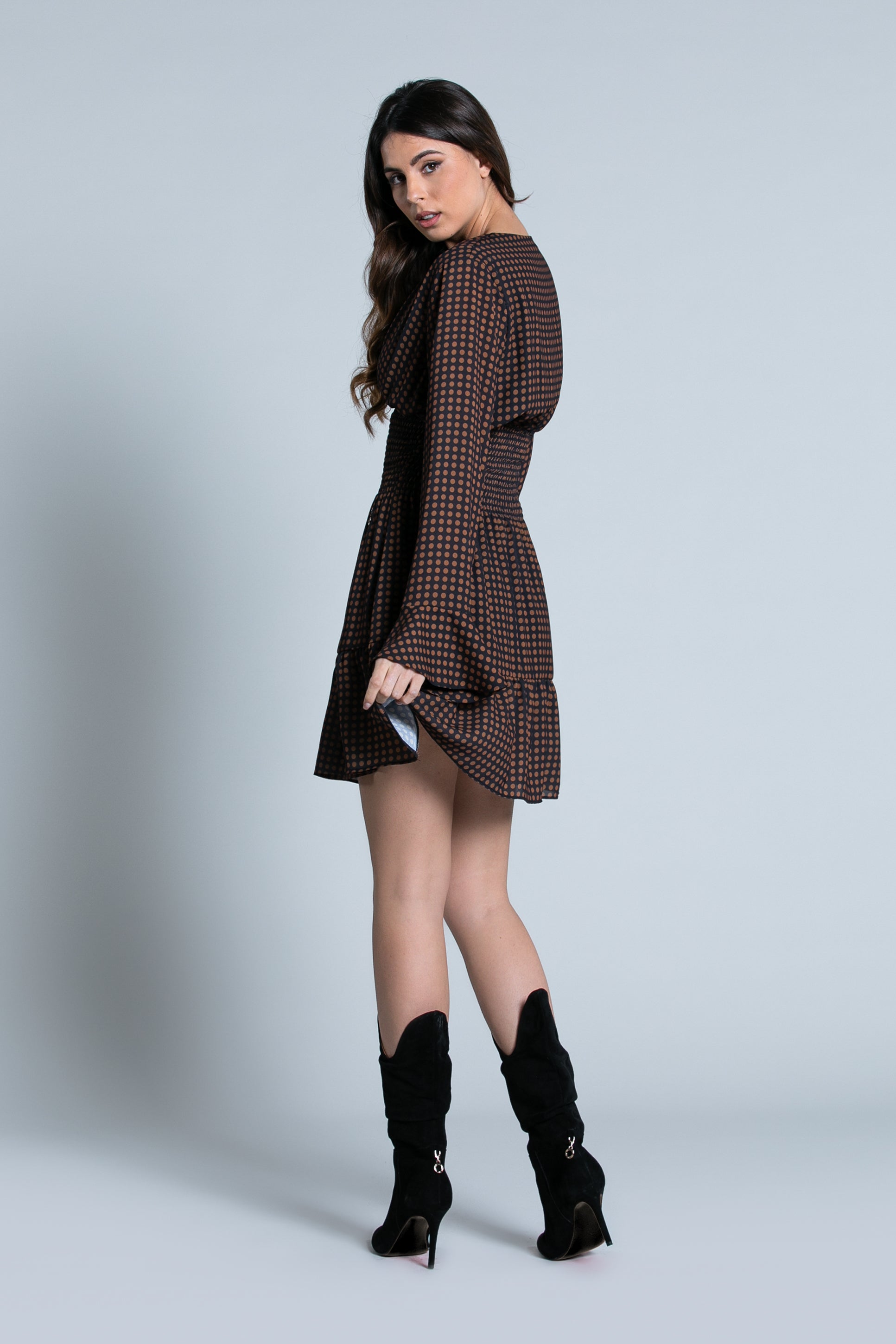 MAUDI 短裙长袖喇叭形交叉加针烟熏腰加波点荷叶边