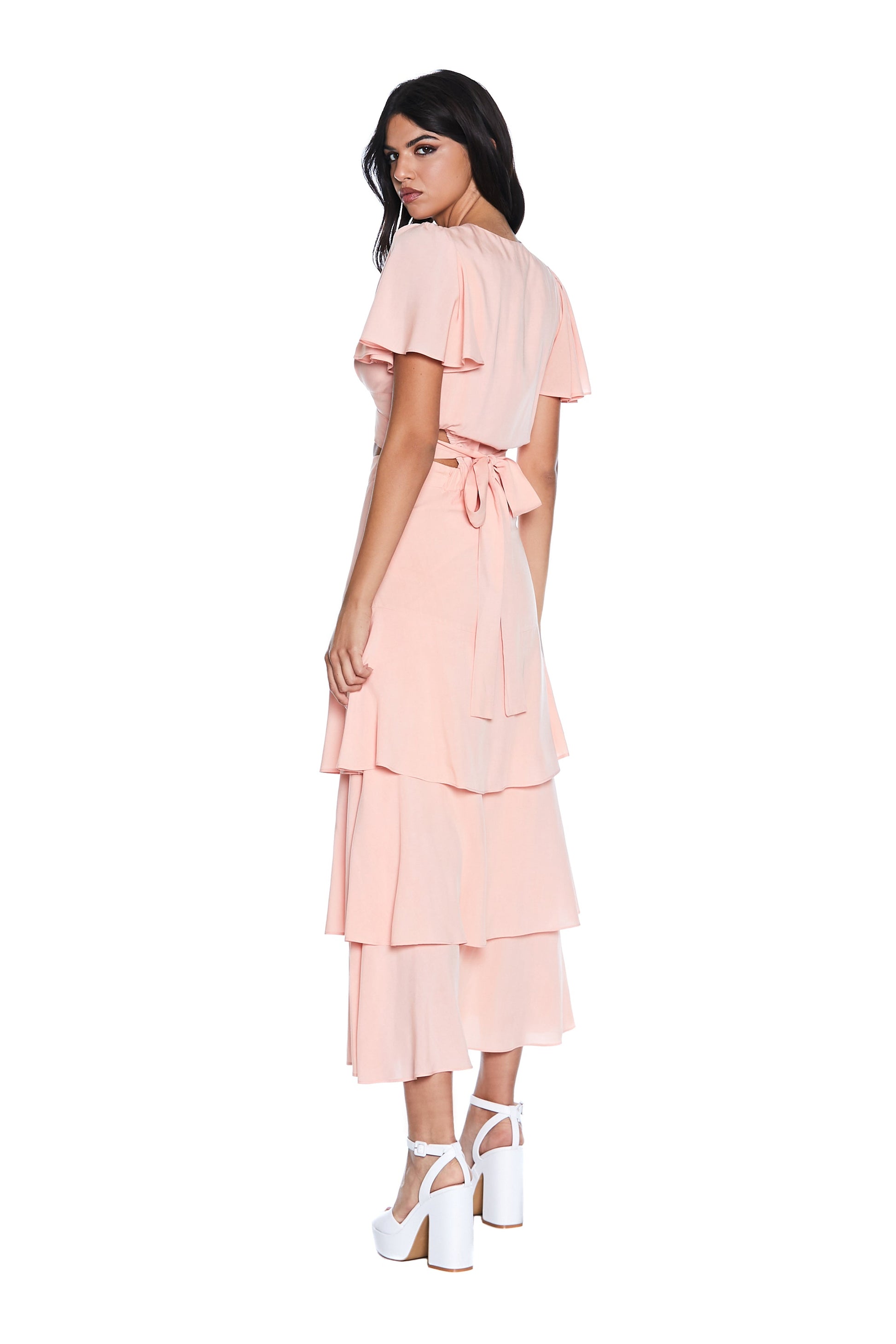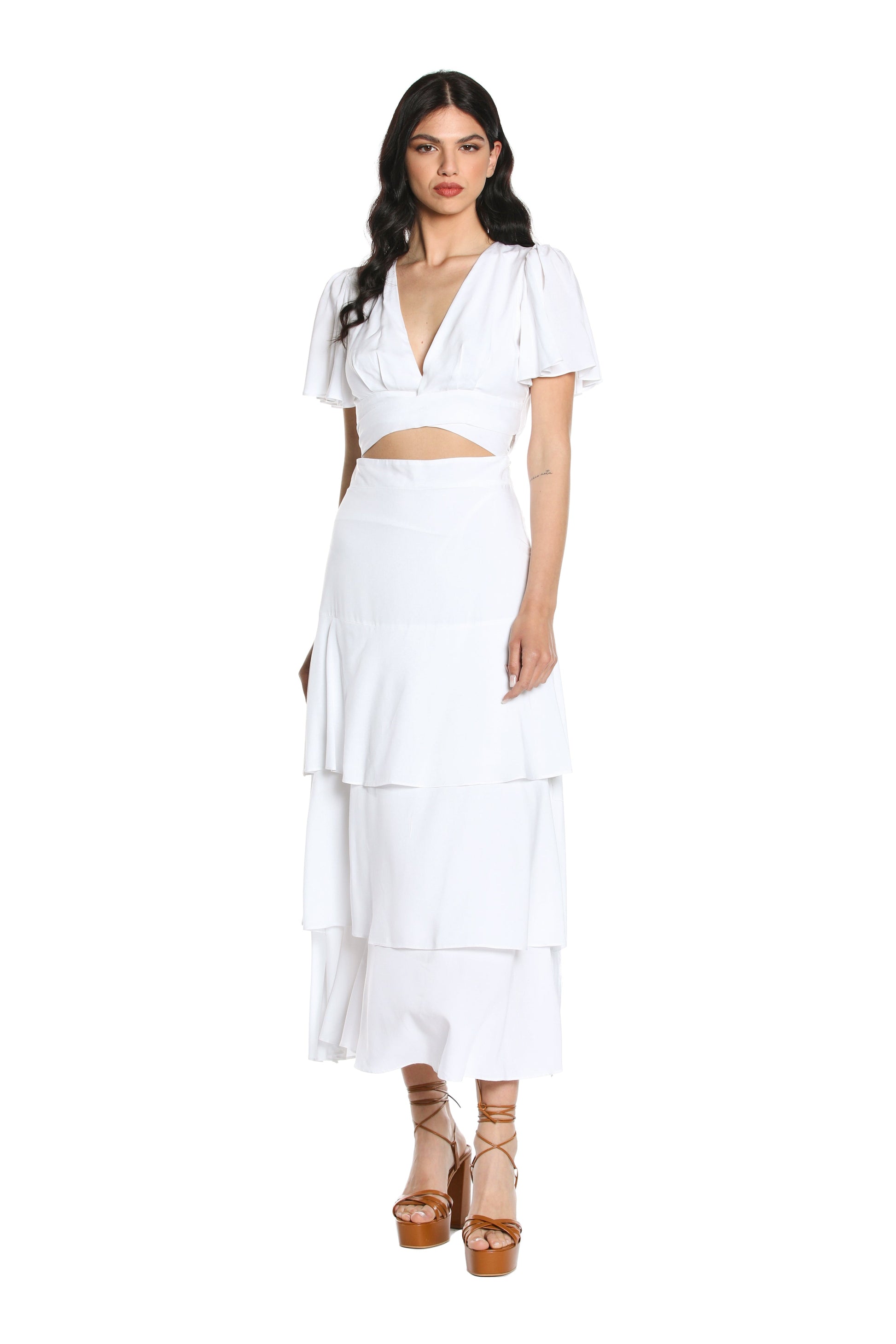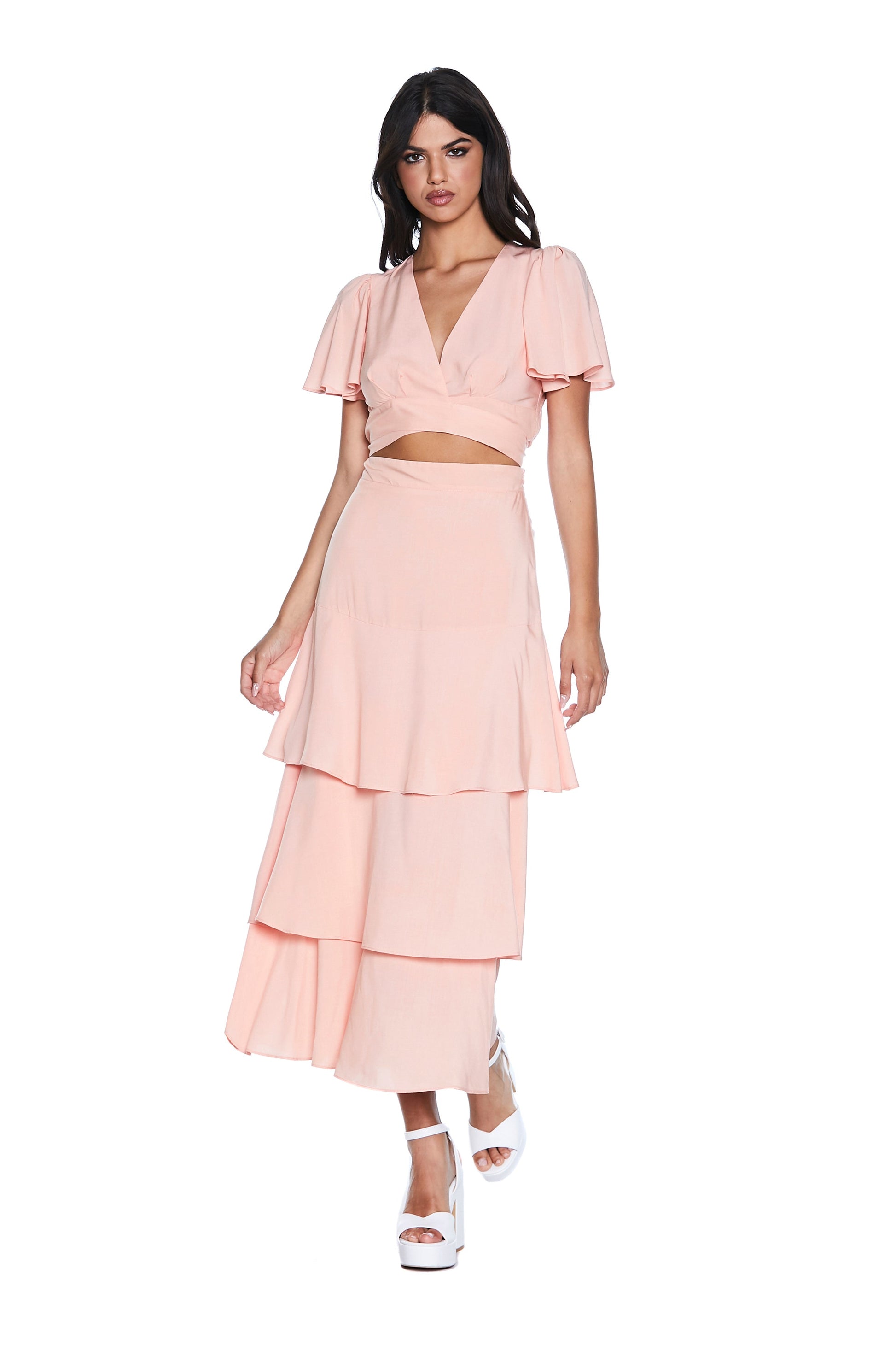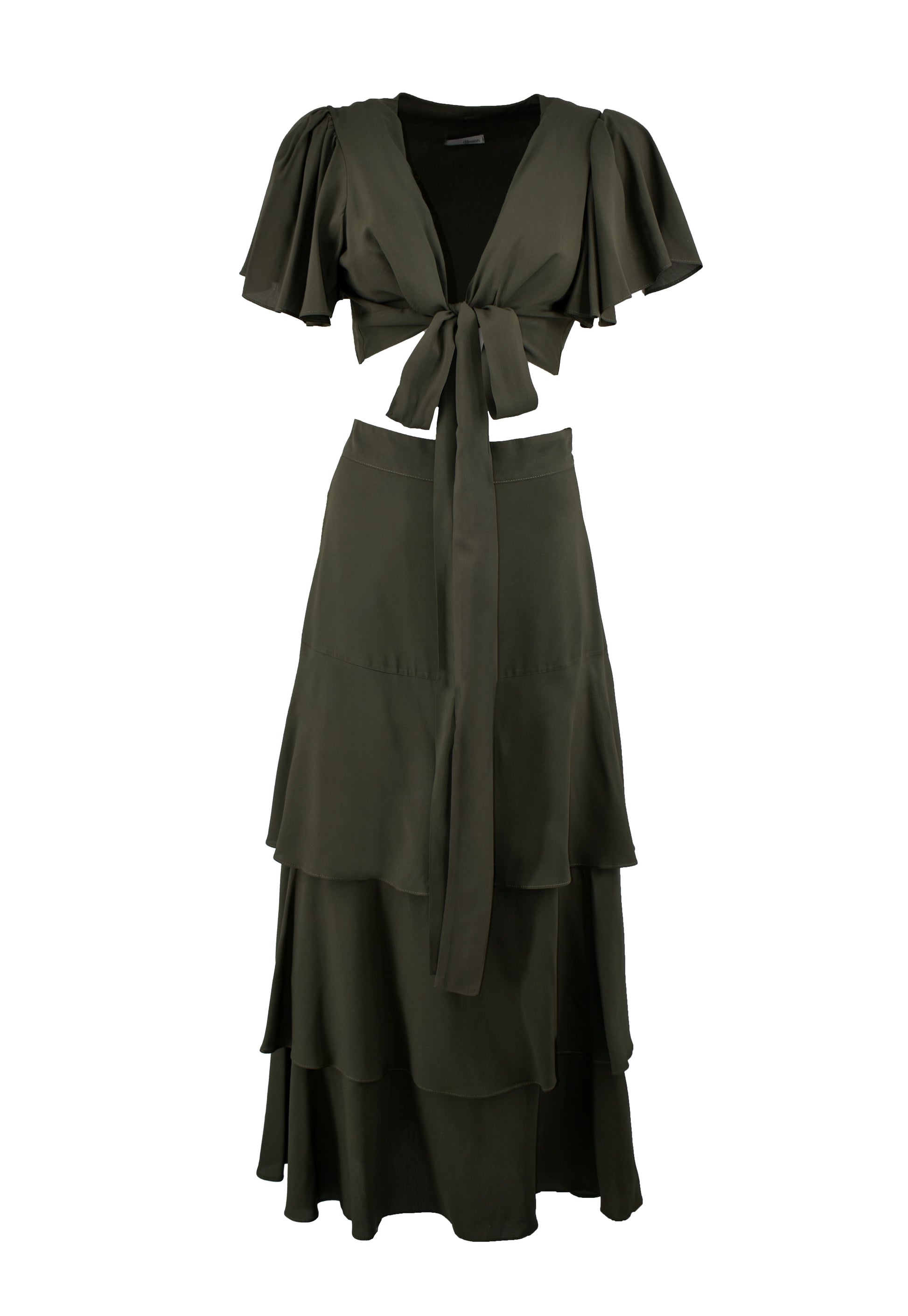 SBAM 长款半袖晚礼服交叉上衣配腰带加荷叶边裙