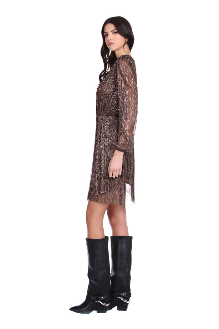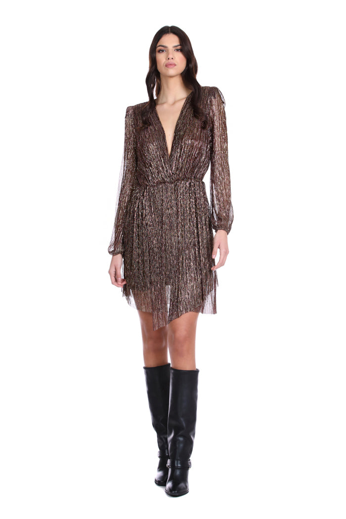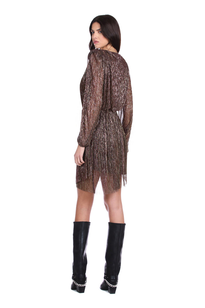STUDSA 短款长袖交叉领口褶皱卢勒克斯卷边连衣裙