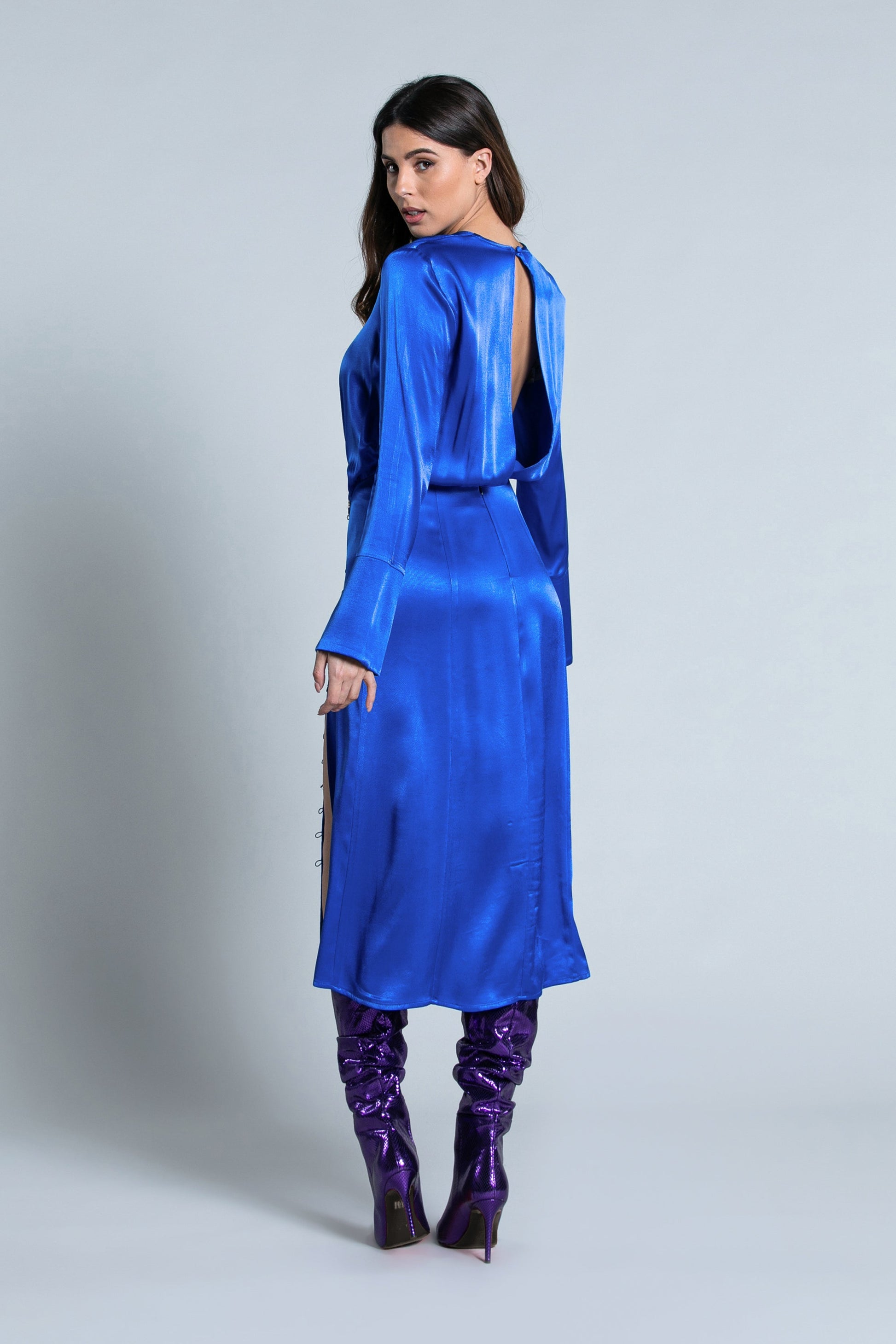 TITANUM 长袖中长连衣裙,十字交叉加后背带假纽扣。更多差距