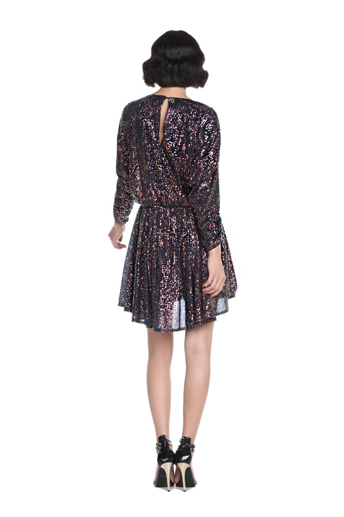 TONKS 短款 3/4 蝙蝠袖连衣裙,带多色全亮片卷发