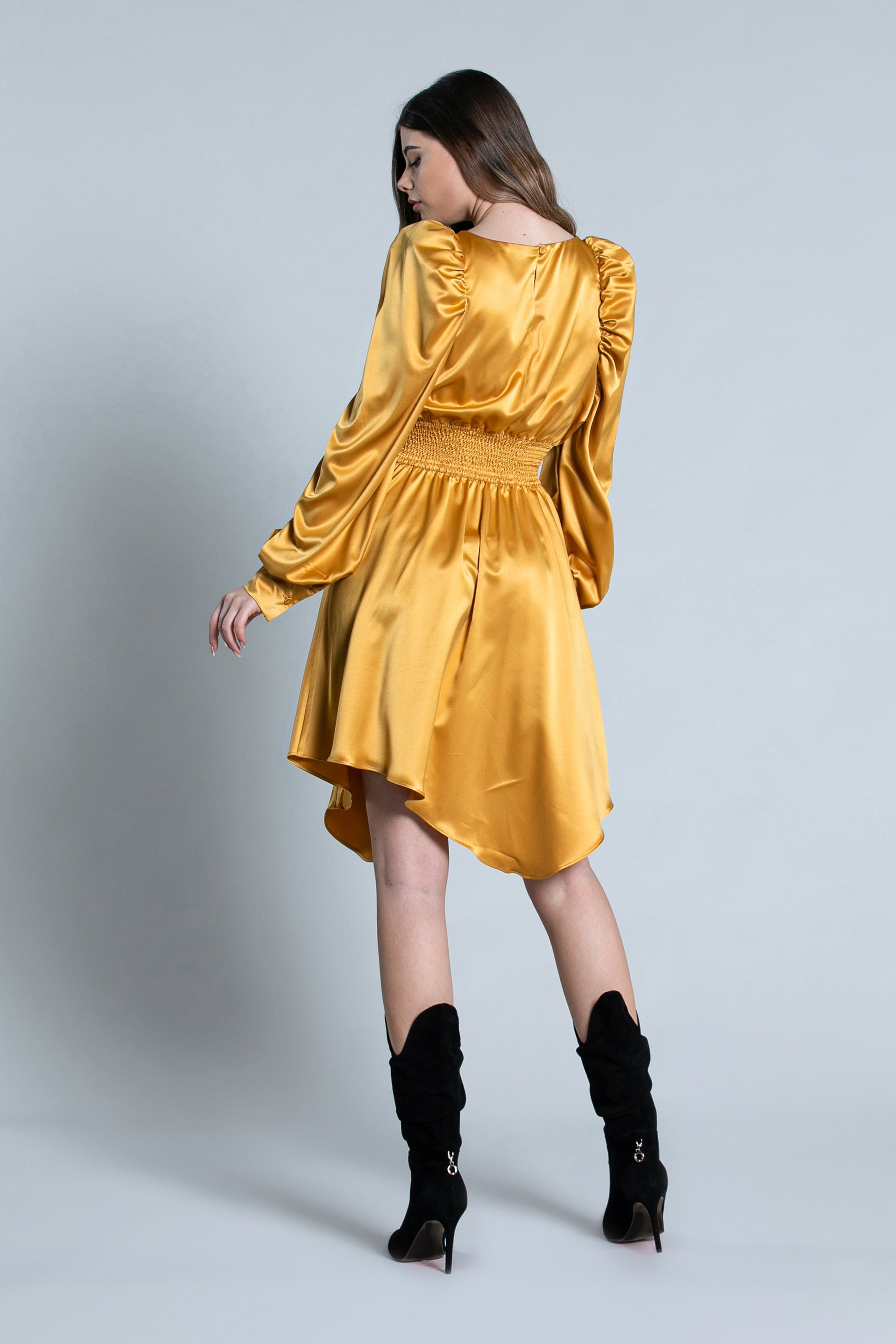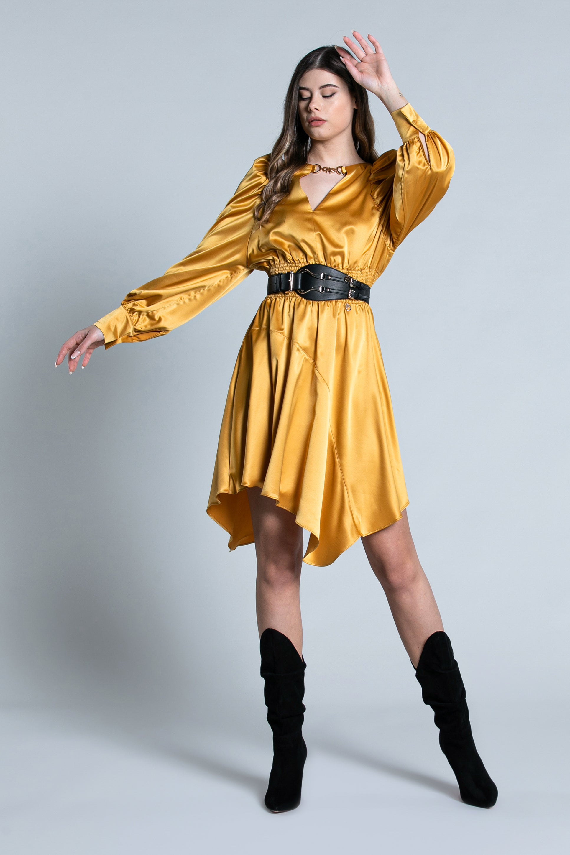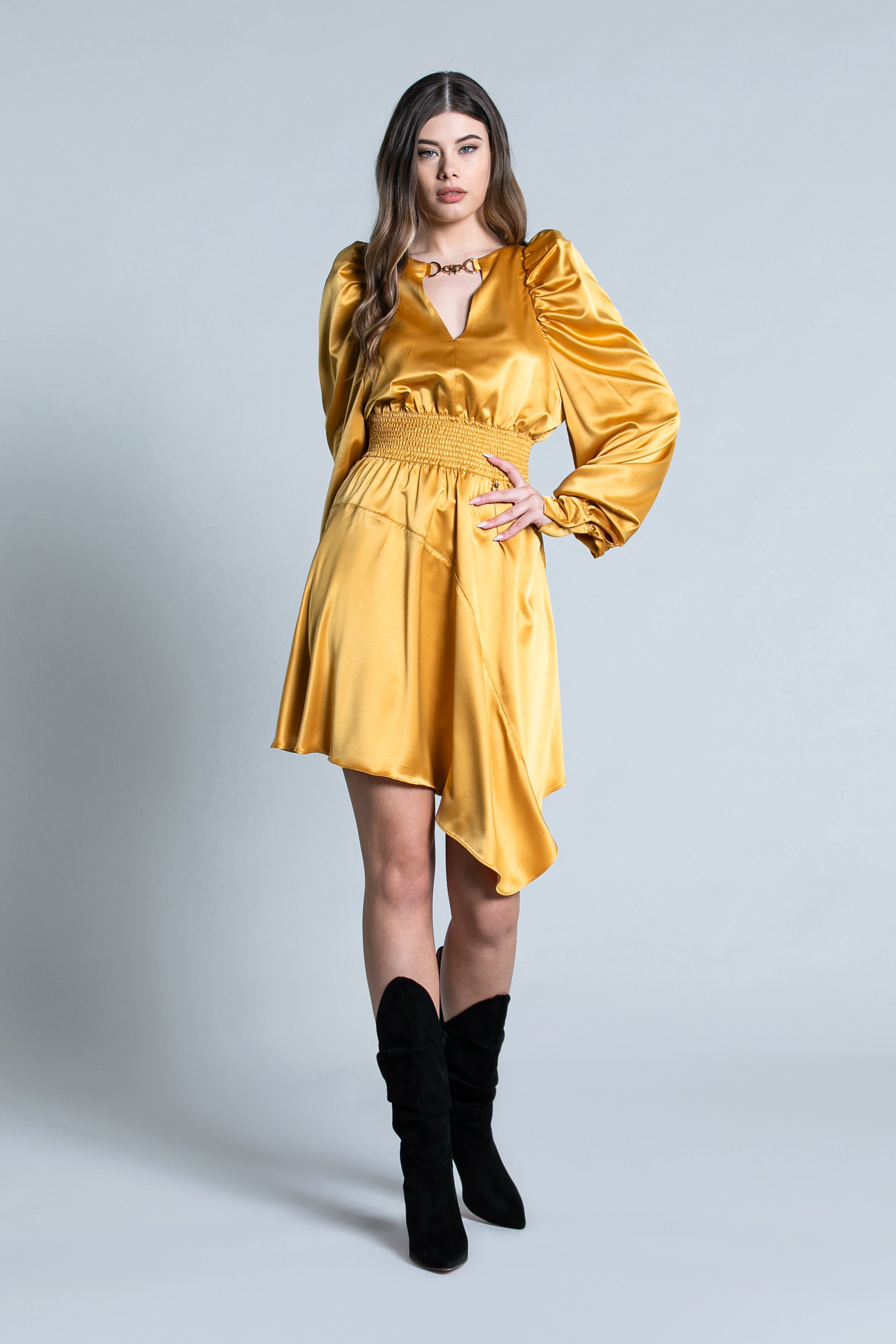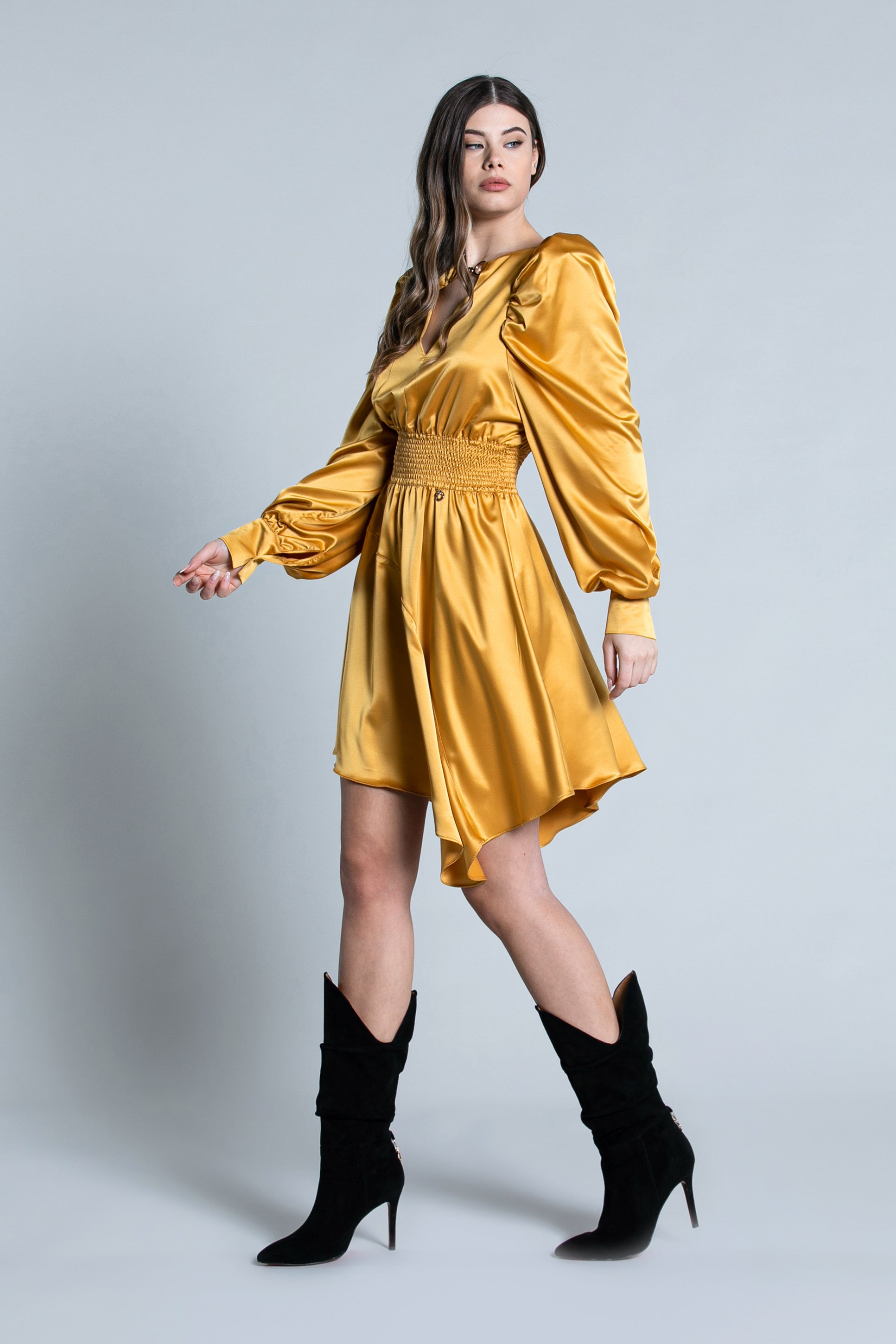 WIN 短款长袖气球领口垂坠加搭扣收腰烟点连衣裙