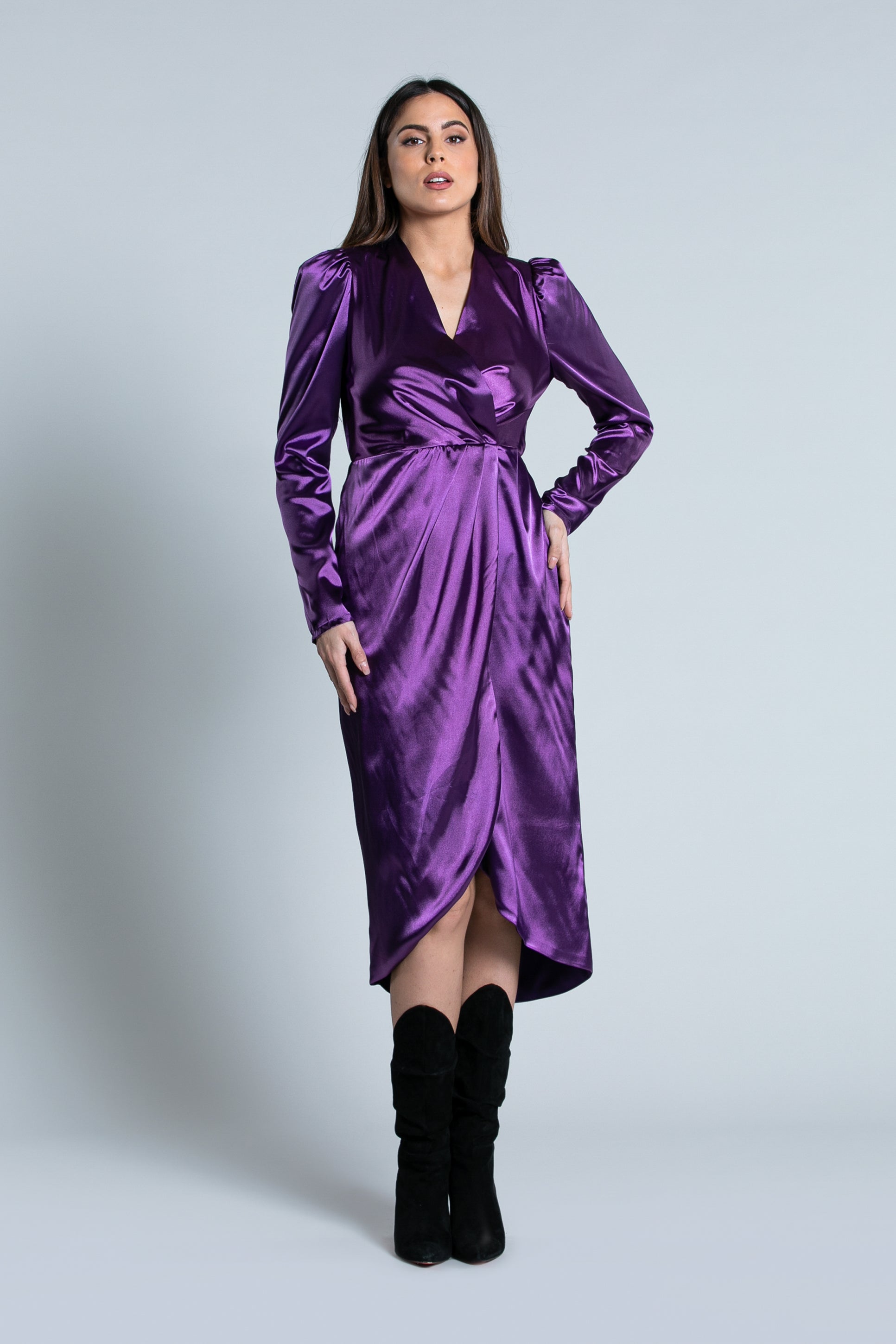 ZIN 中长连衣裙长袖领口加交叉裙子加收腰