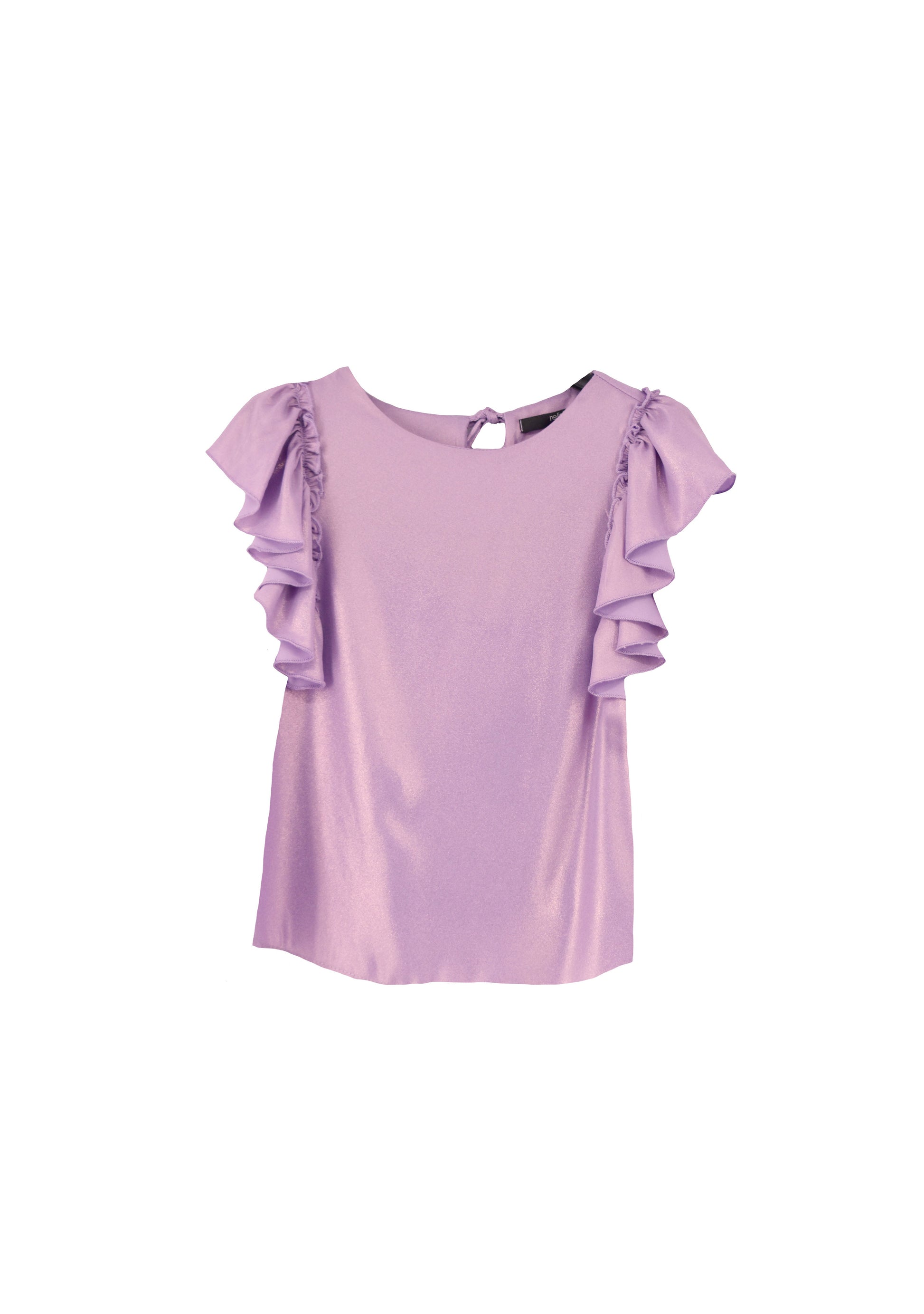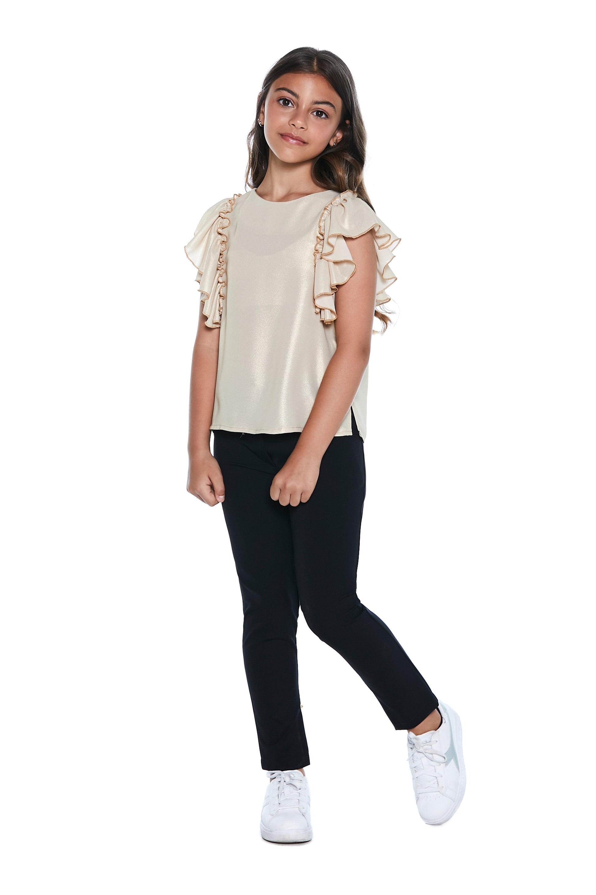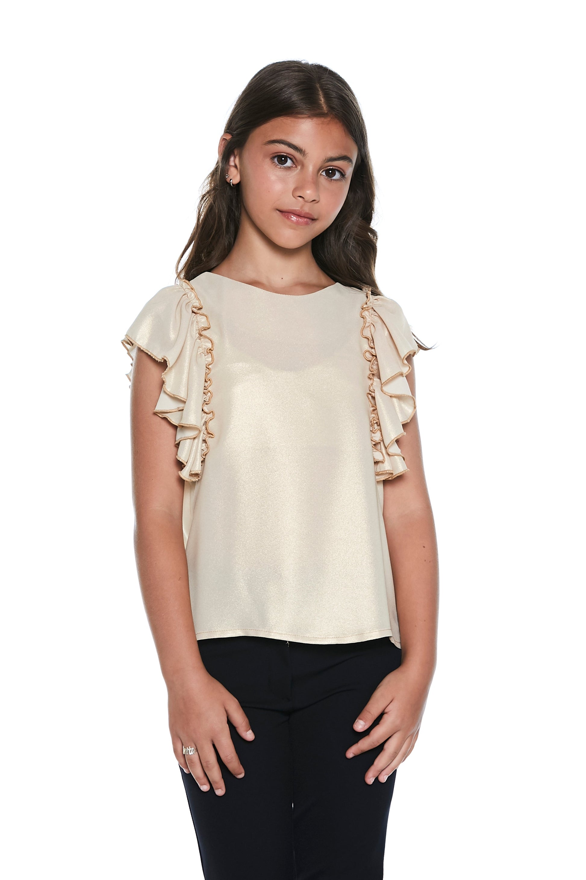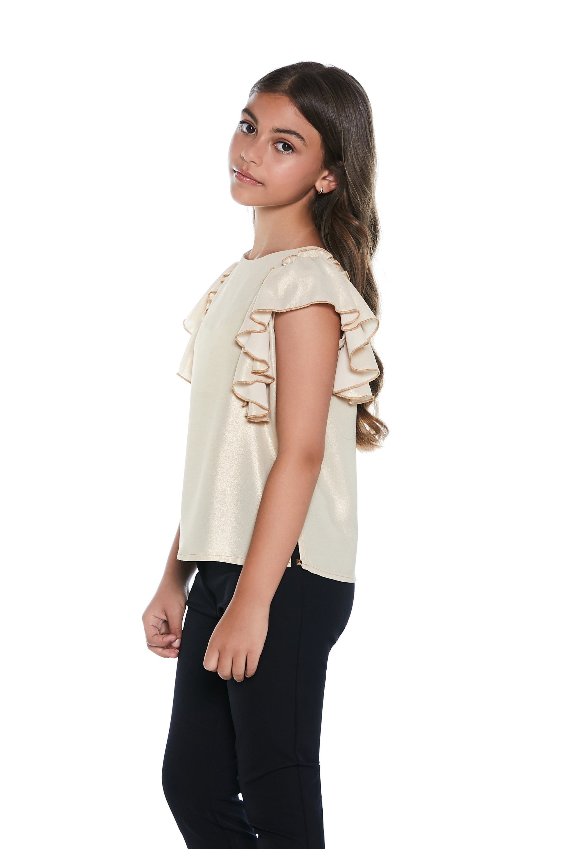 金色半袖荷叶边衬衫,涂层乔其纱背后有蝴蝶结