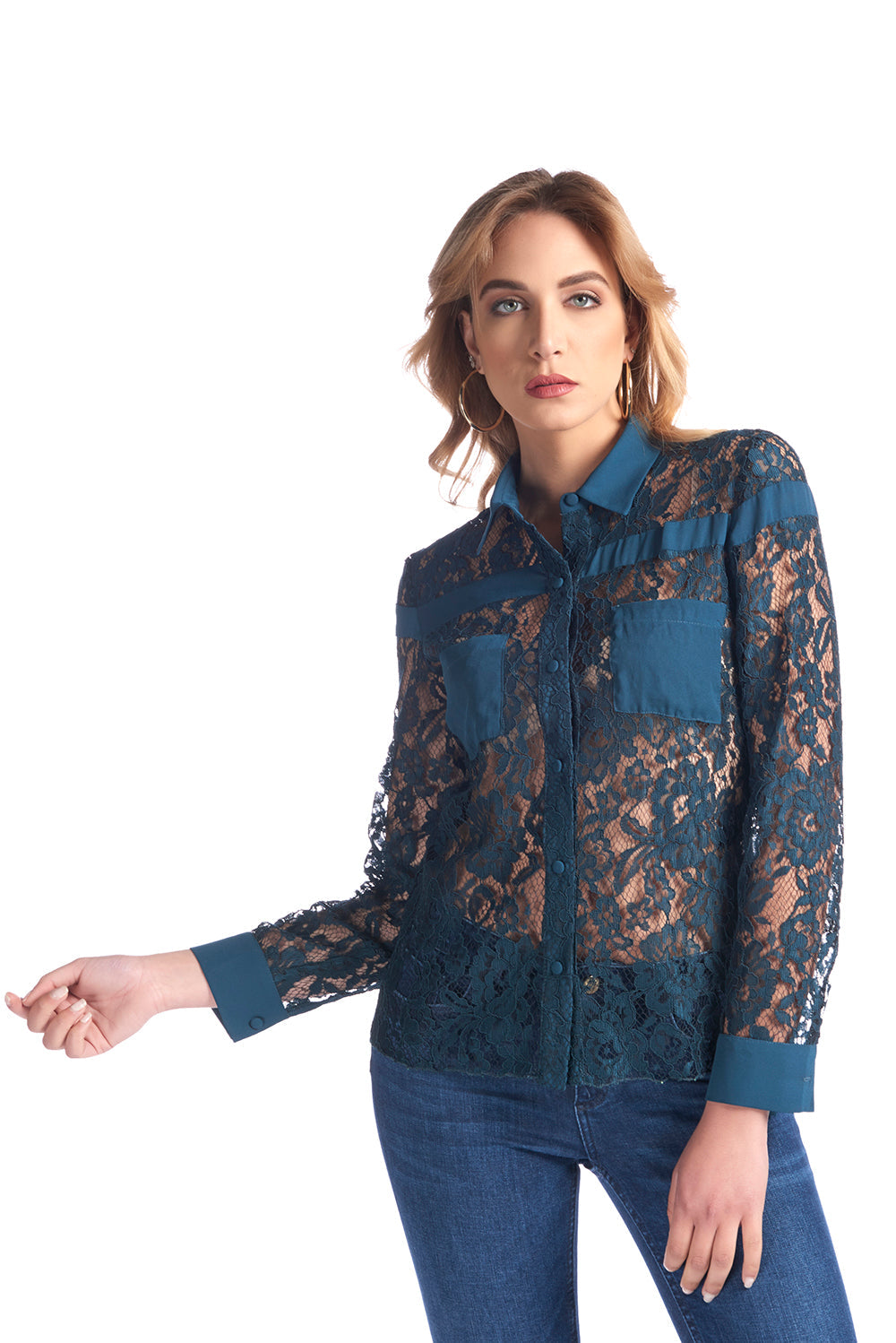 ANCIOLA 全蕾丝衬衫,缎面廓形和乔其纱口袋