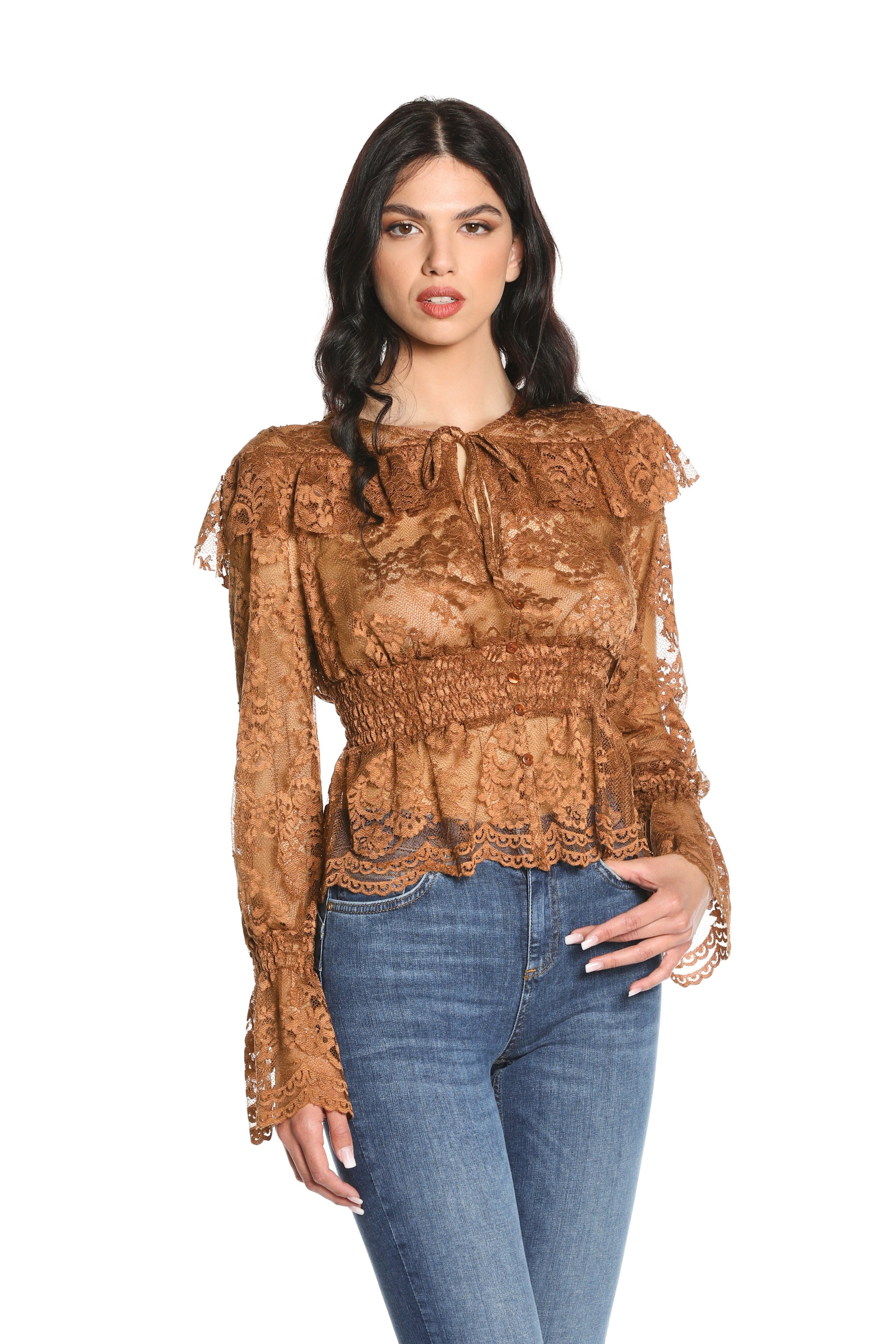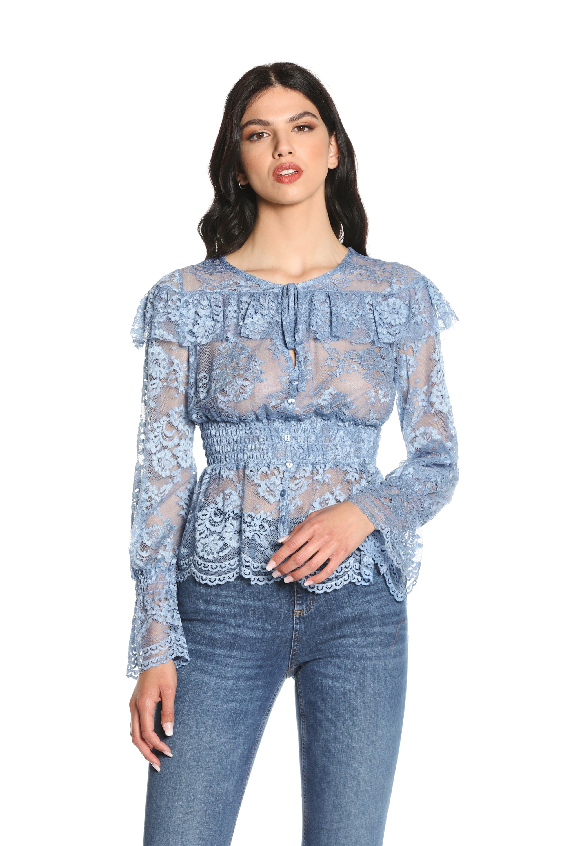 RAFFIS 蕾丝加 p 长袖无领衬衫。抽褶蕾丝