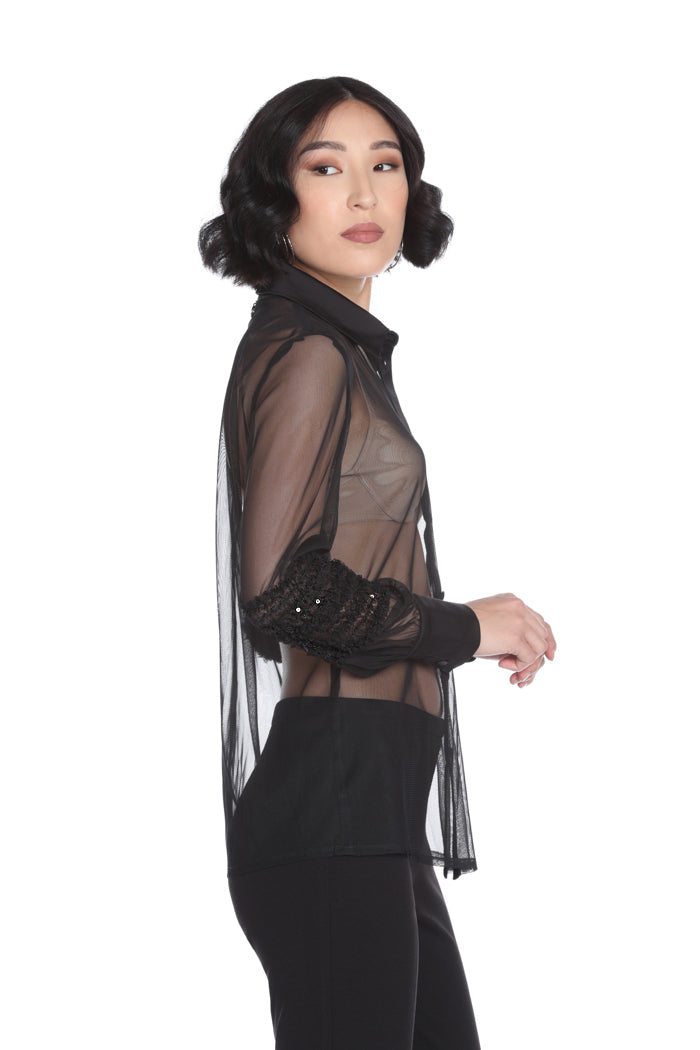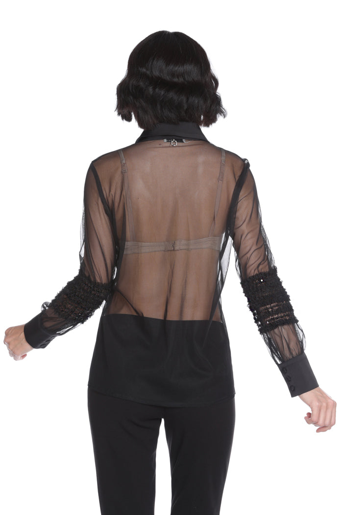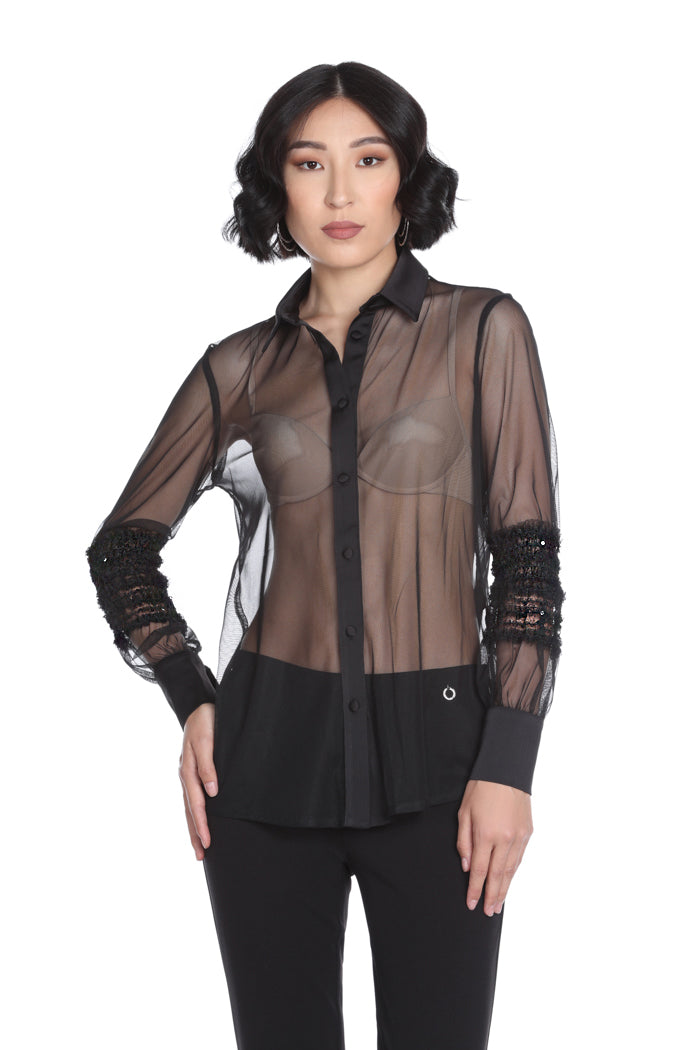 ROSTERA 衬衫长袖荷叶边加亮片边缘加纽扣缎面薄纱
