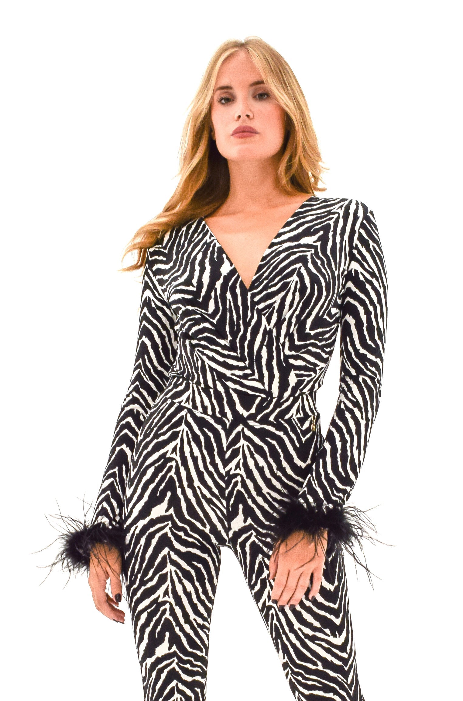 SEDUM 长袖连身V领衬衫加动物纹羽毛袖口