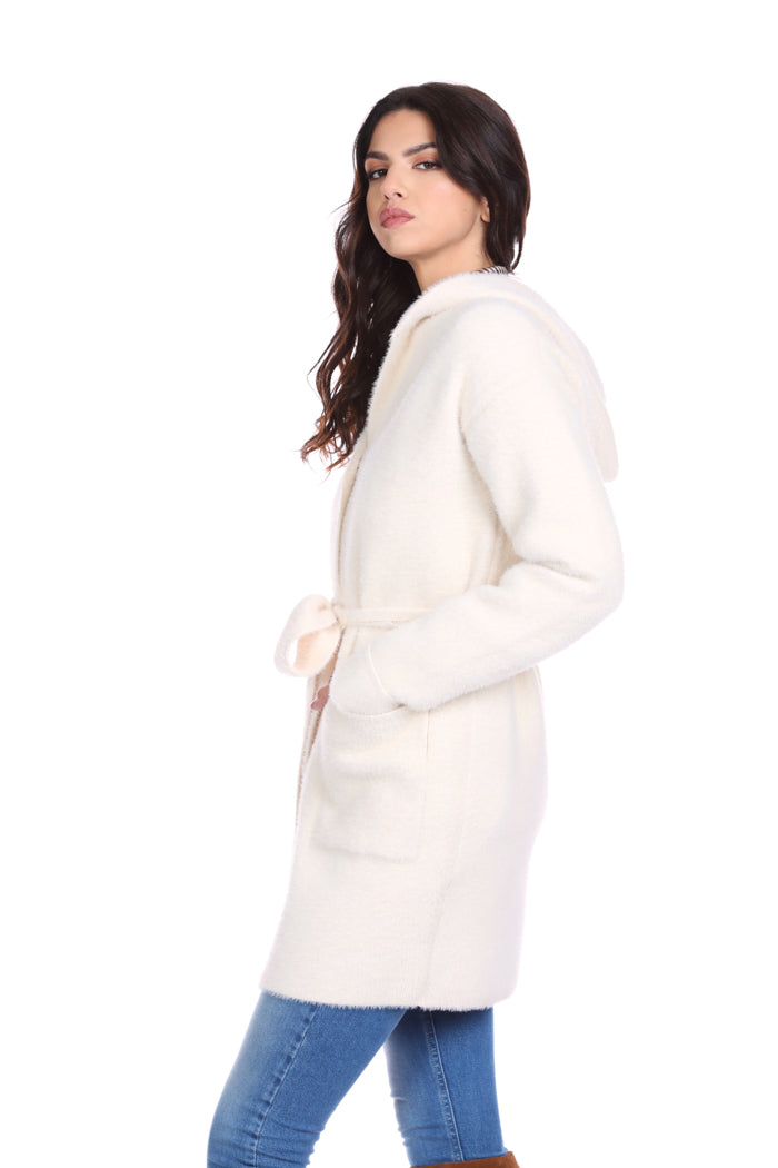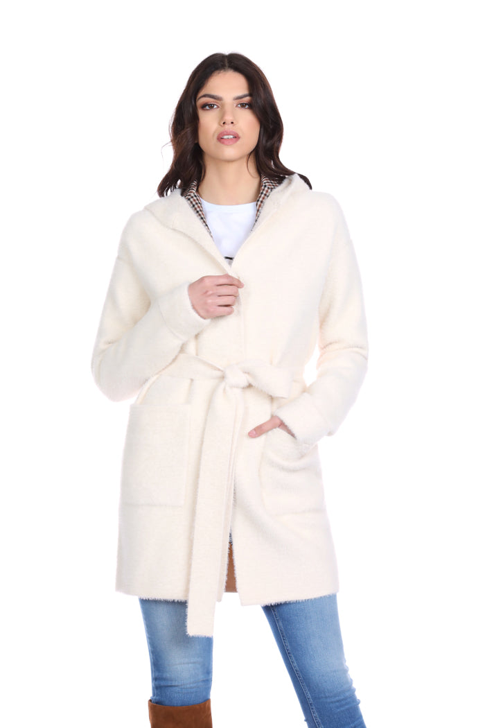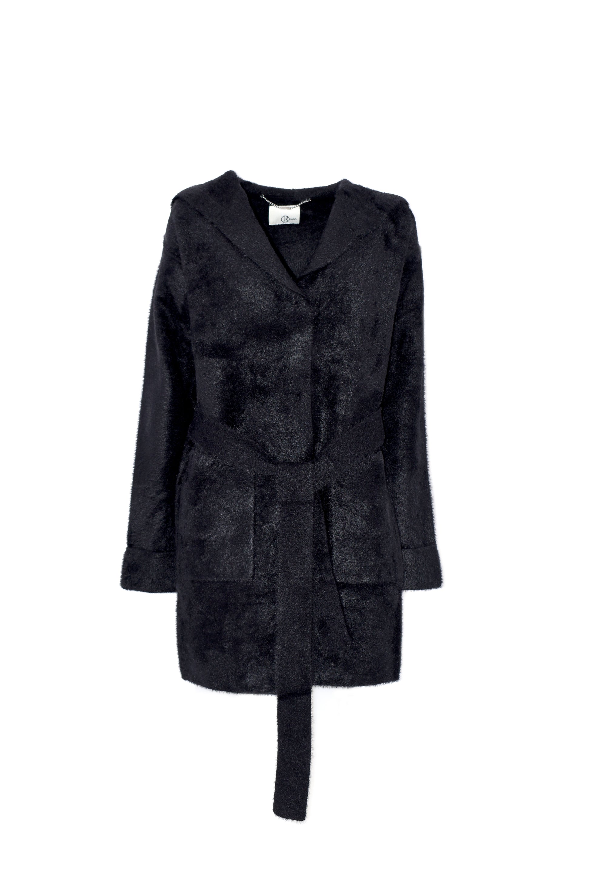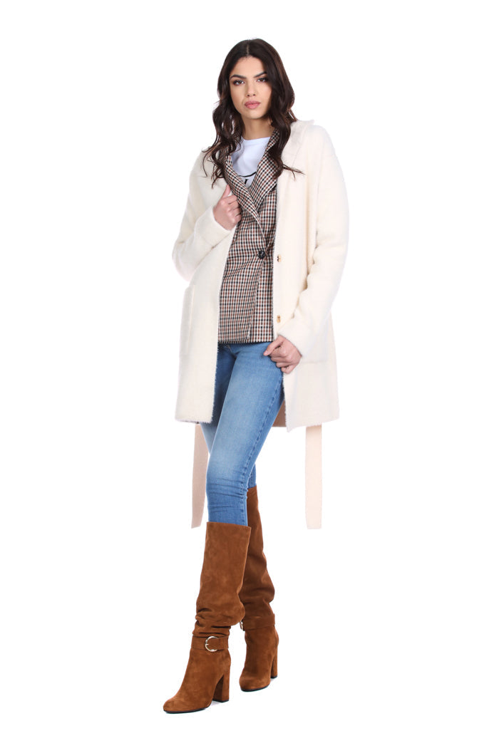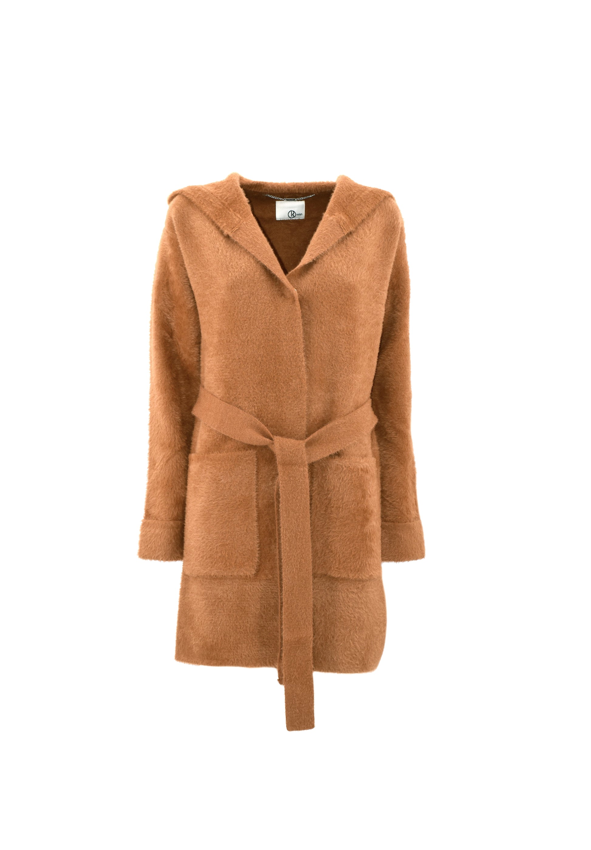 WILURDS 大衣连帽加腰带加口袋毛纱补丁