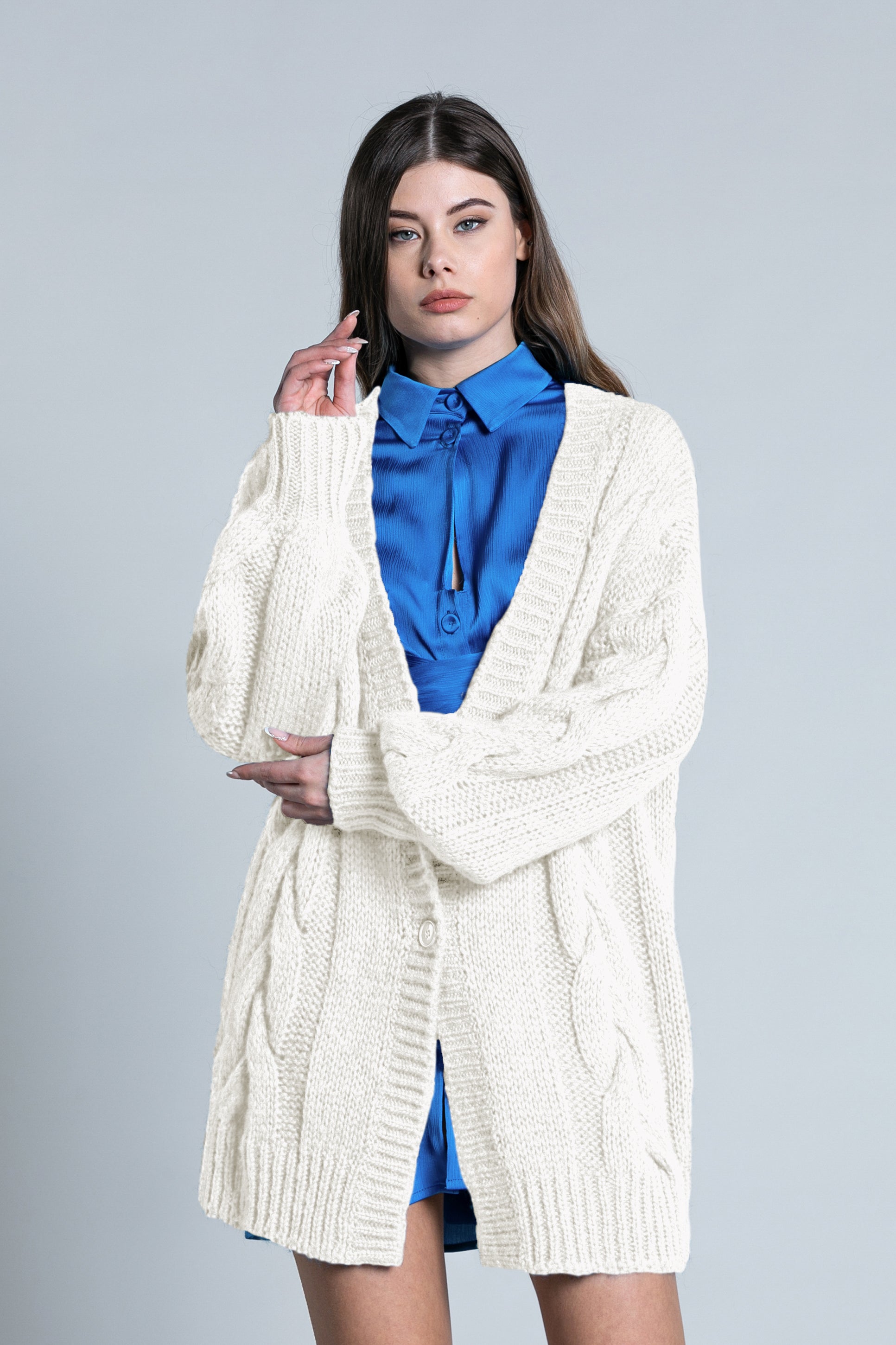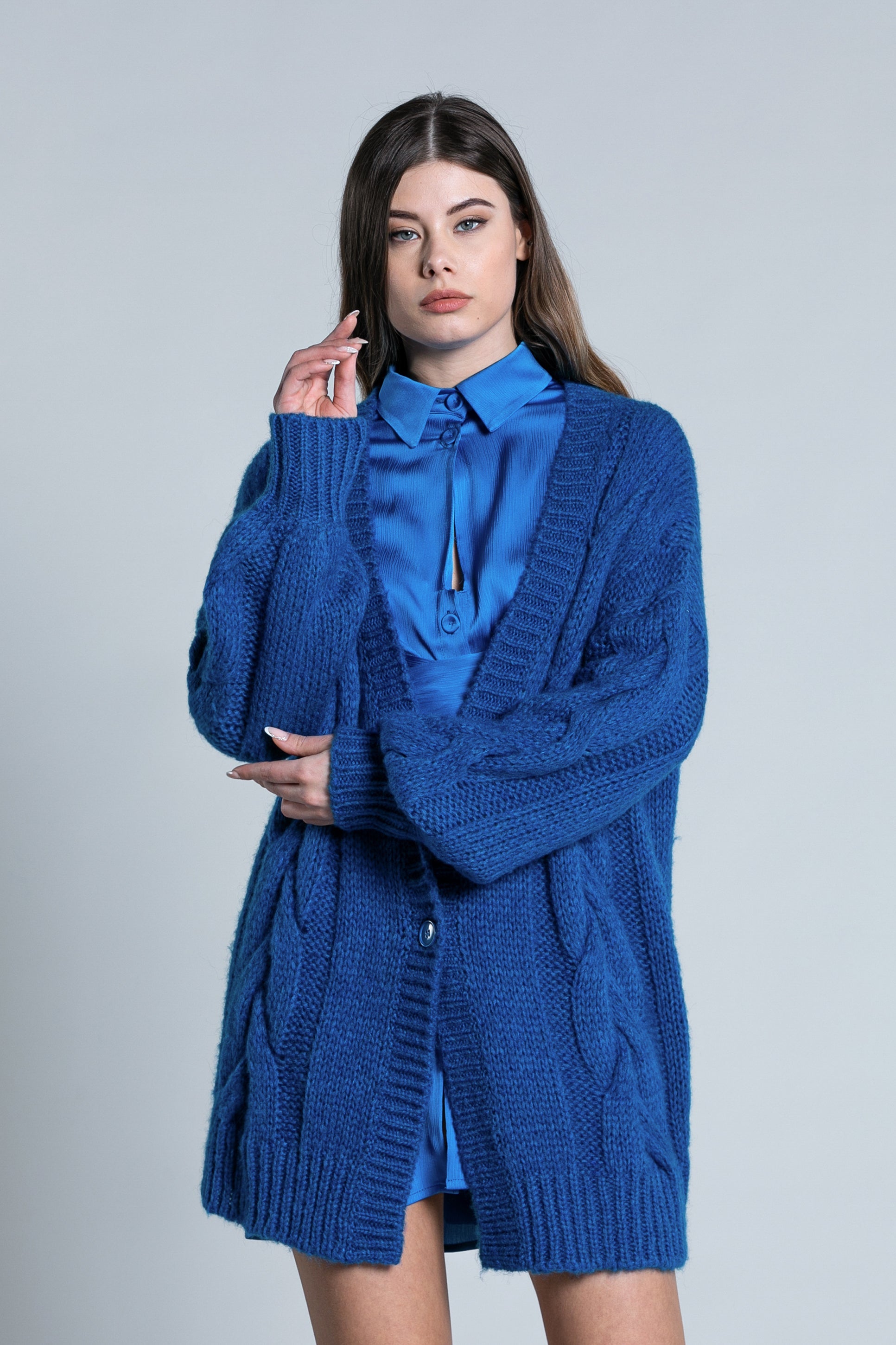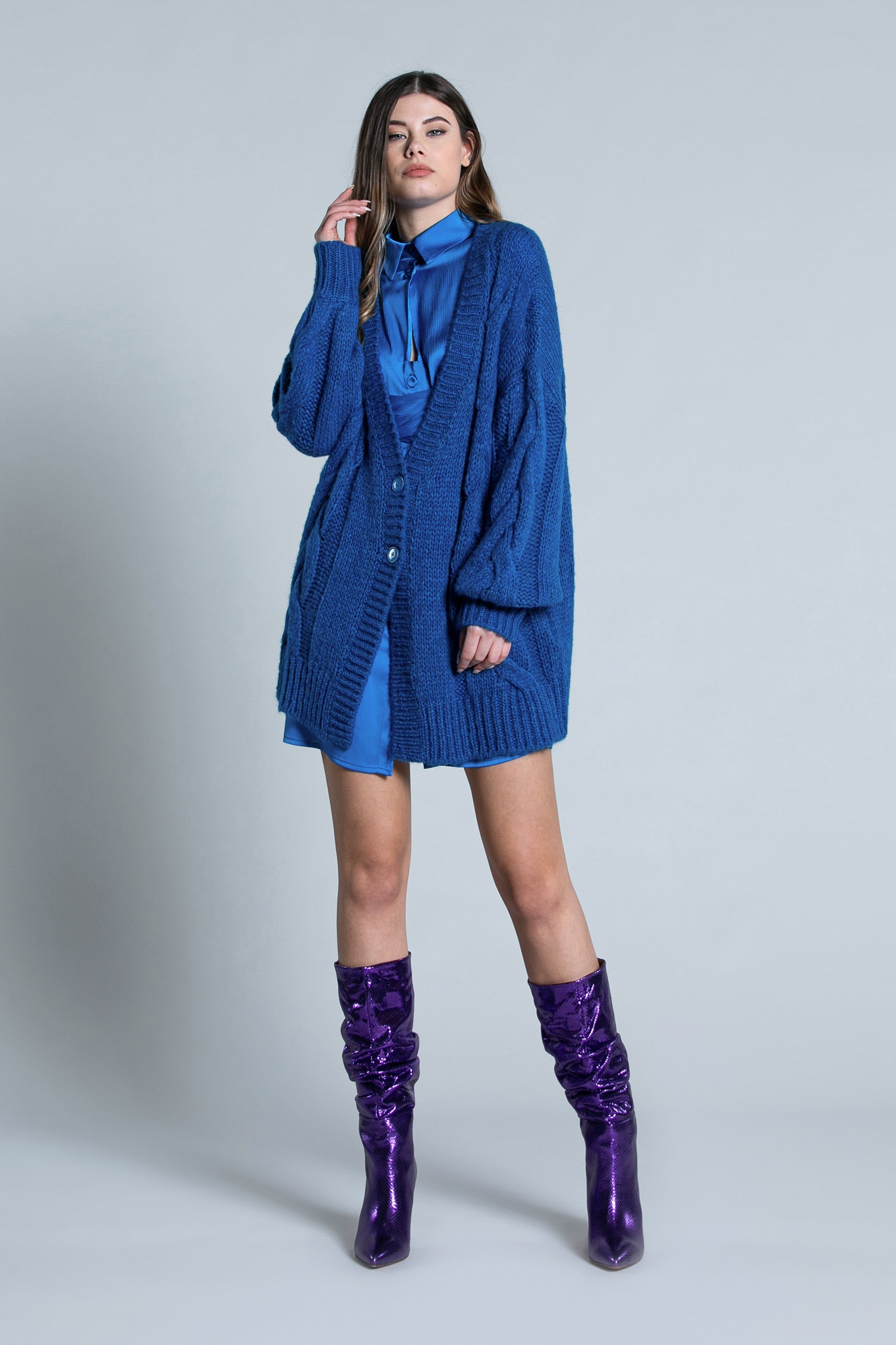 TOSHO 纽扣加编织长款气球袖开衫