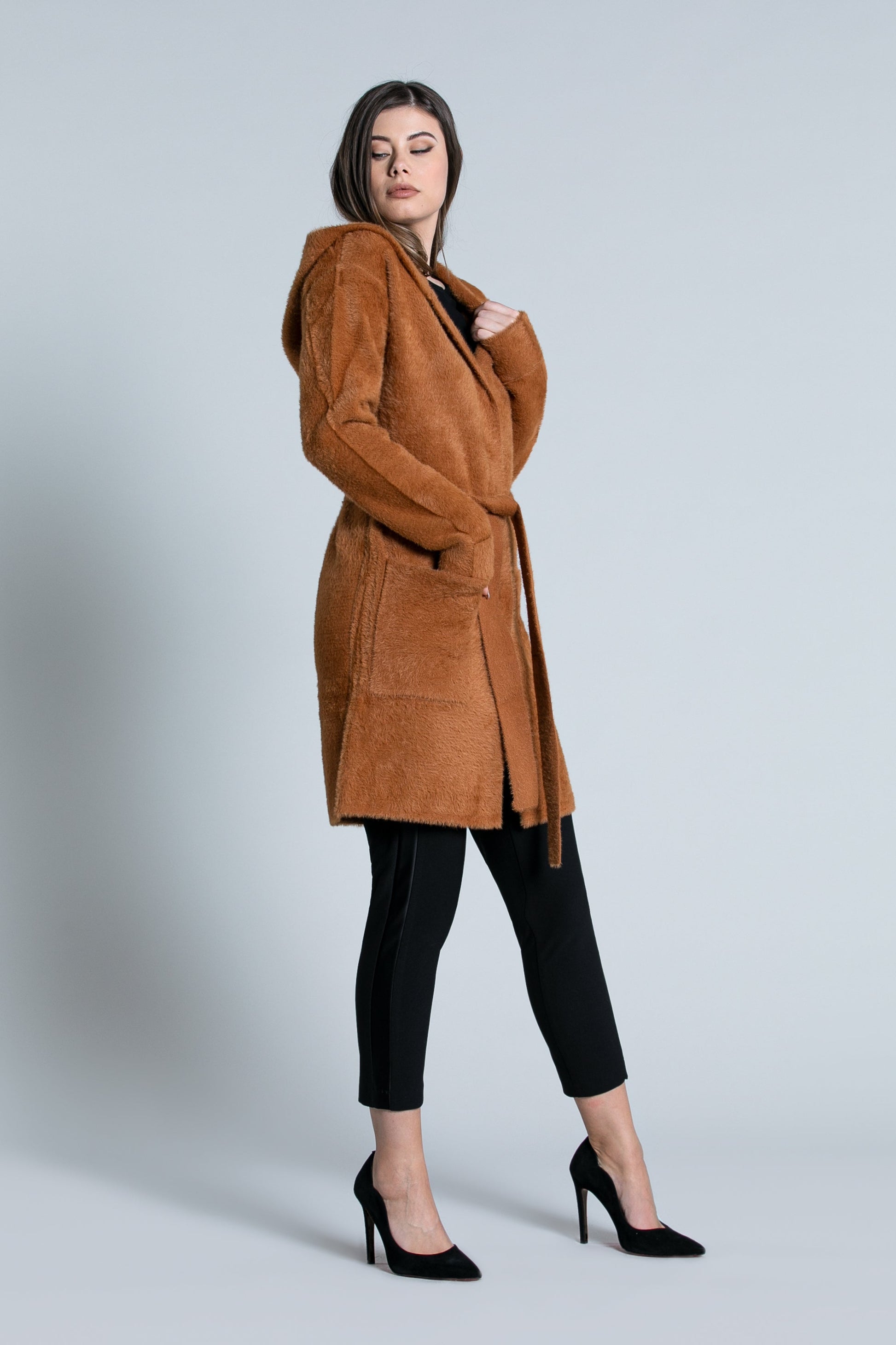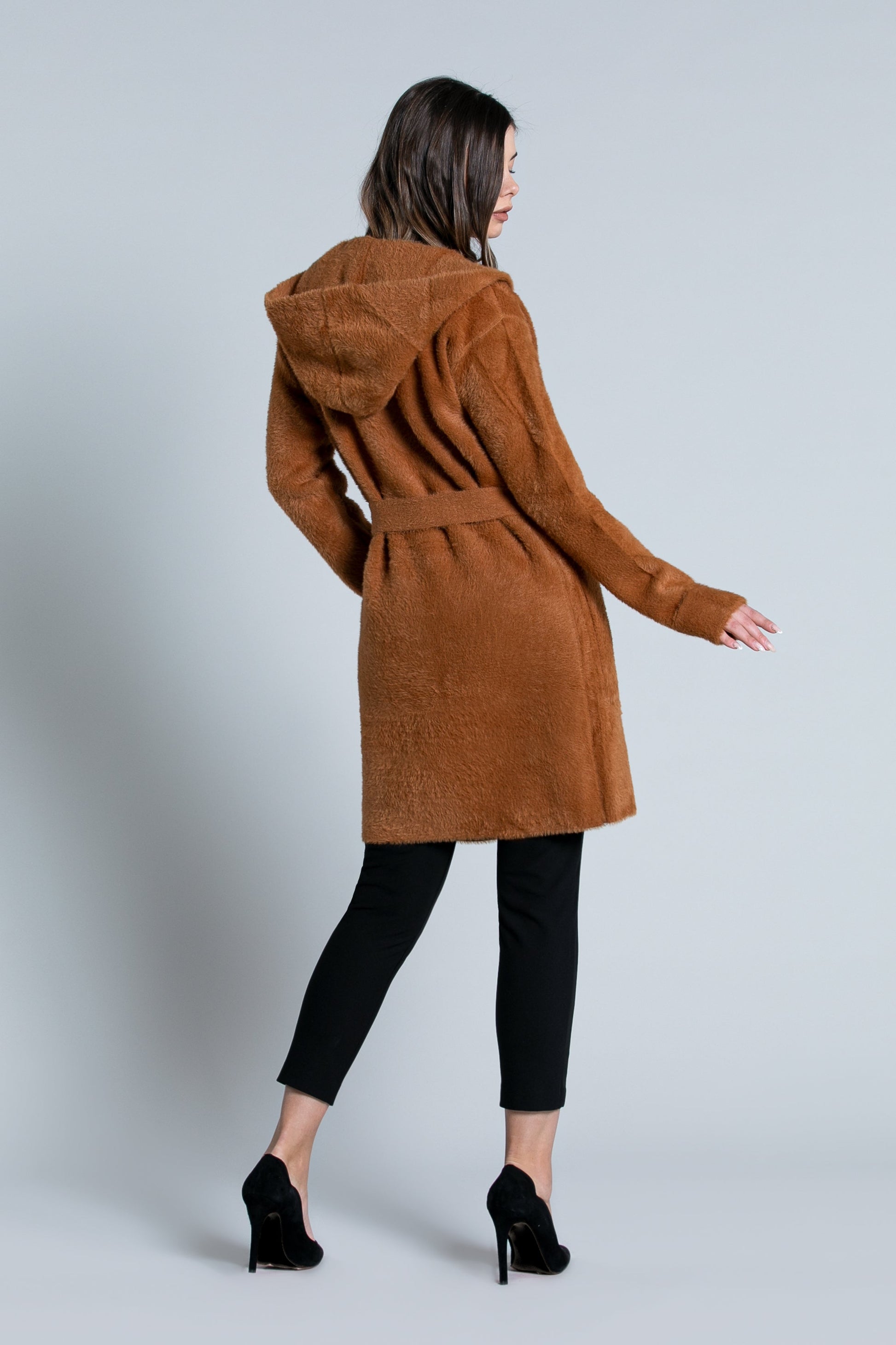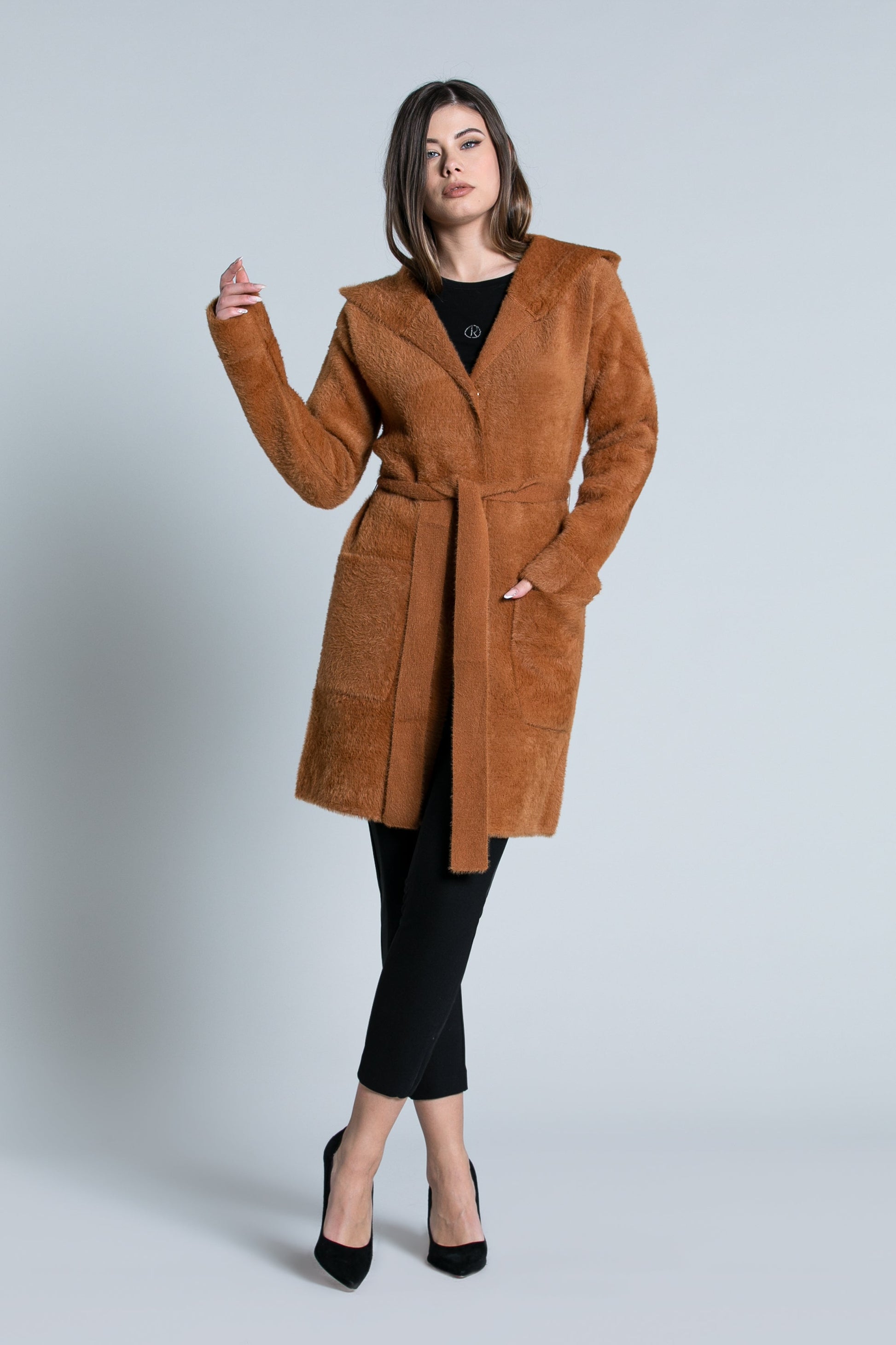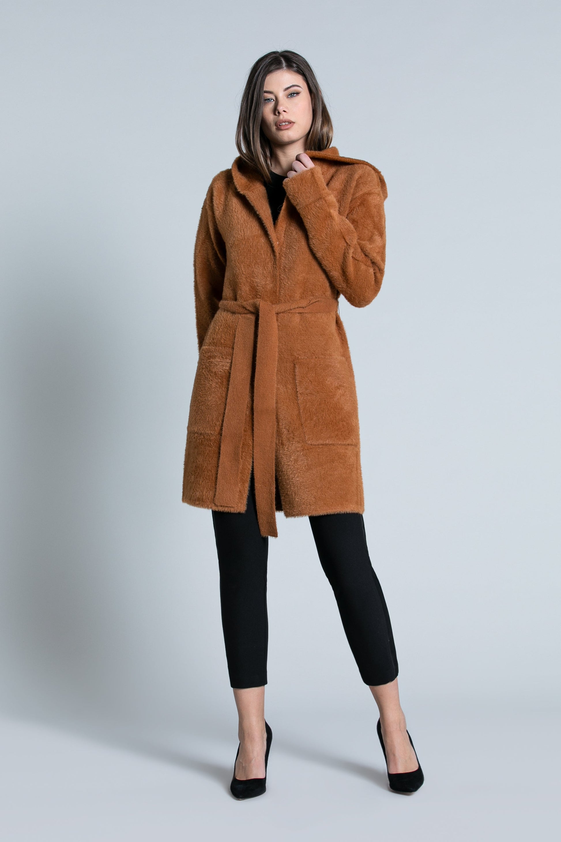 WILURDS 大衣连帽加腰带加口袋毛纱补丁