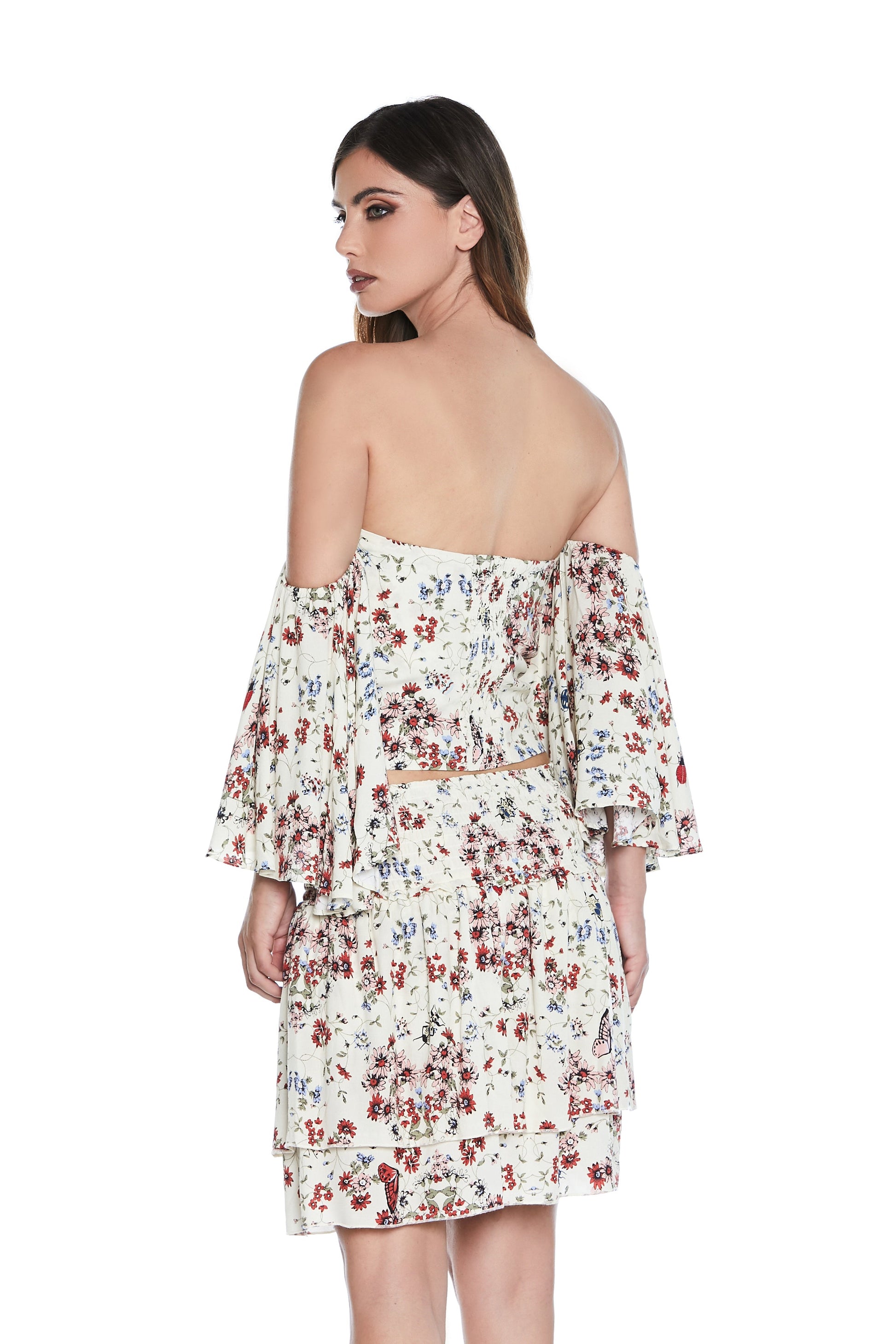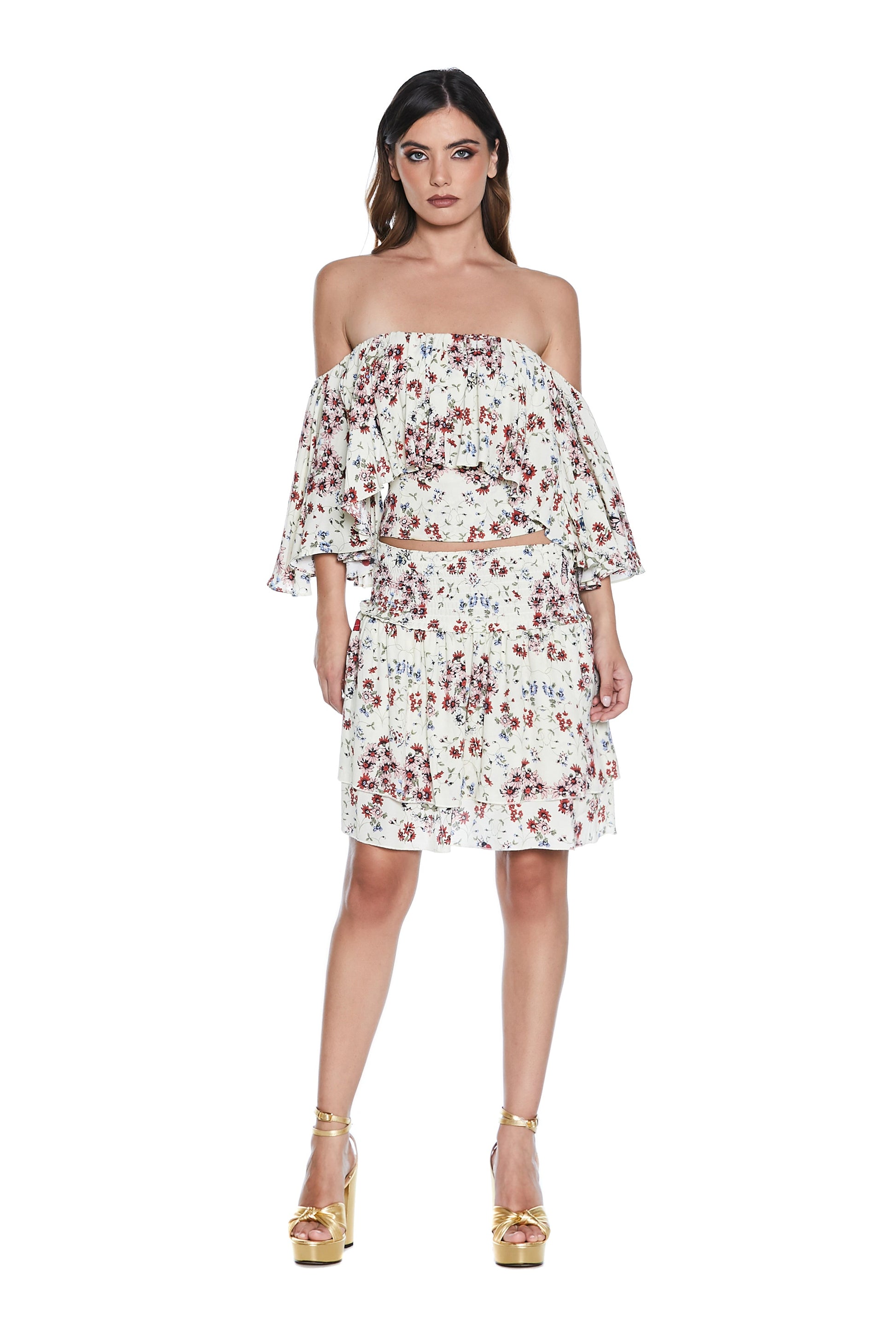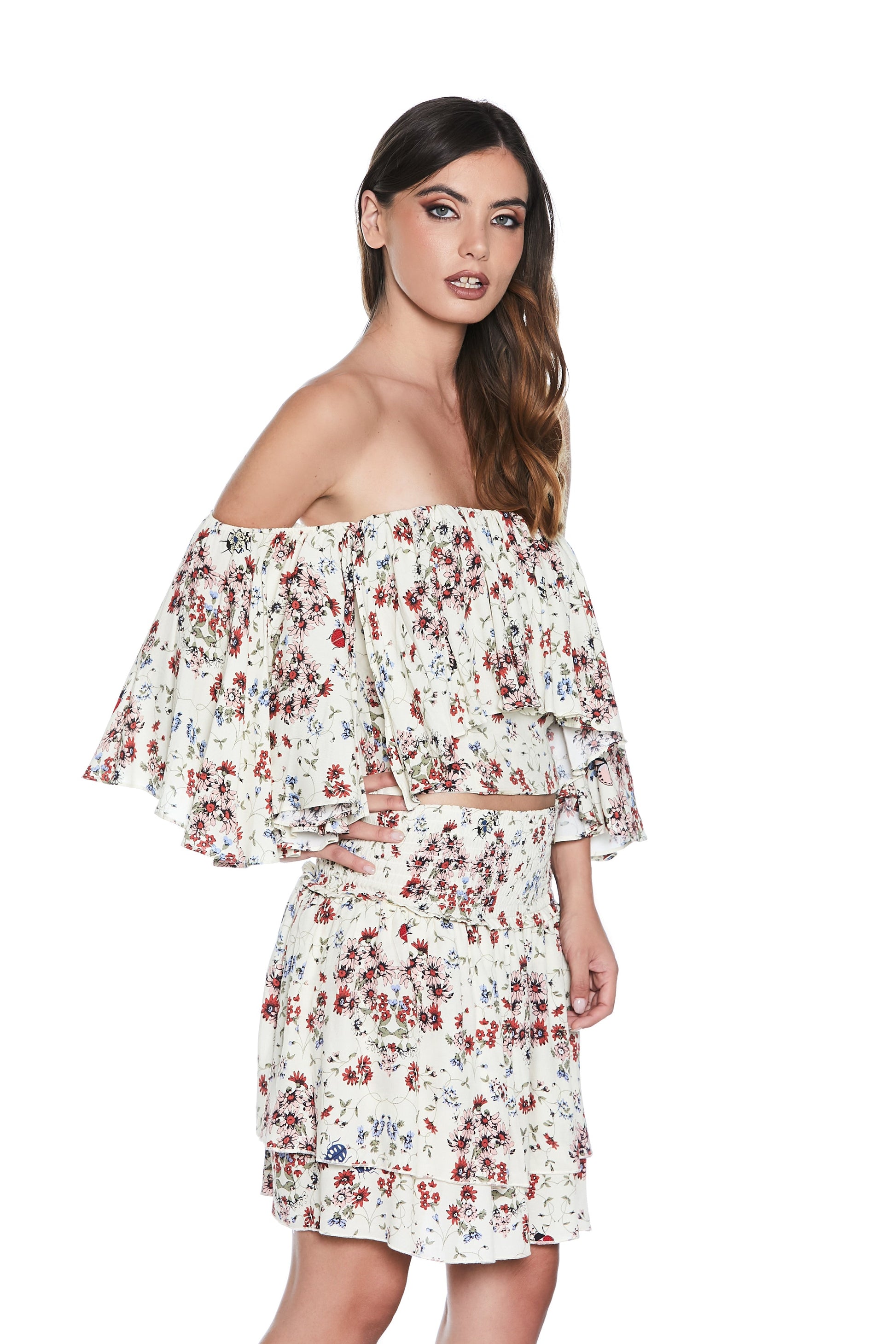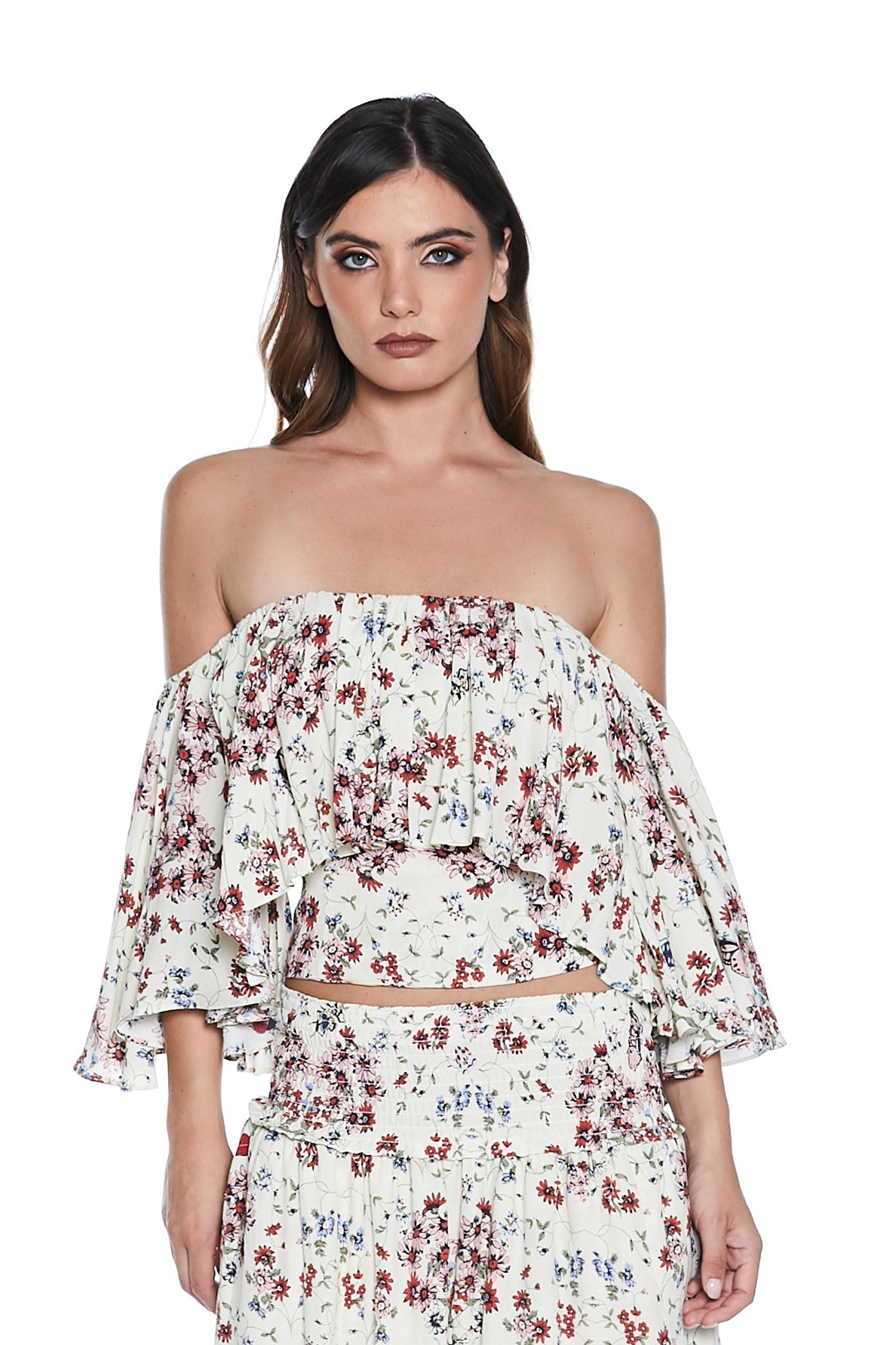 露脐上衣 OPTIUR 3/4 宽袖荷叶边加皱褶花卉图案