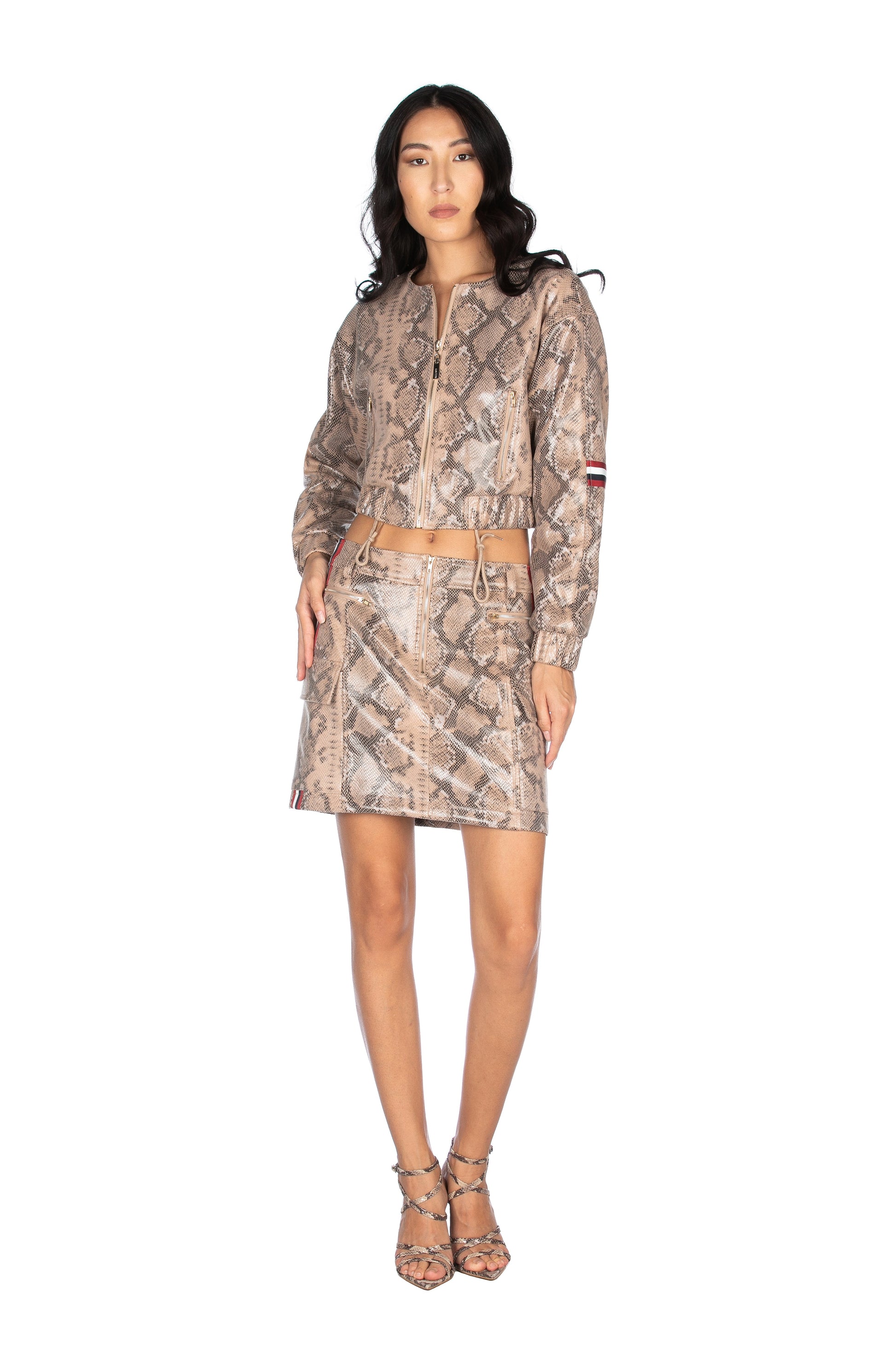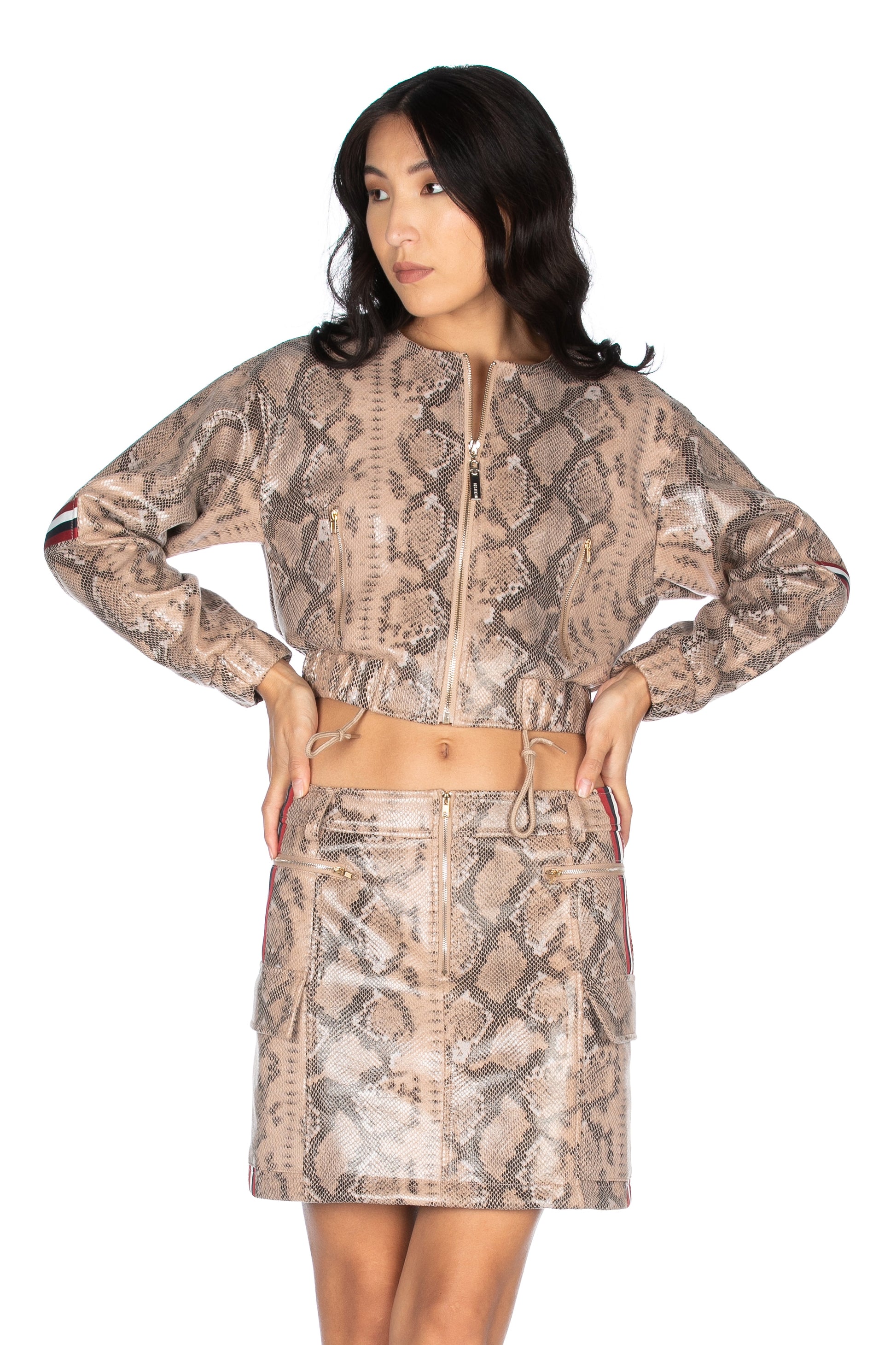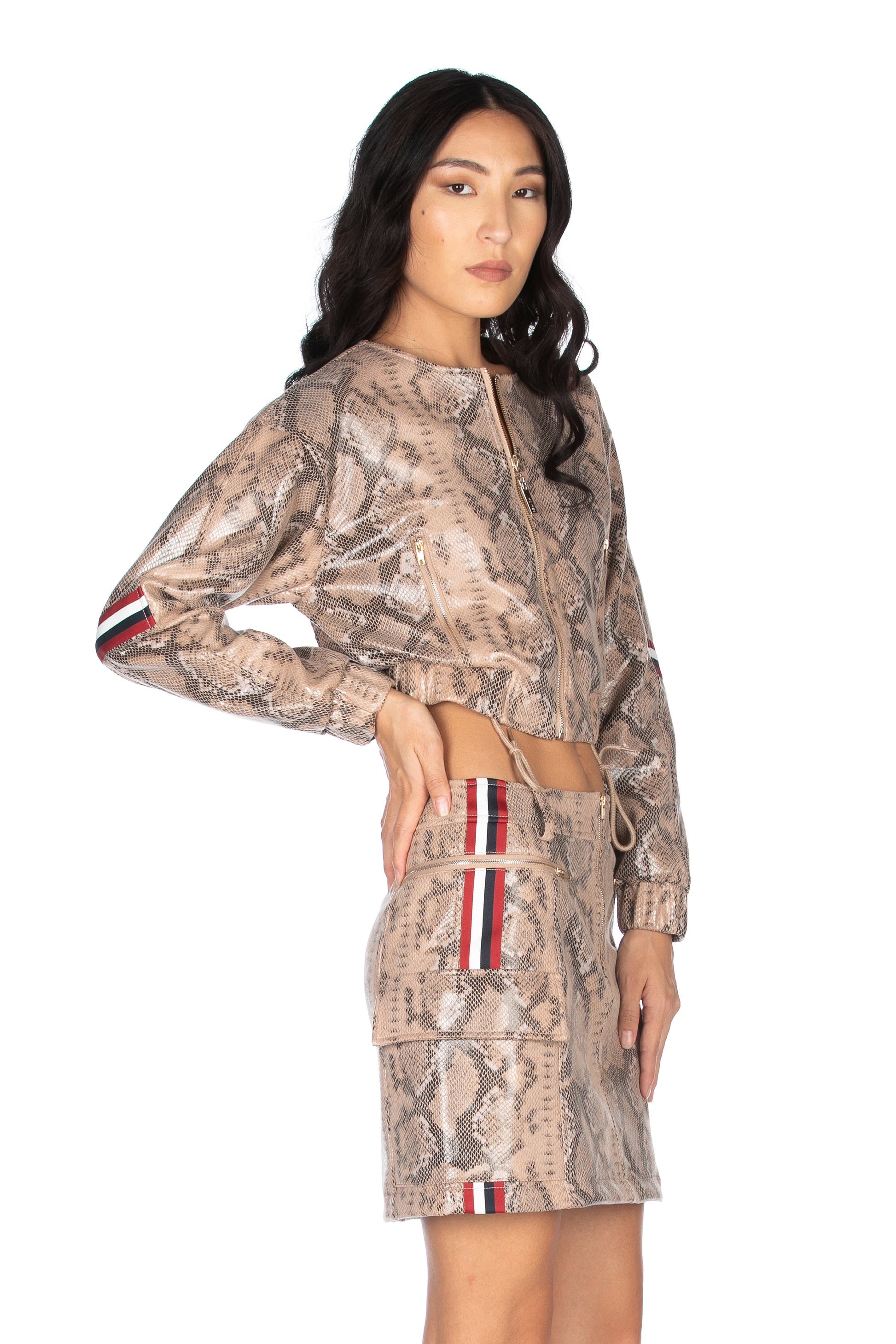 SERENE 蟒蛇纹印花生态皮革夹克,配以罗缎饰带