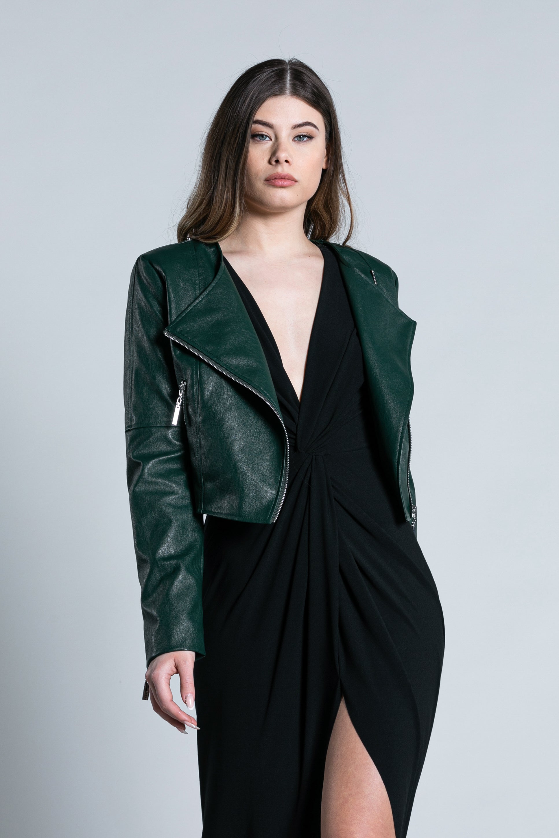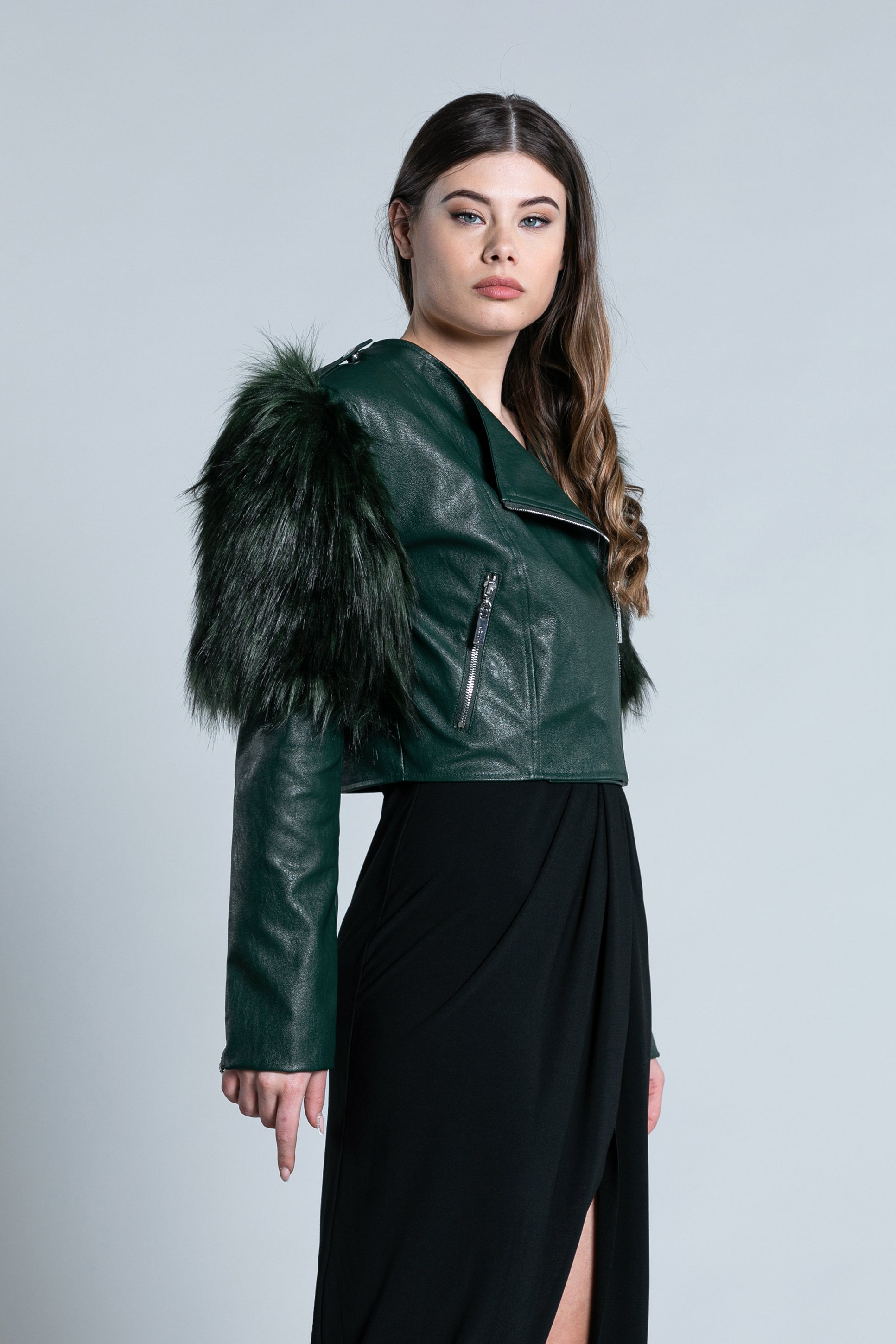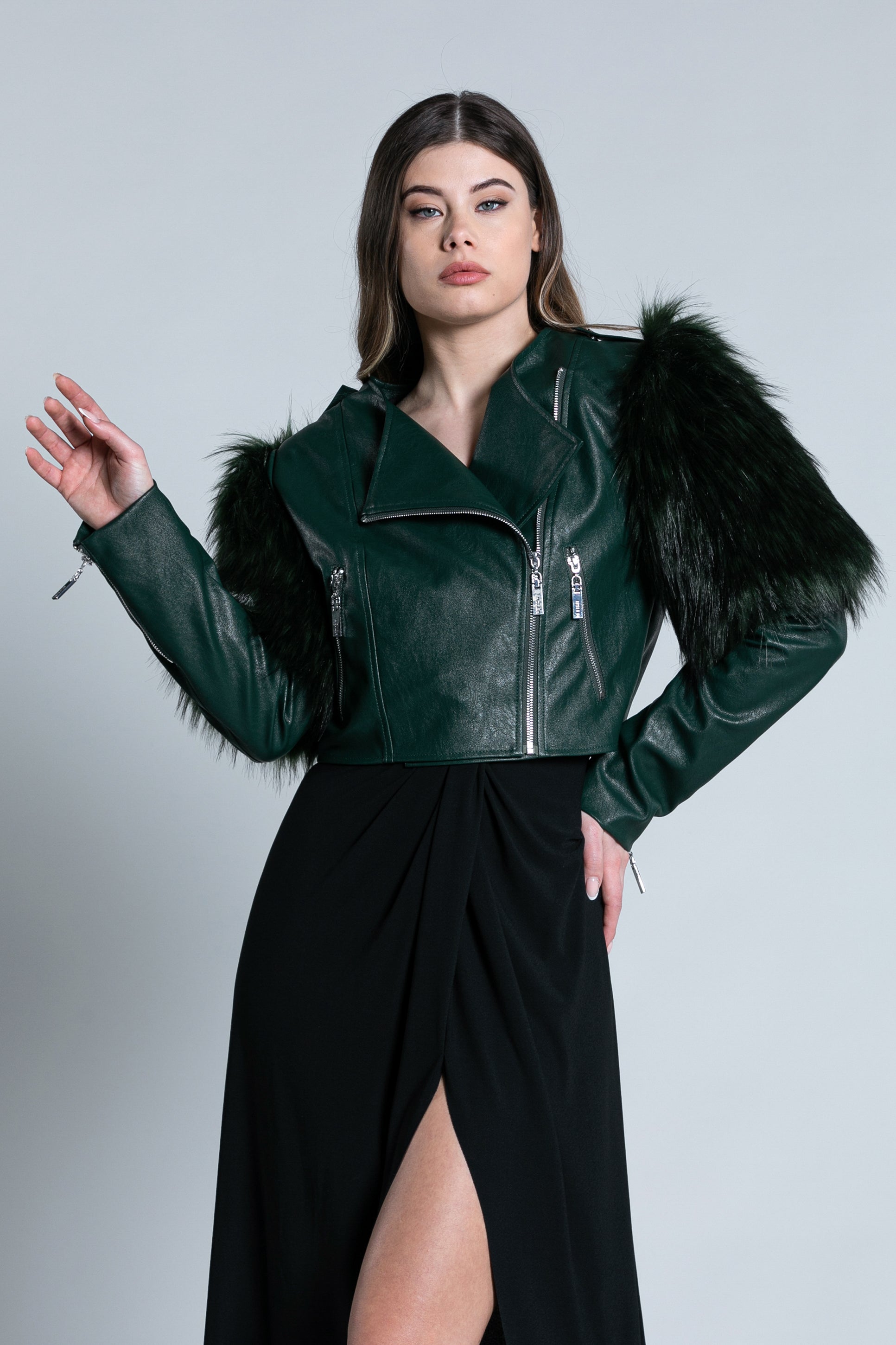 TILI 短款长袖夹克,配有可拆卸人造皮草口袋和人造皮革拉链