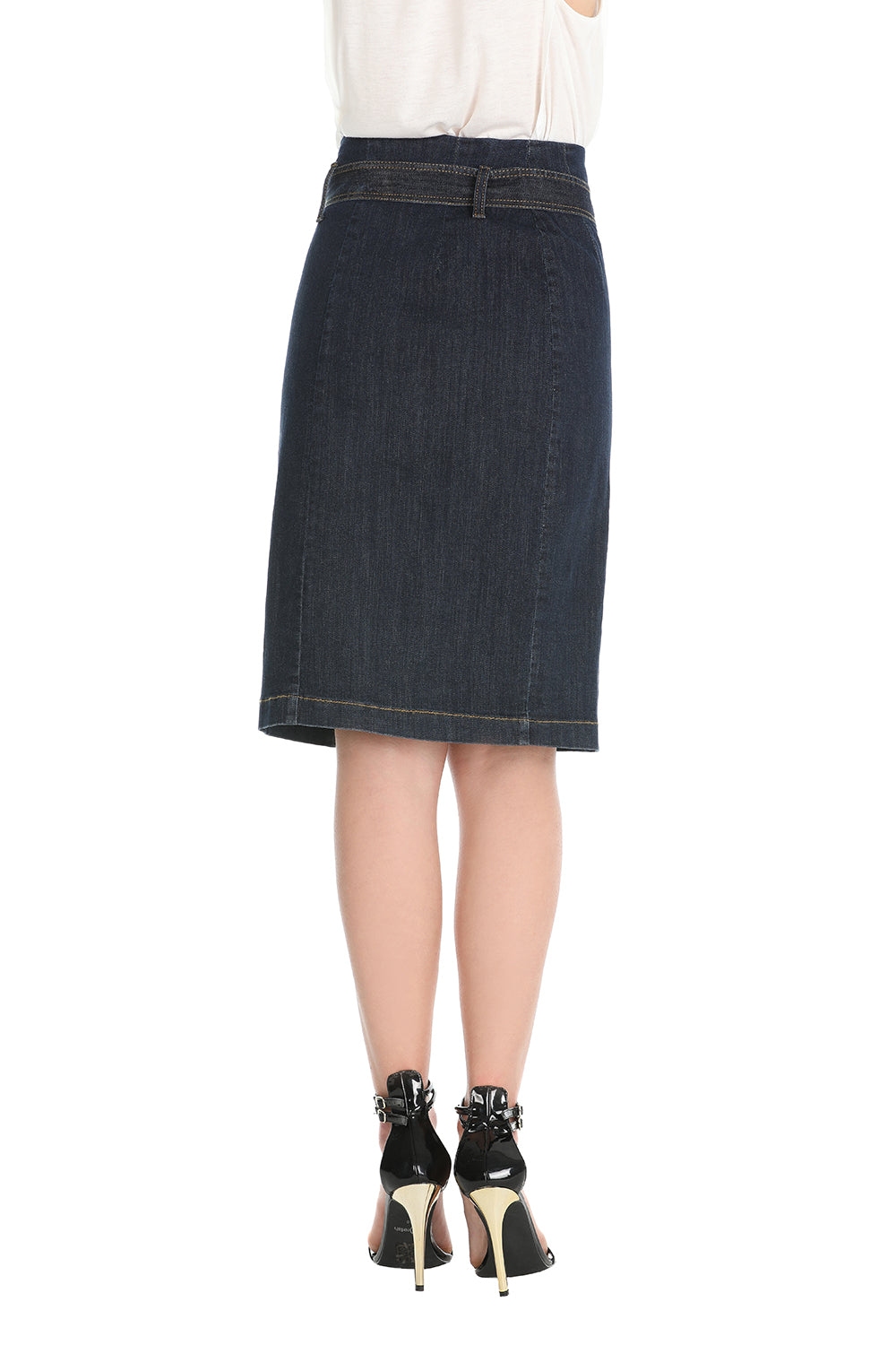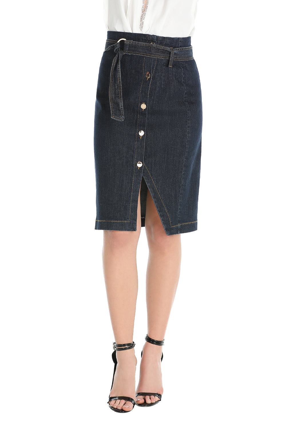 高腰深蓝色牛仔中长裙,配侧开衩纽扣和 AILEA 腰带