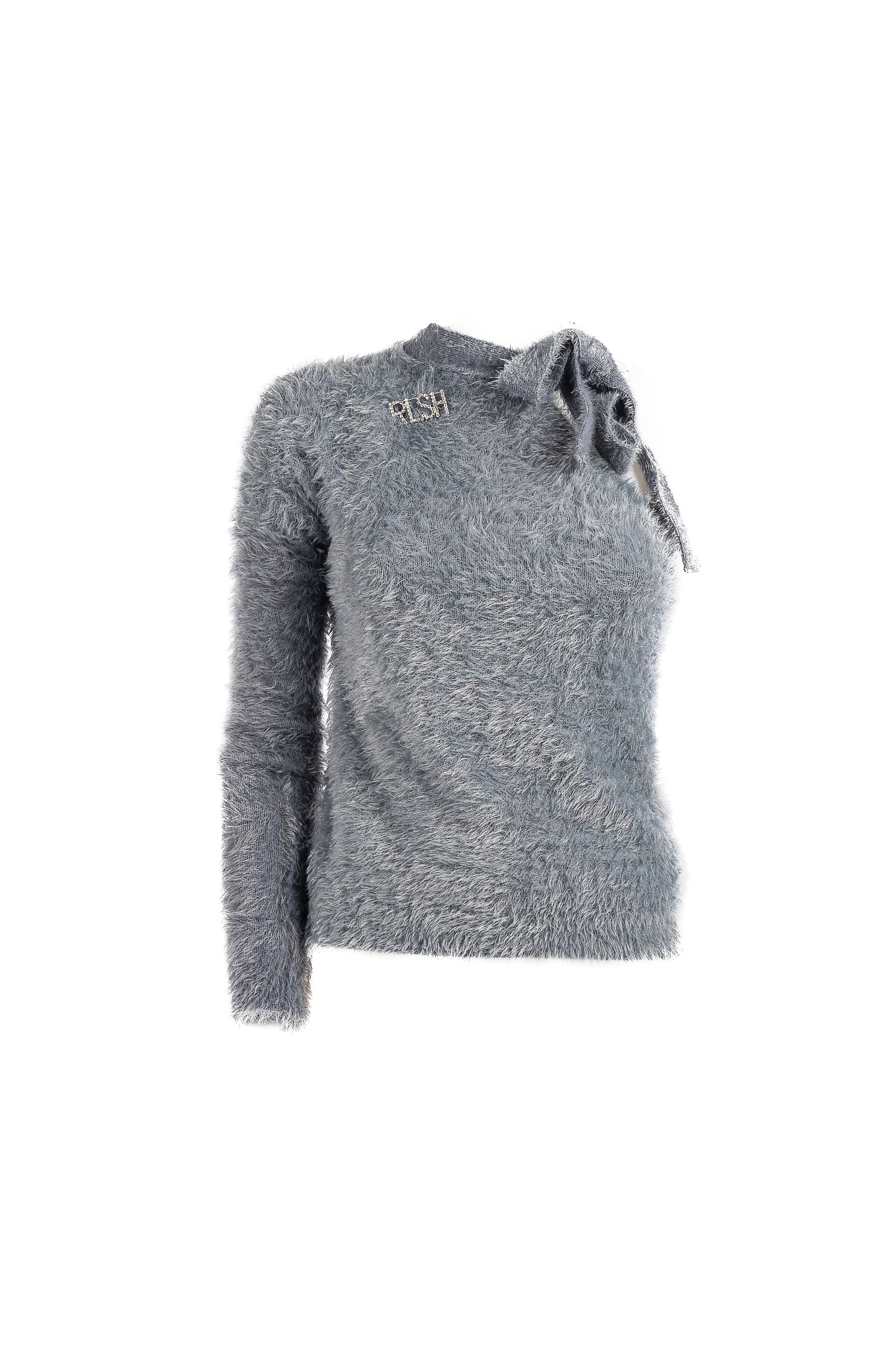 AMAMY 蝴蝶结胸针长袖一字肩衬衫