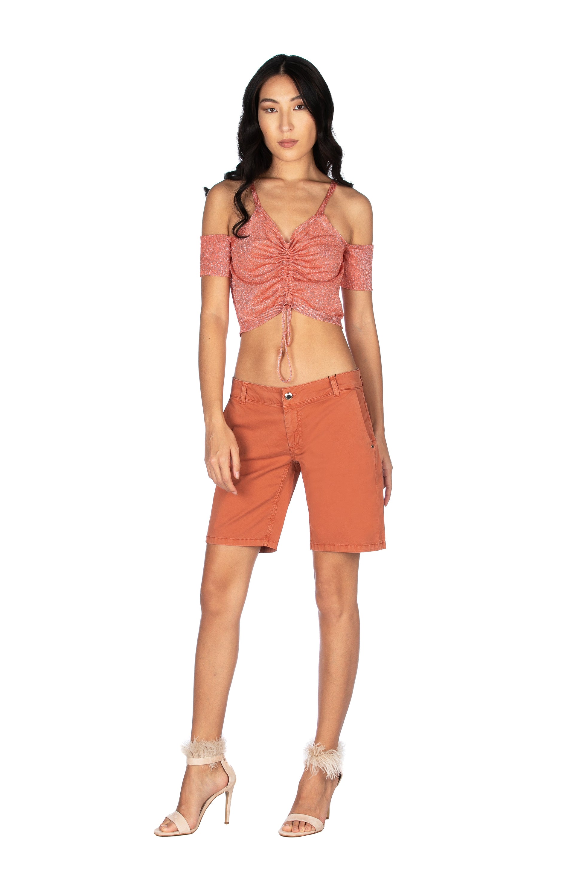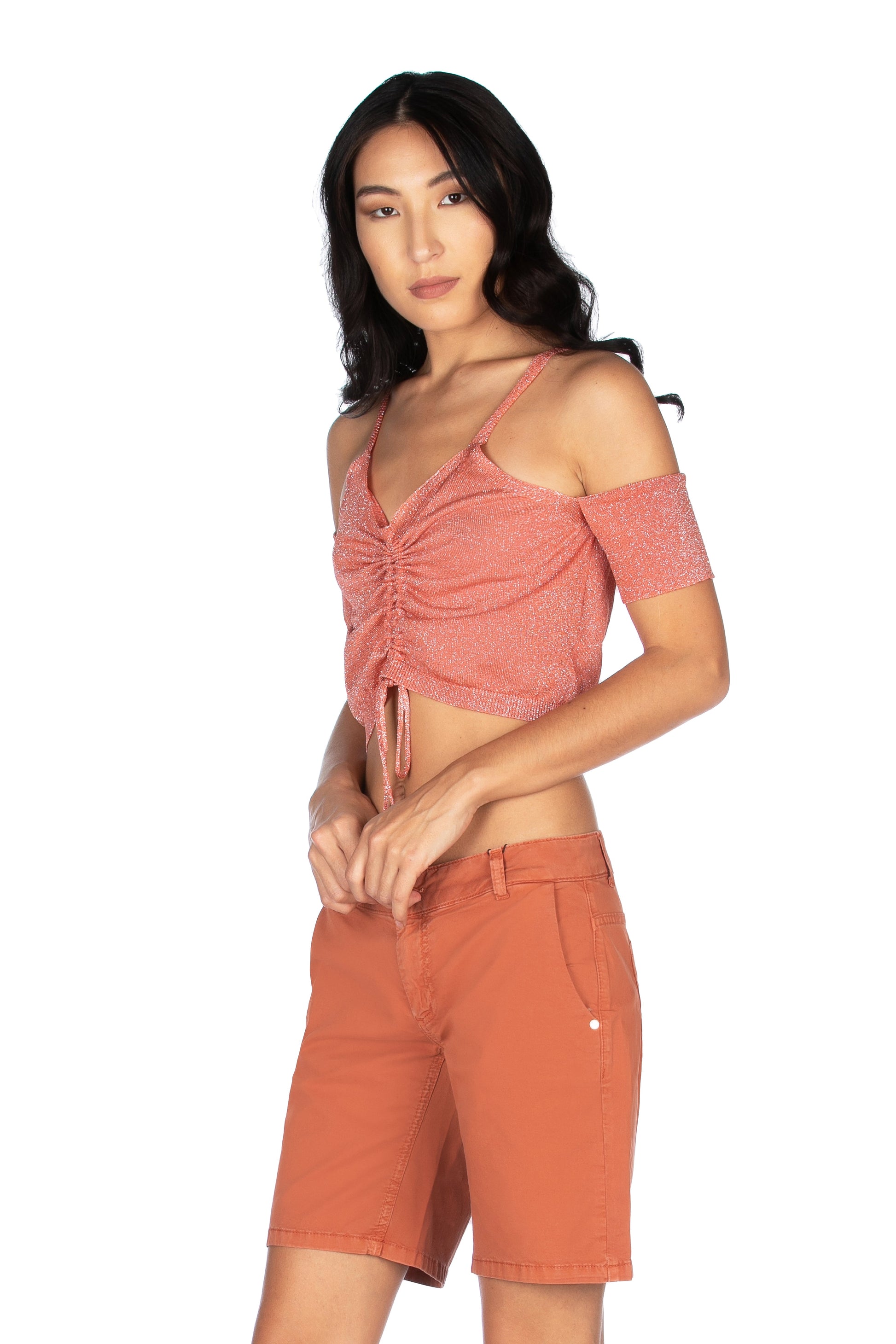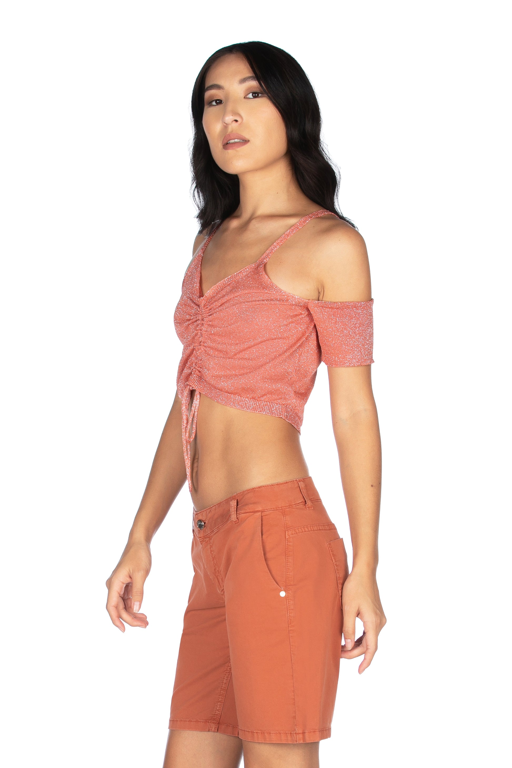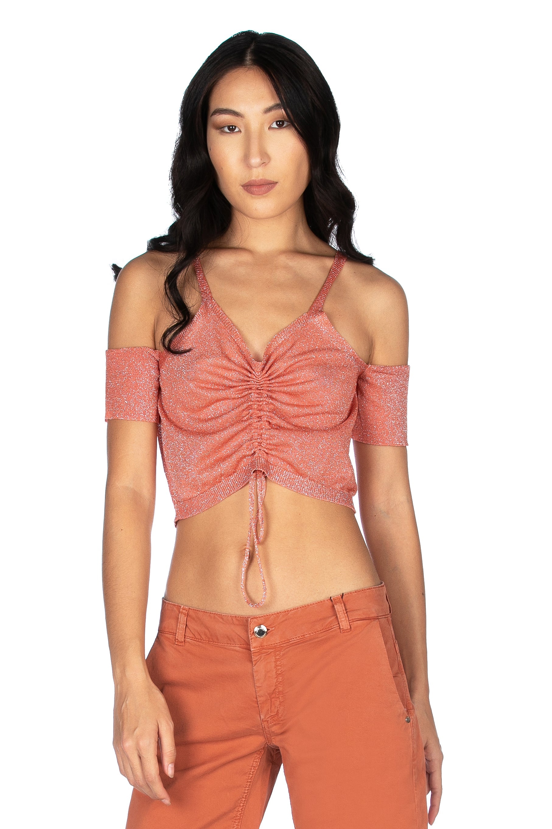 ASTONETTI 露肩短袖毛衣,金银丝束带
