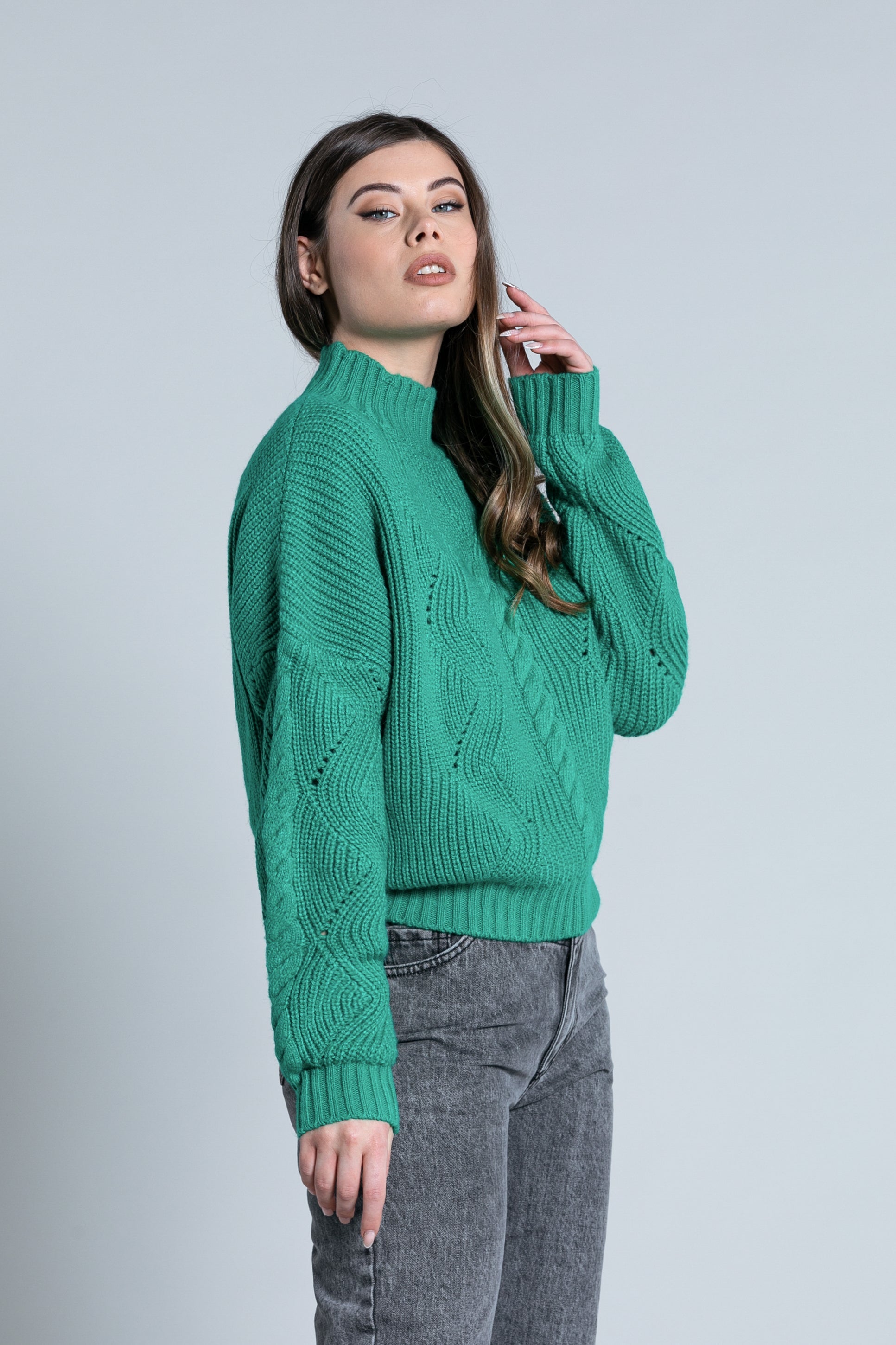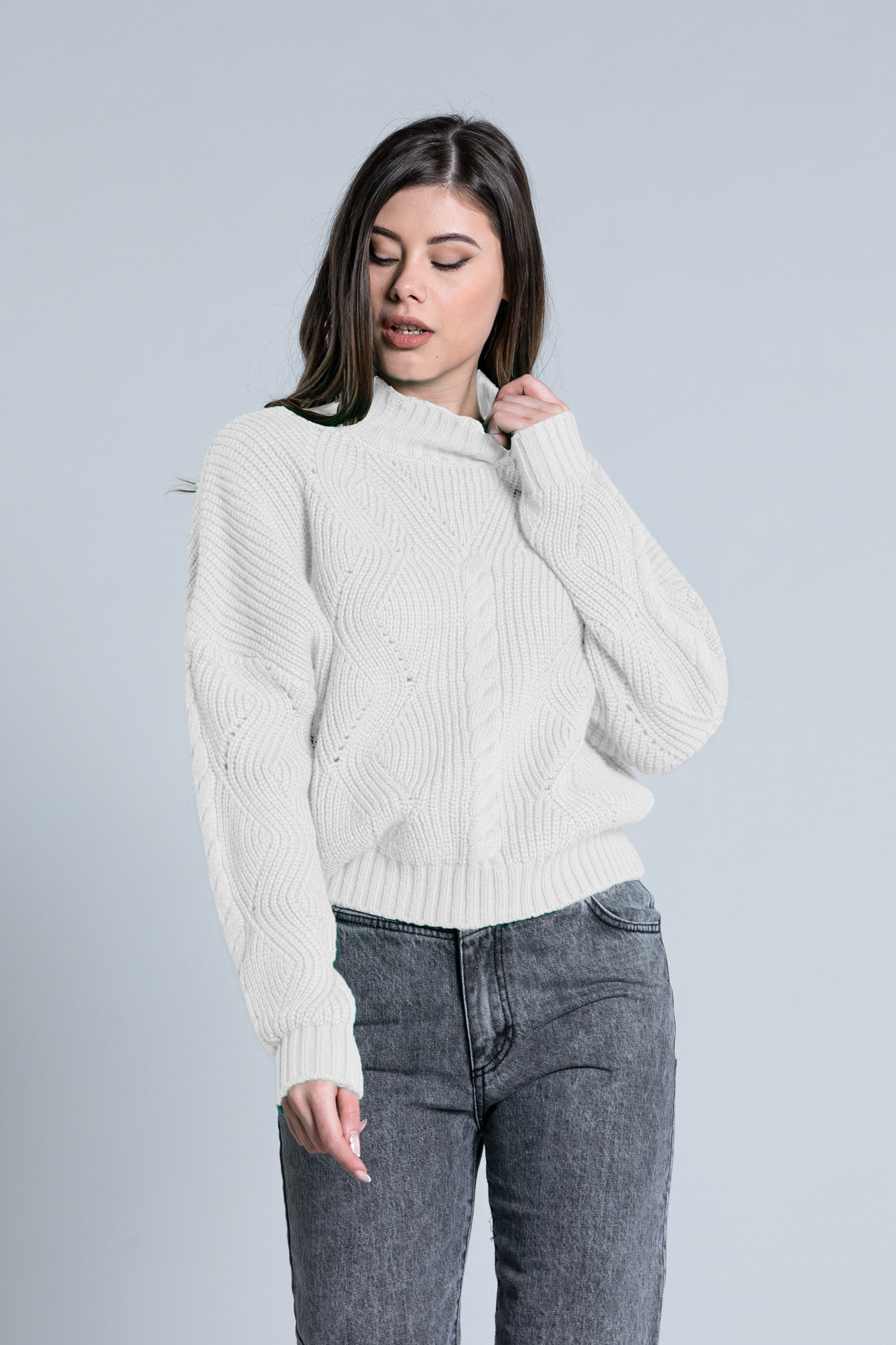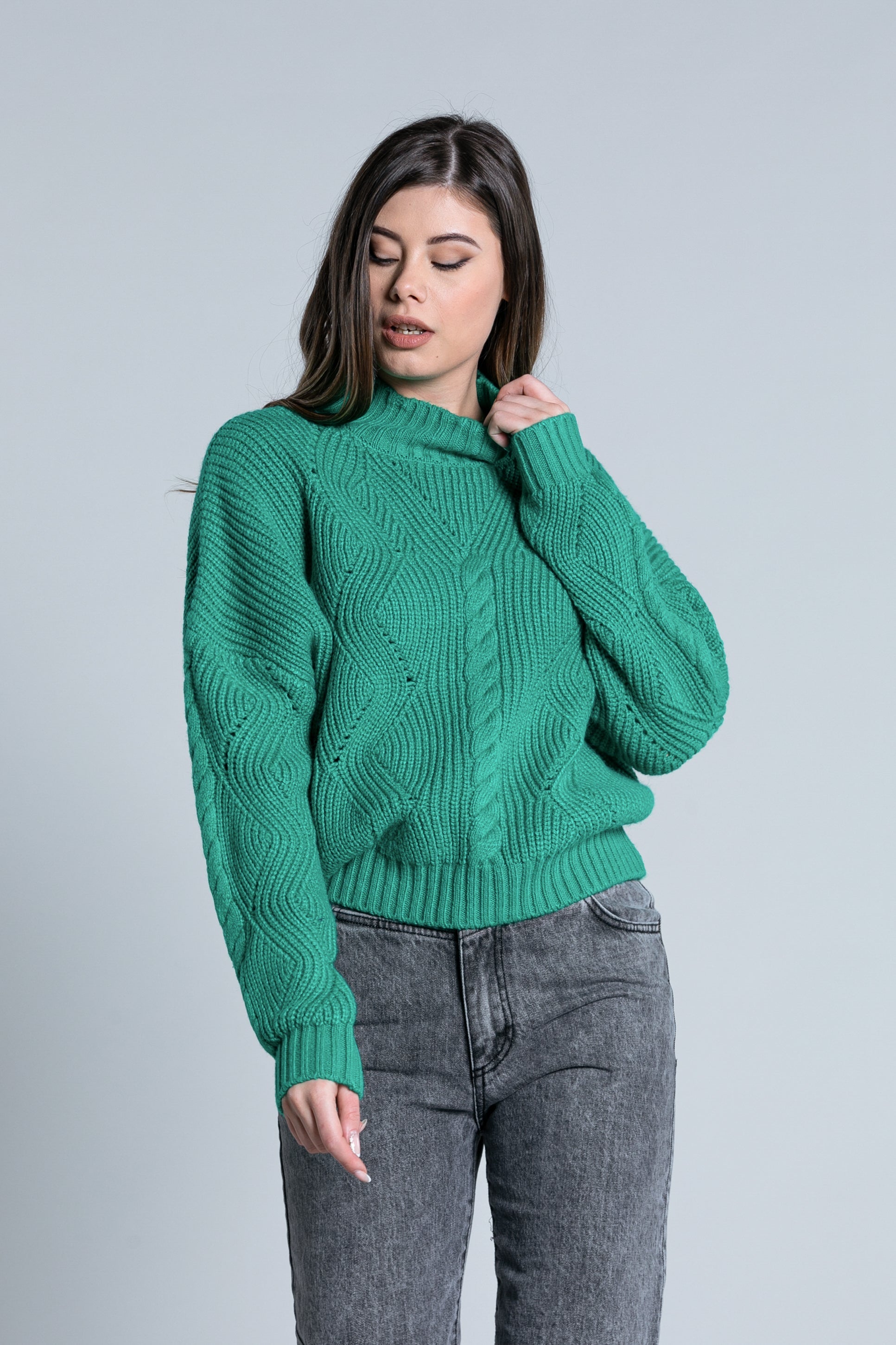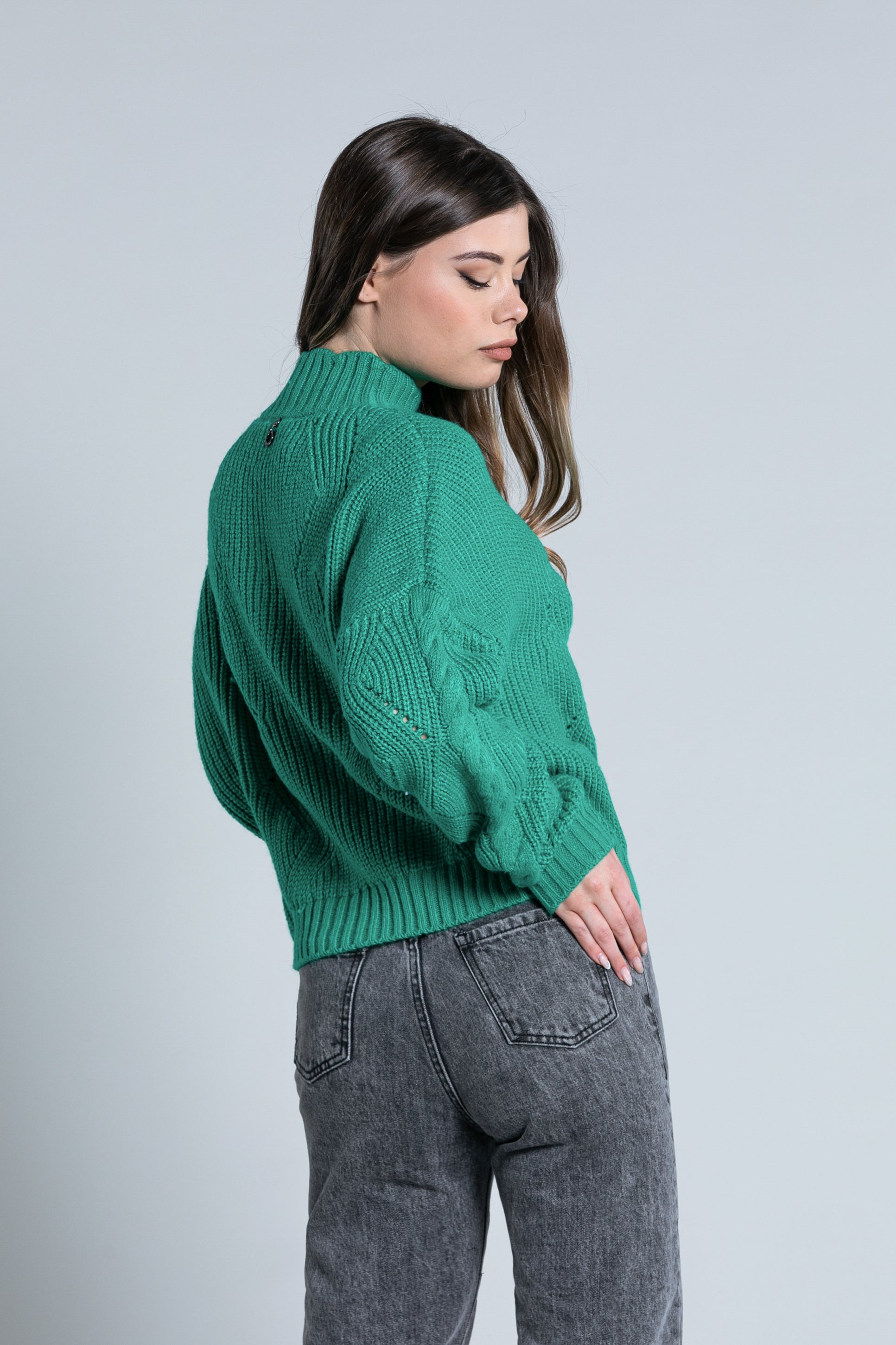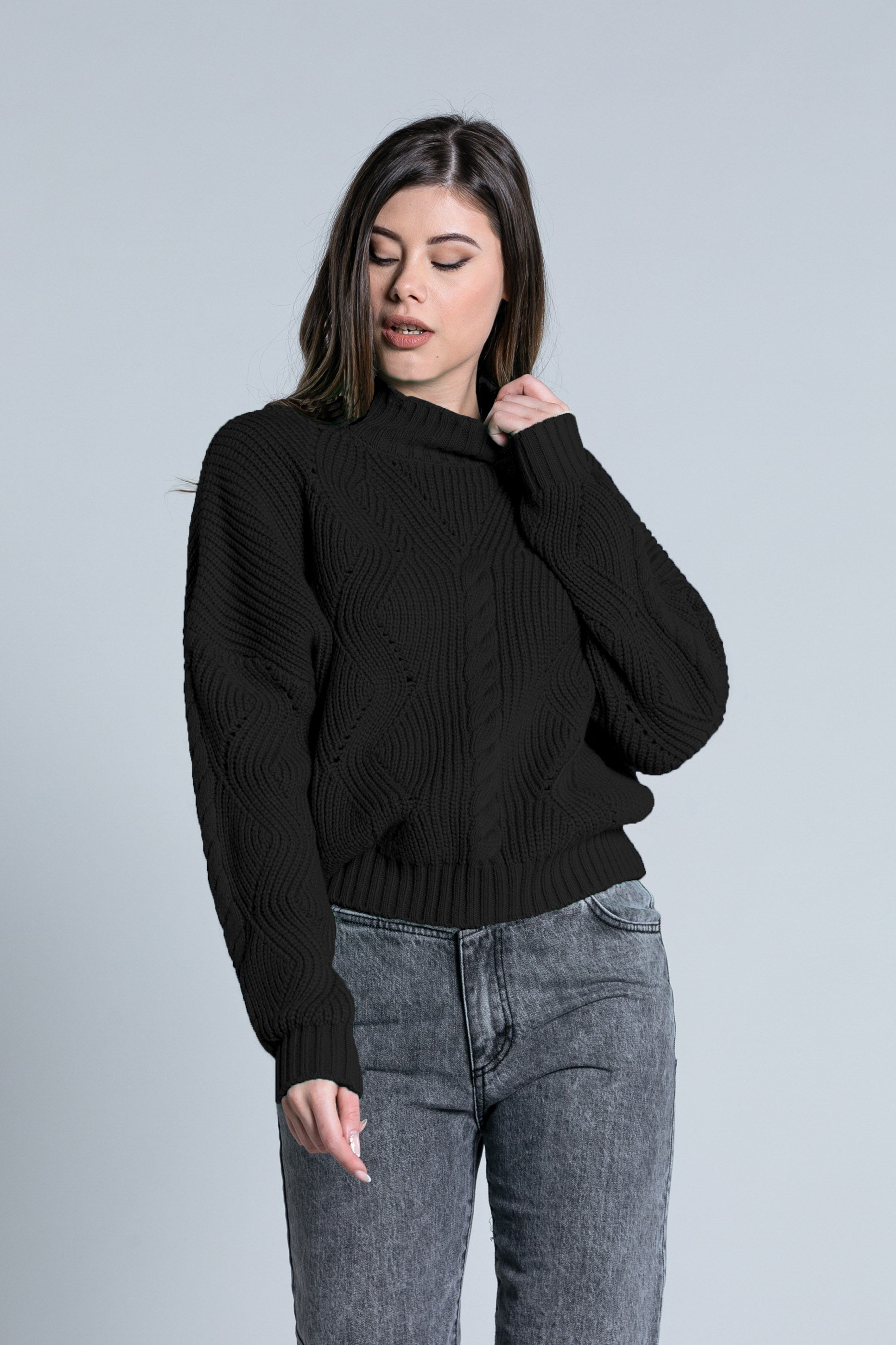 ATIS 宽落肩火山领加绞花针织长袖衬衫