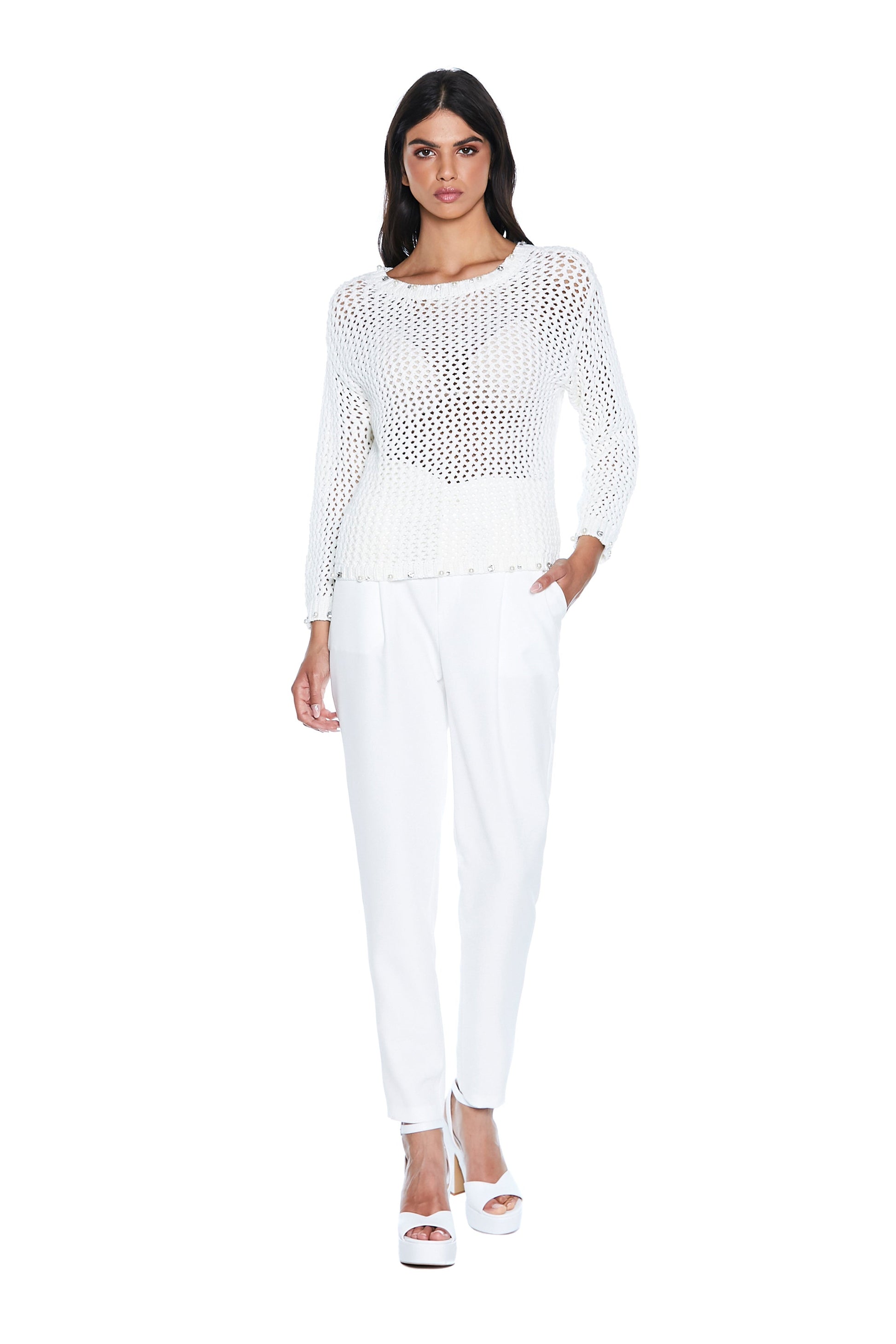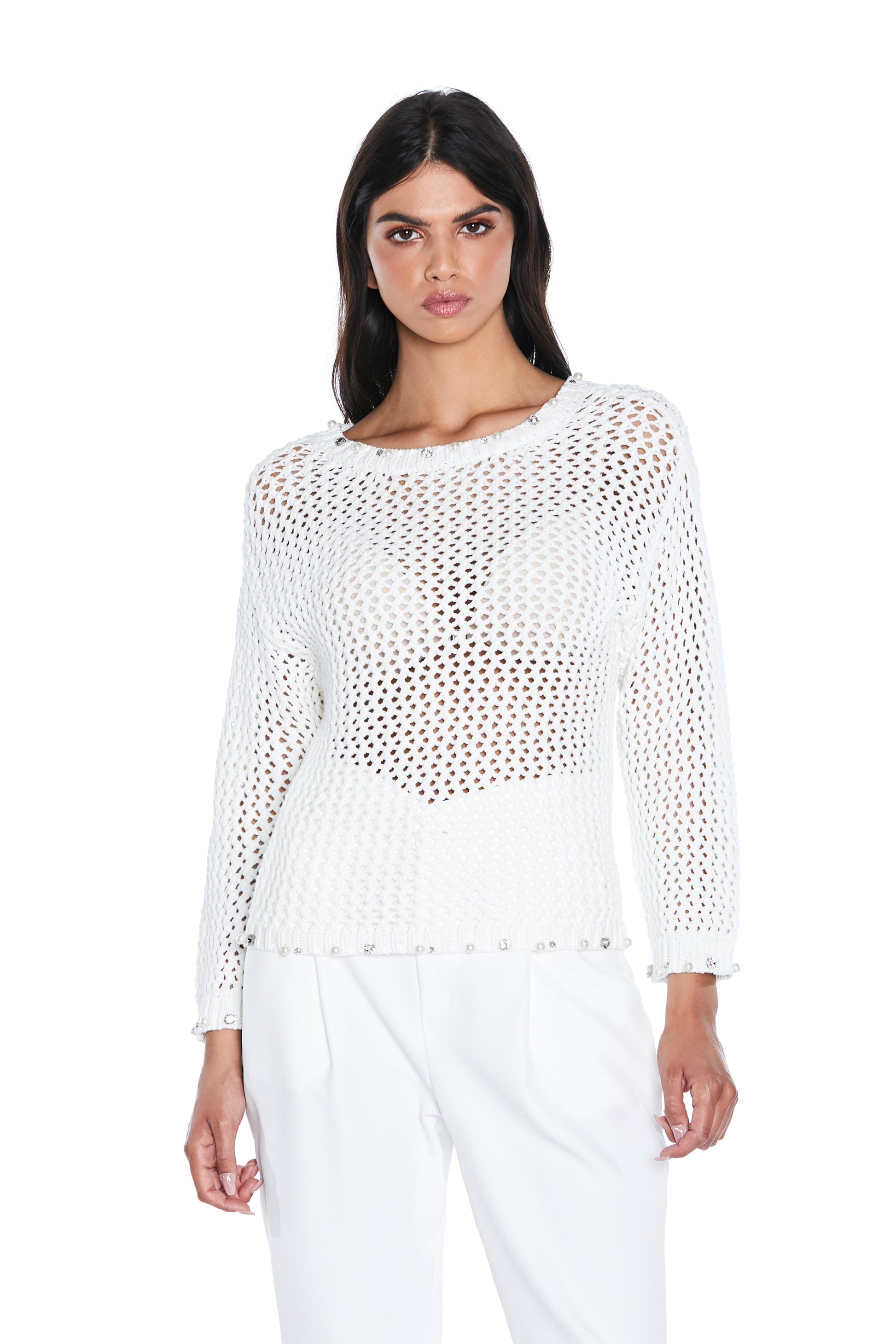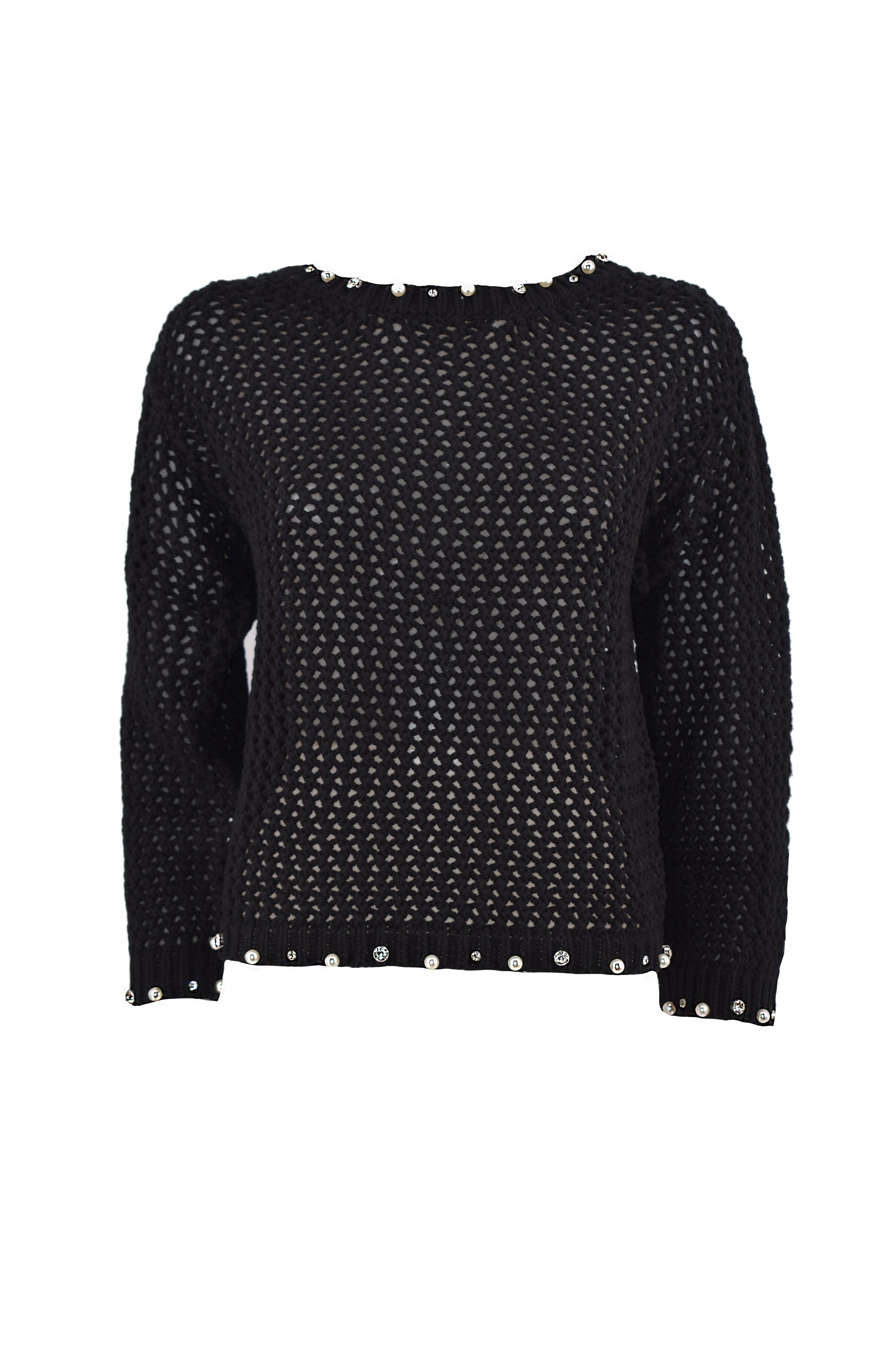 SUMIERT 长袖毛衣,水钻和珍珠贴花,蜂窝网状边缘