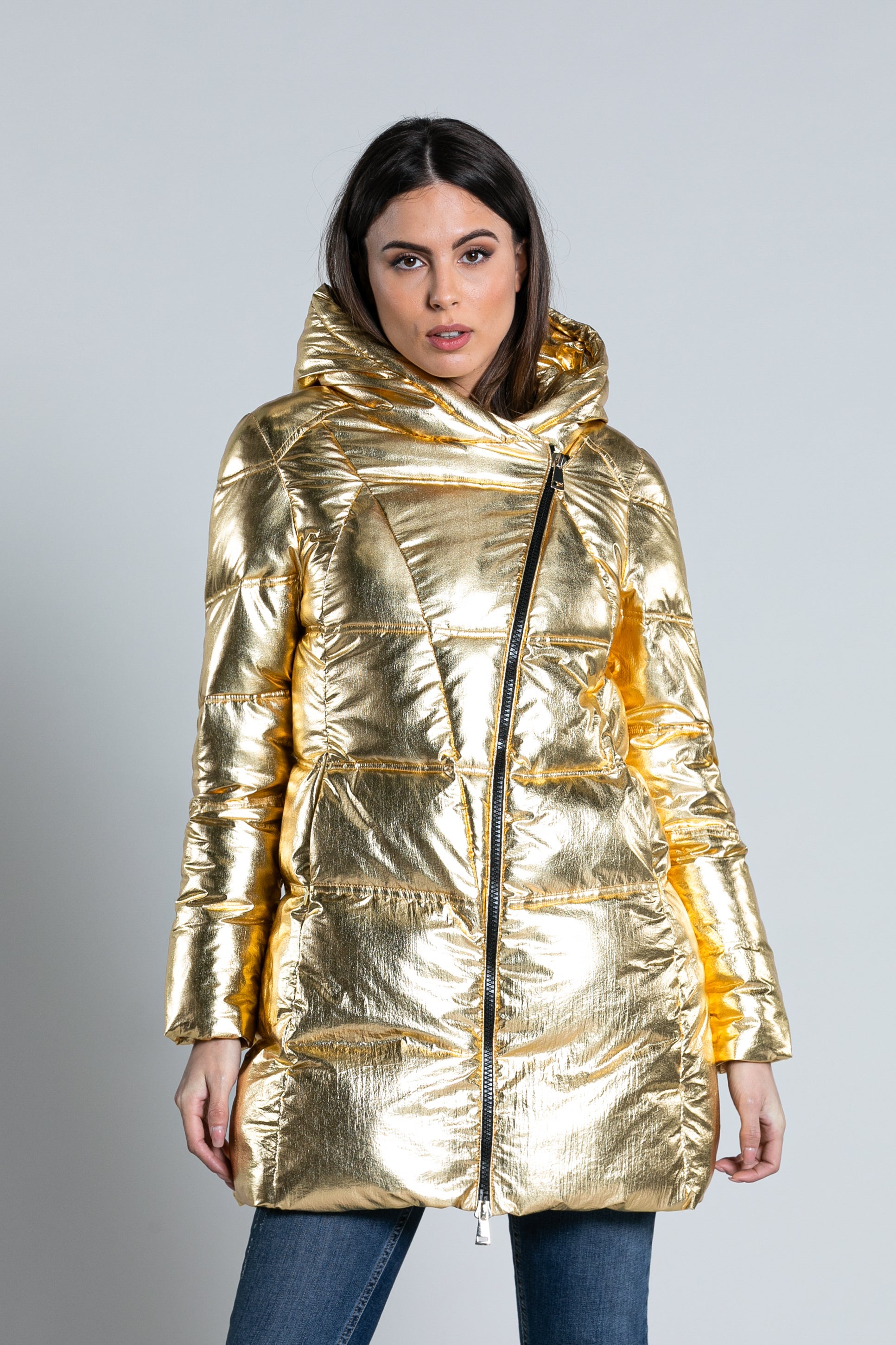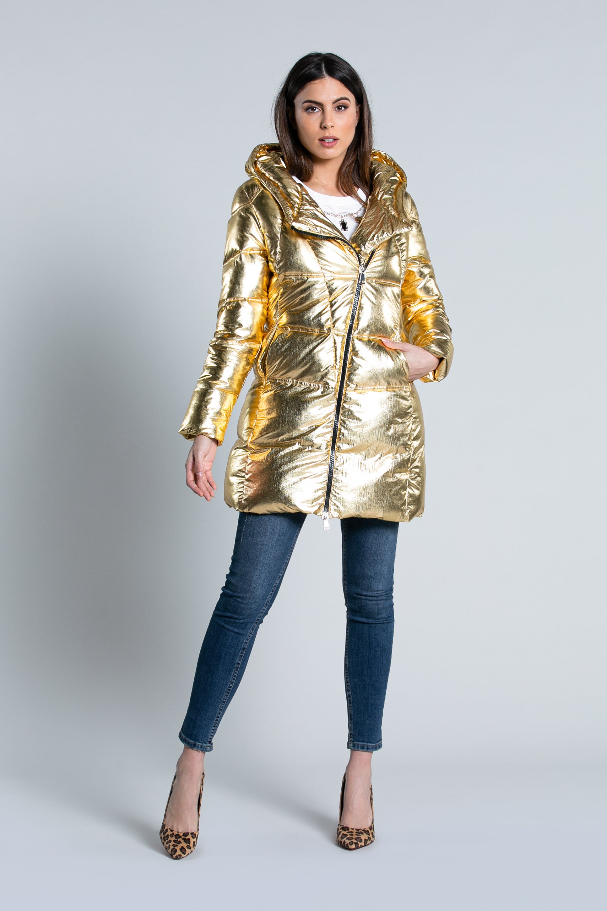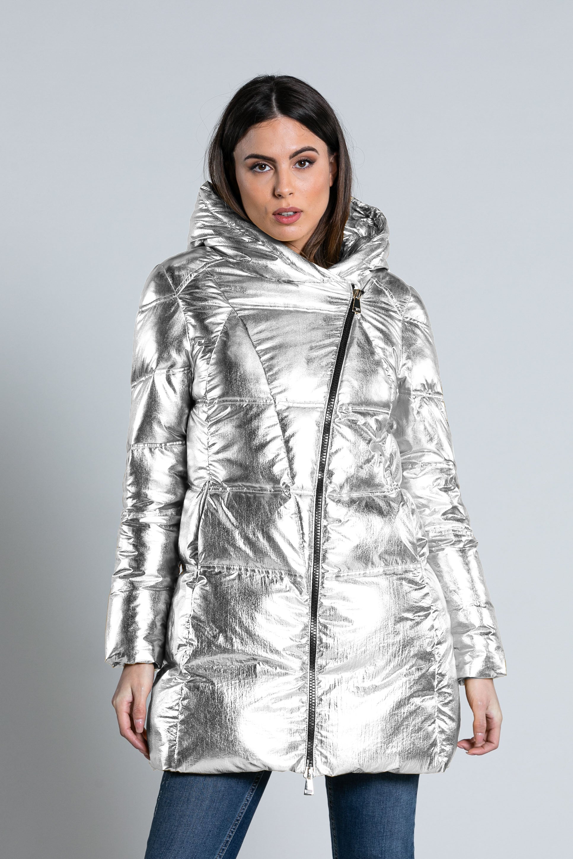 连帽长袖 ESSA 羽绒服,横向金属效果拉链