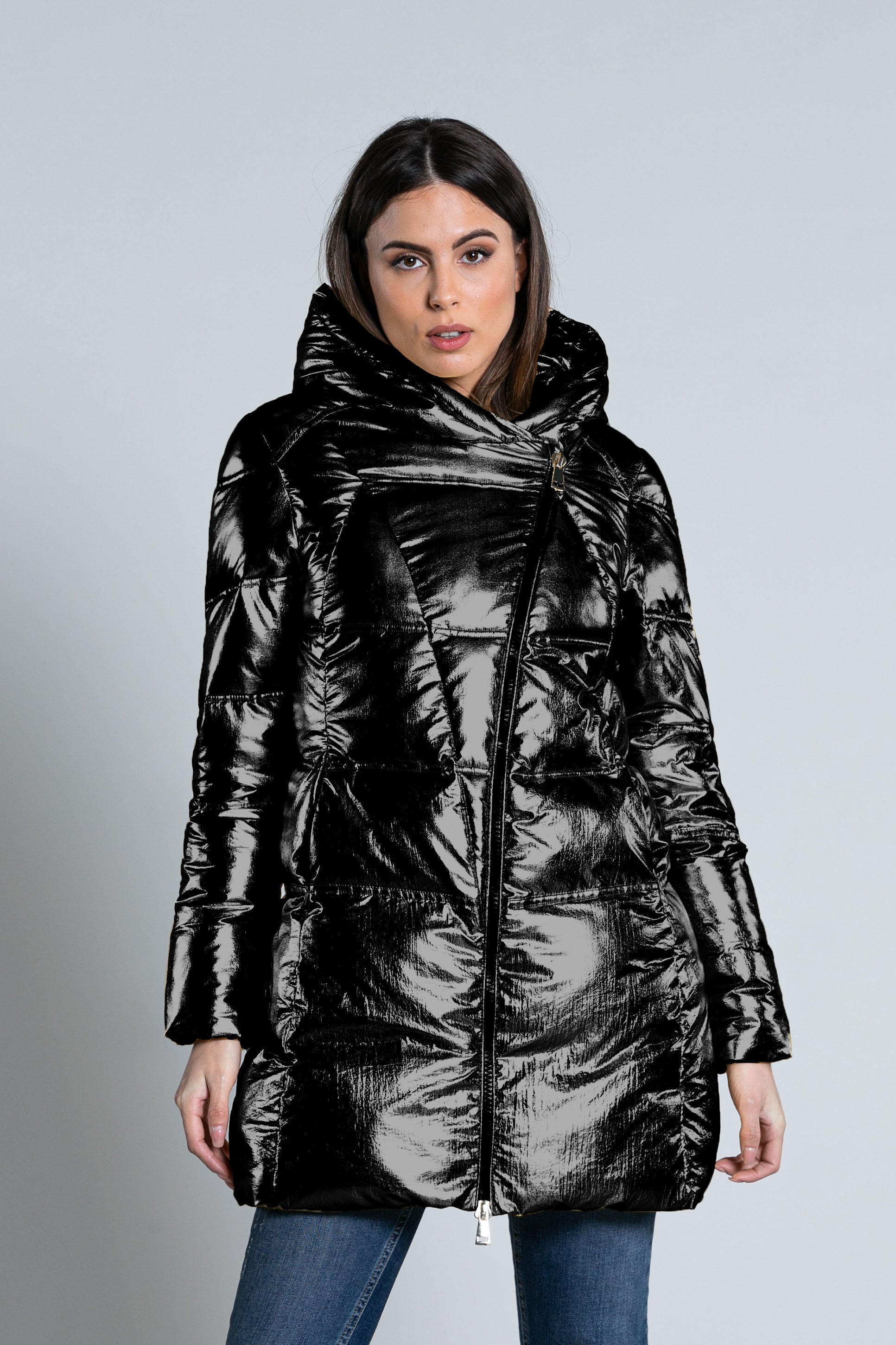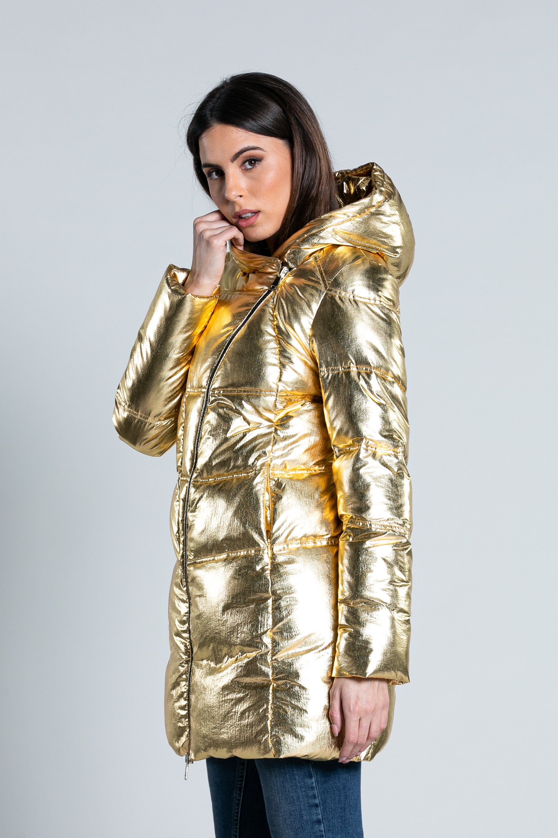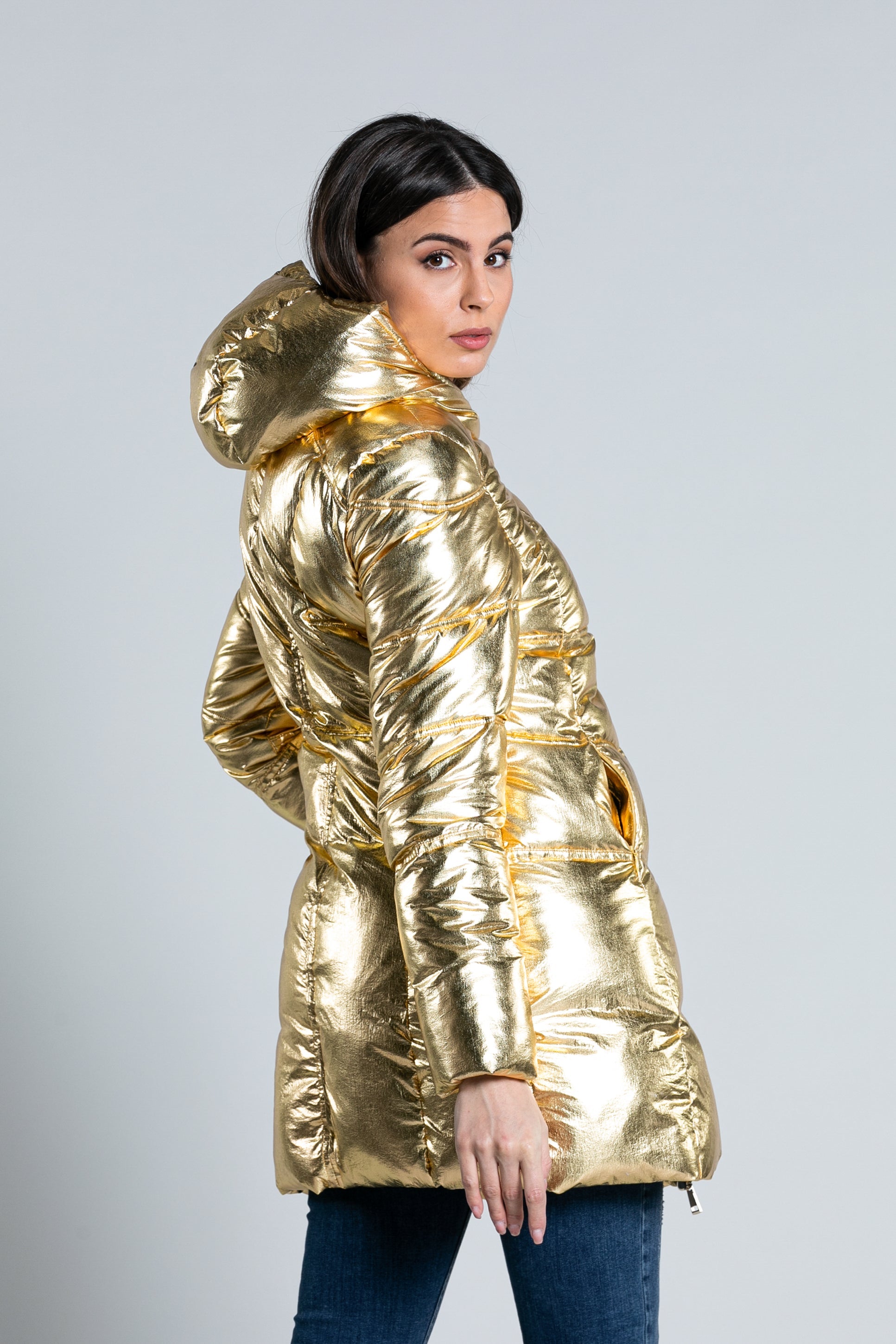 连帽长袖 ESSA 羽绒服,横向金属效果拉链