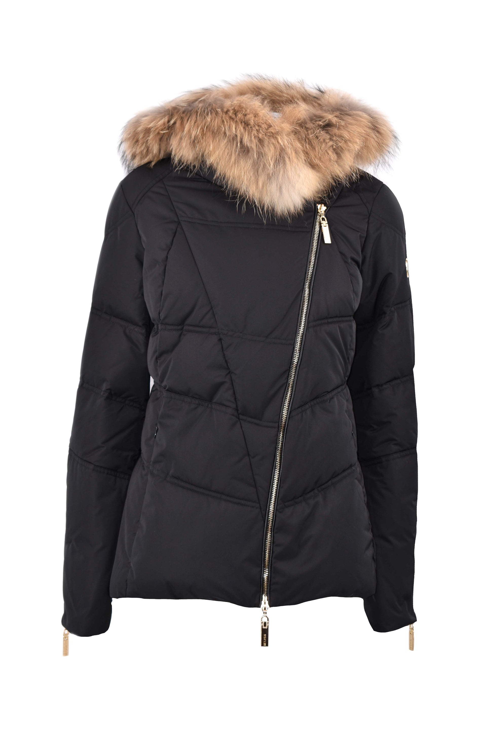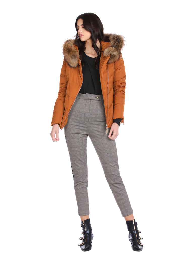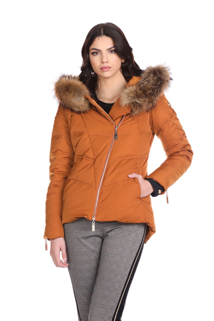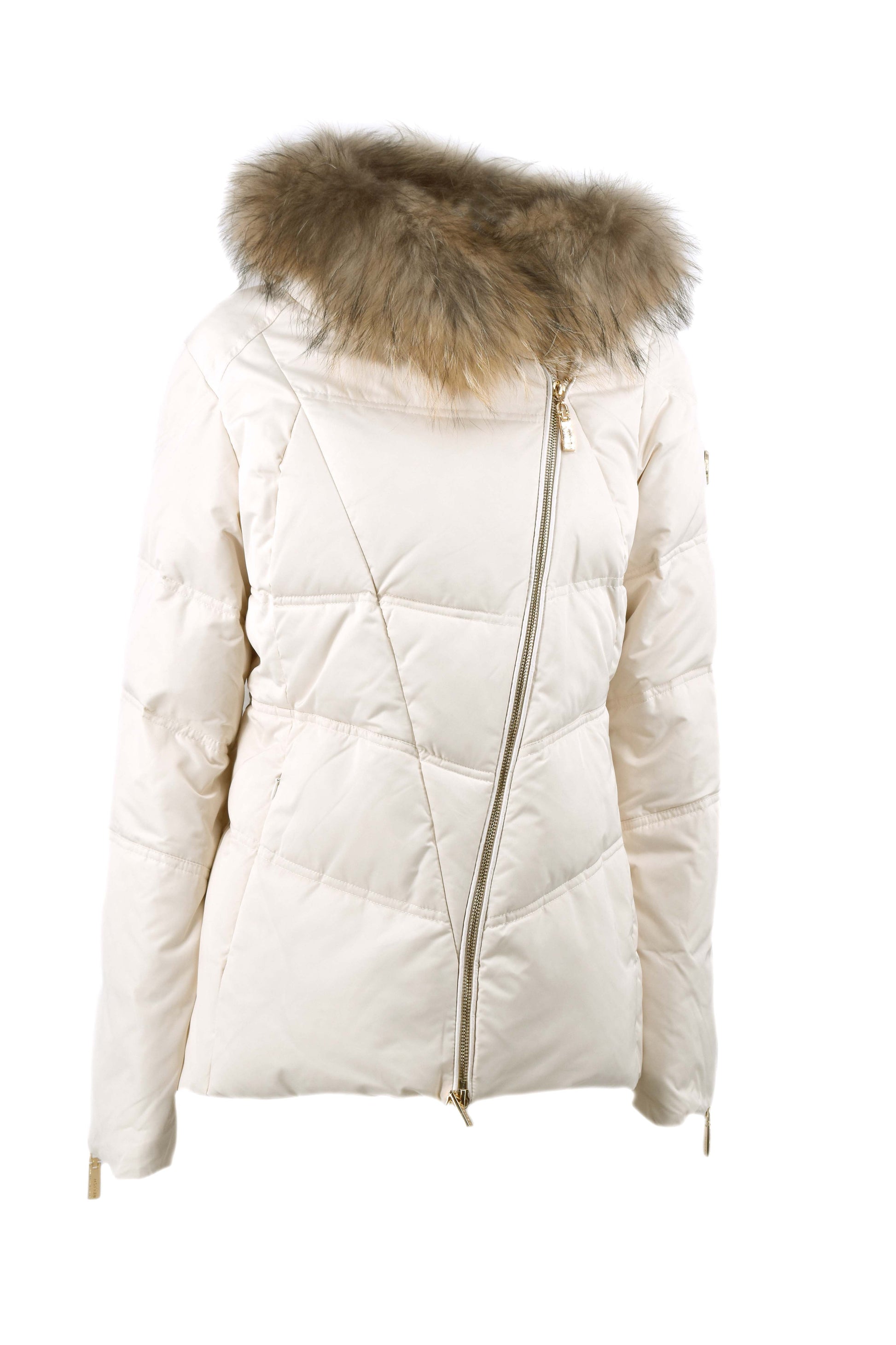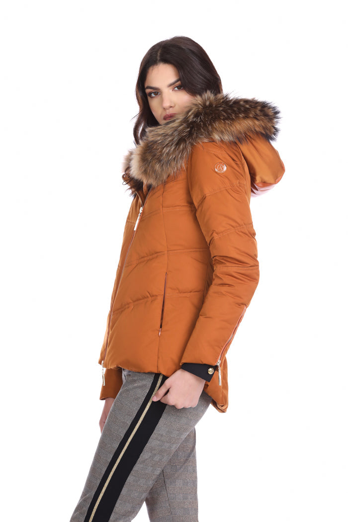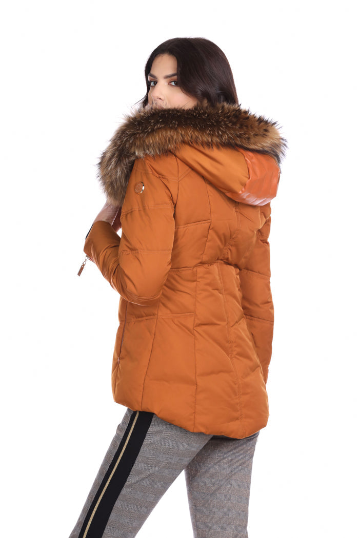 PYLET 长袖羽绒服,带生态皮革细节和横向拉链。加上毛皮罩