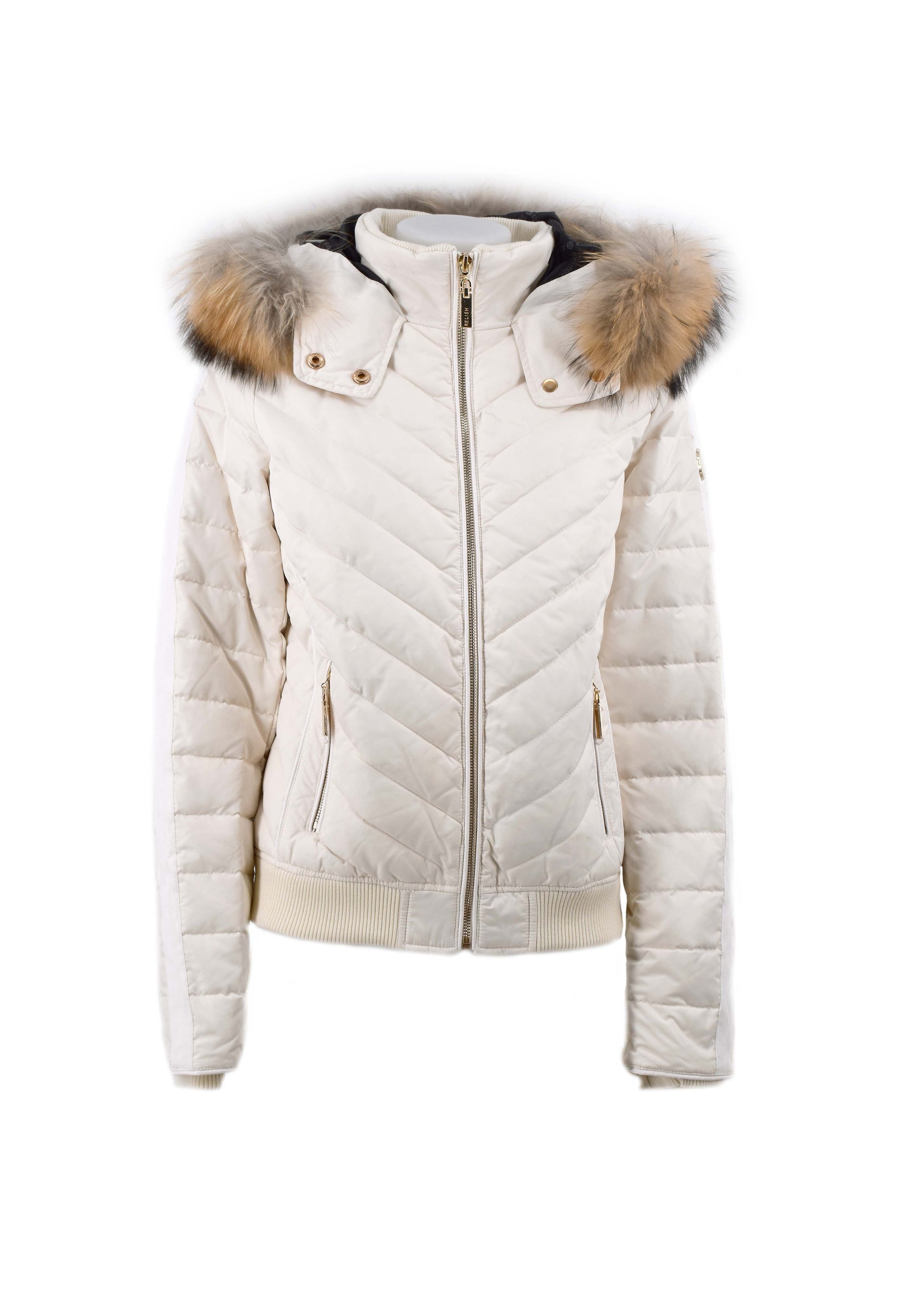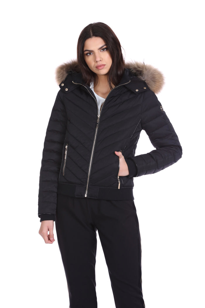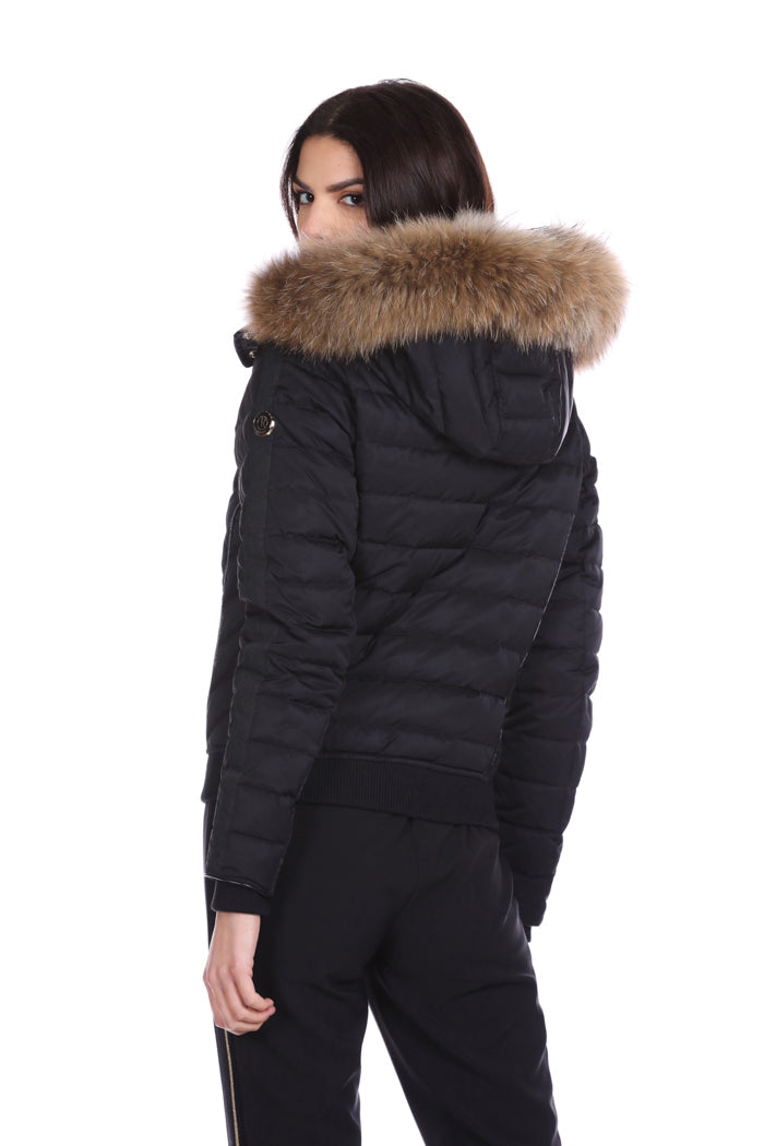 RIVERS 短款长袖羽绒服,生态皮革细节加罗纹边缘加毛皮风帽