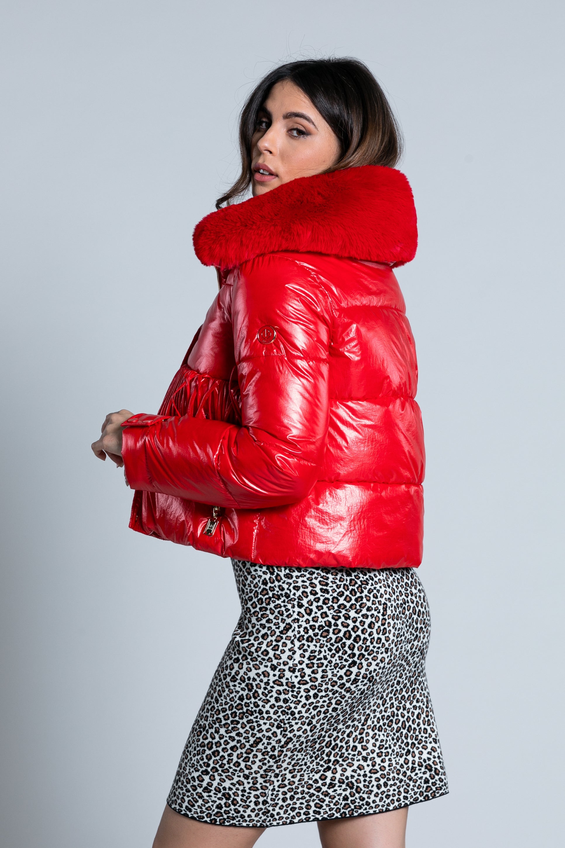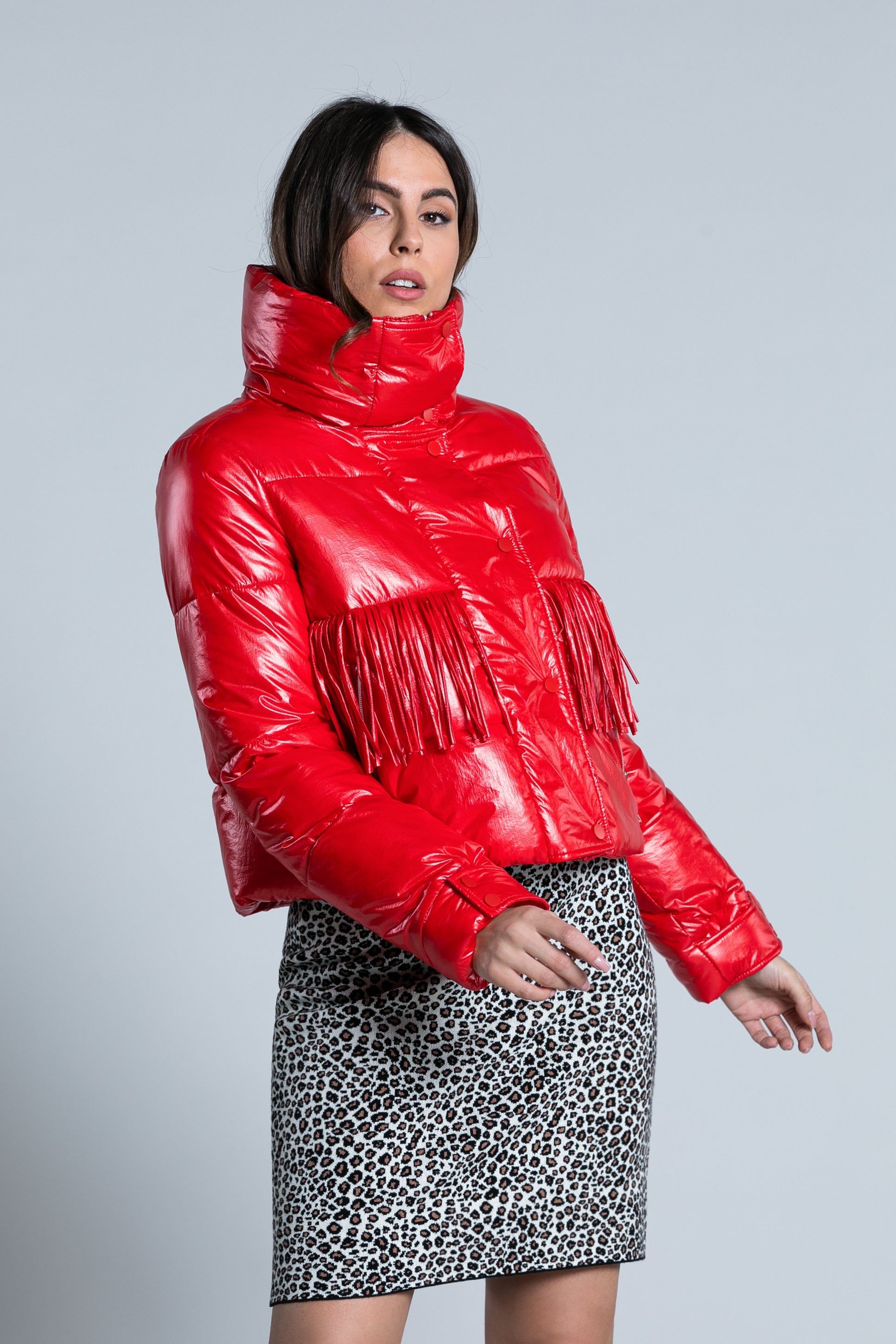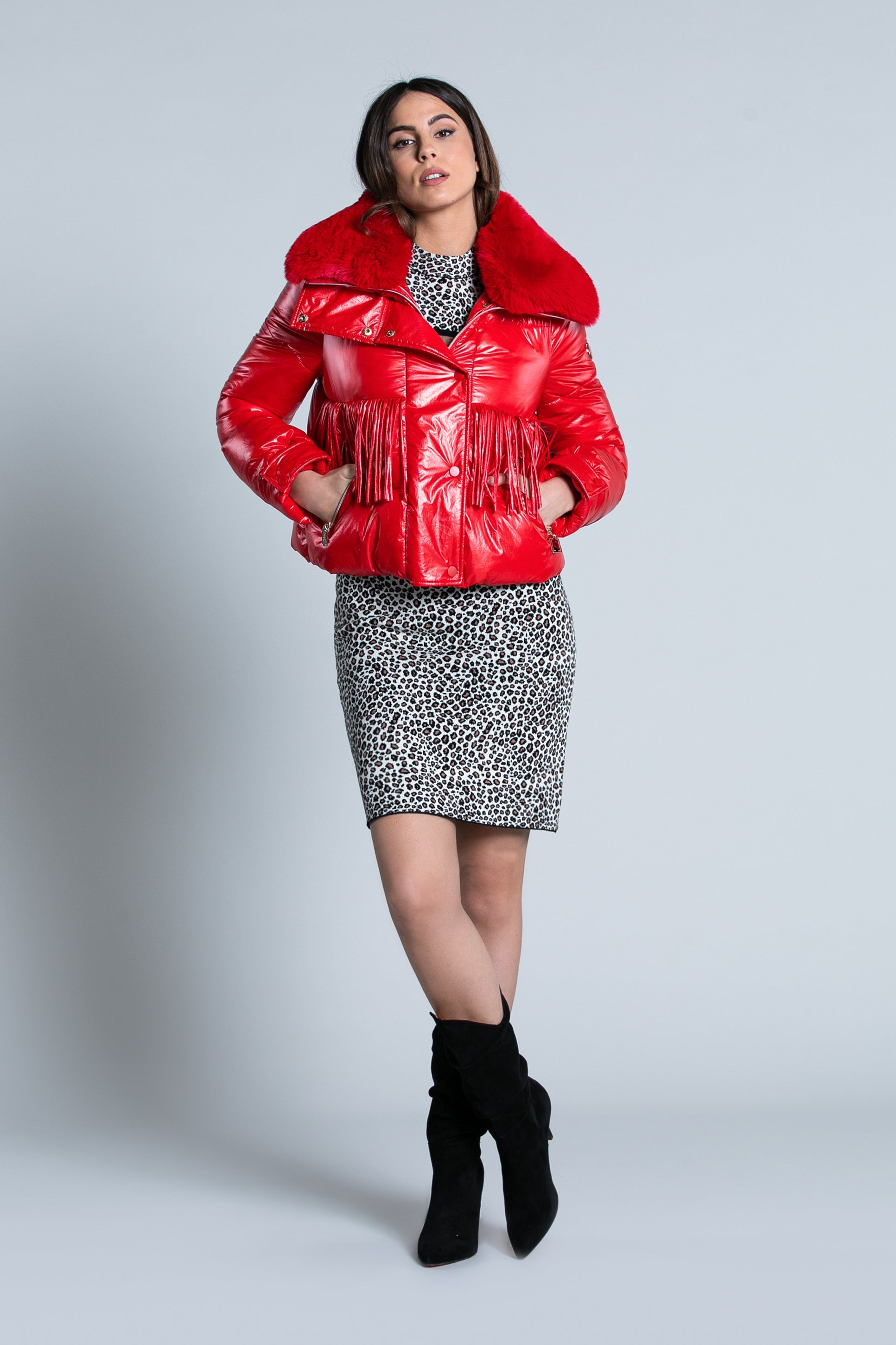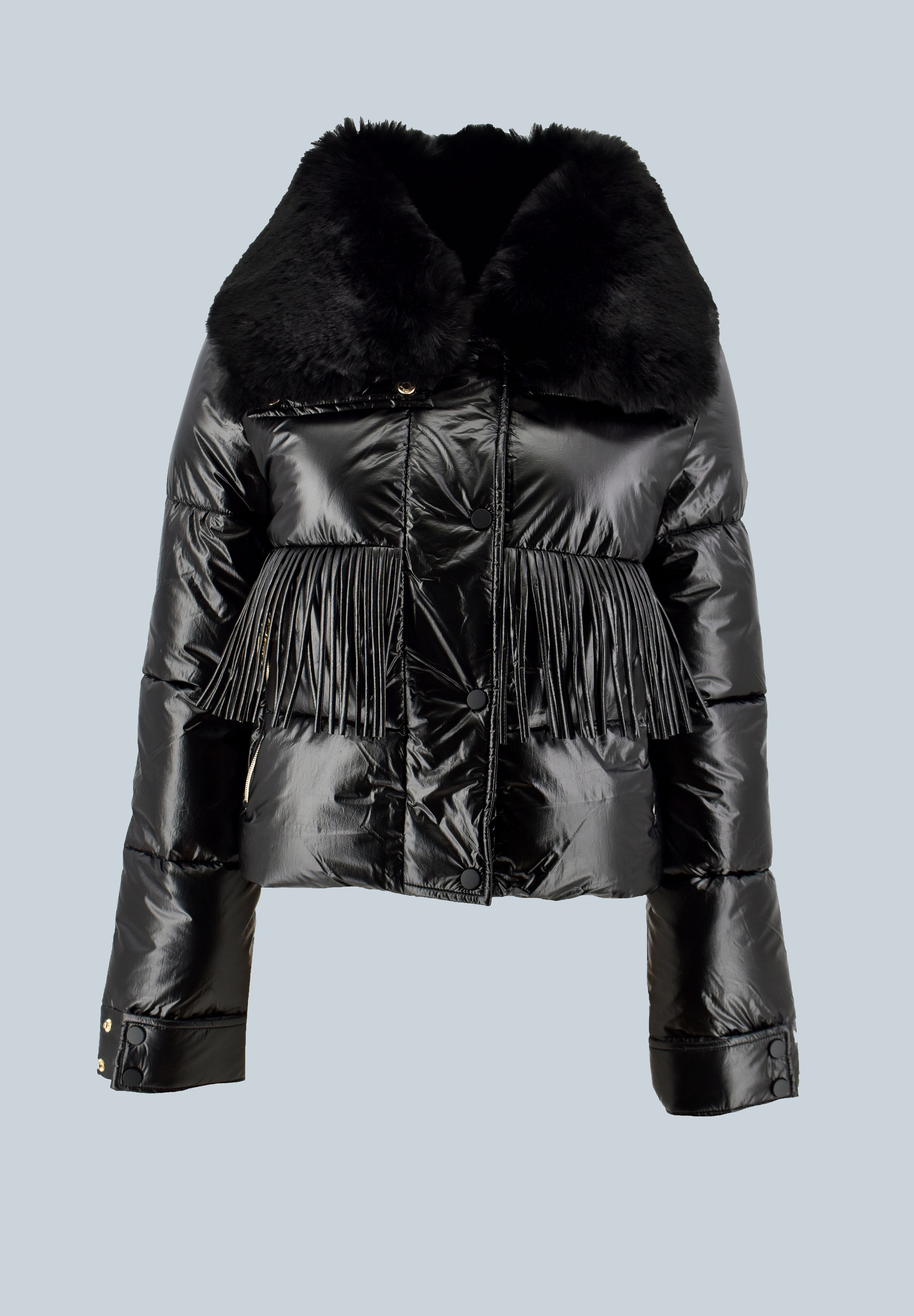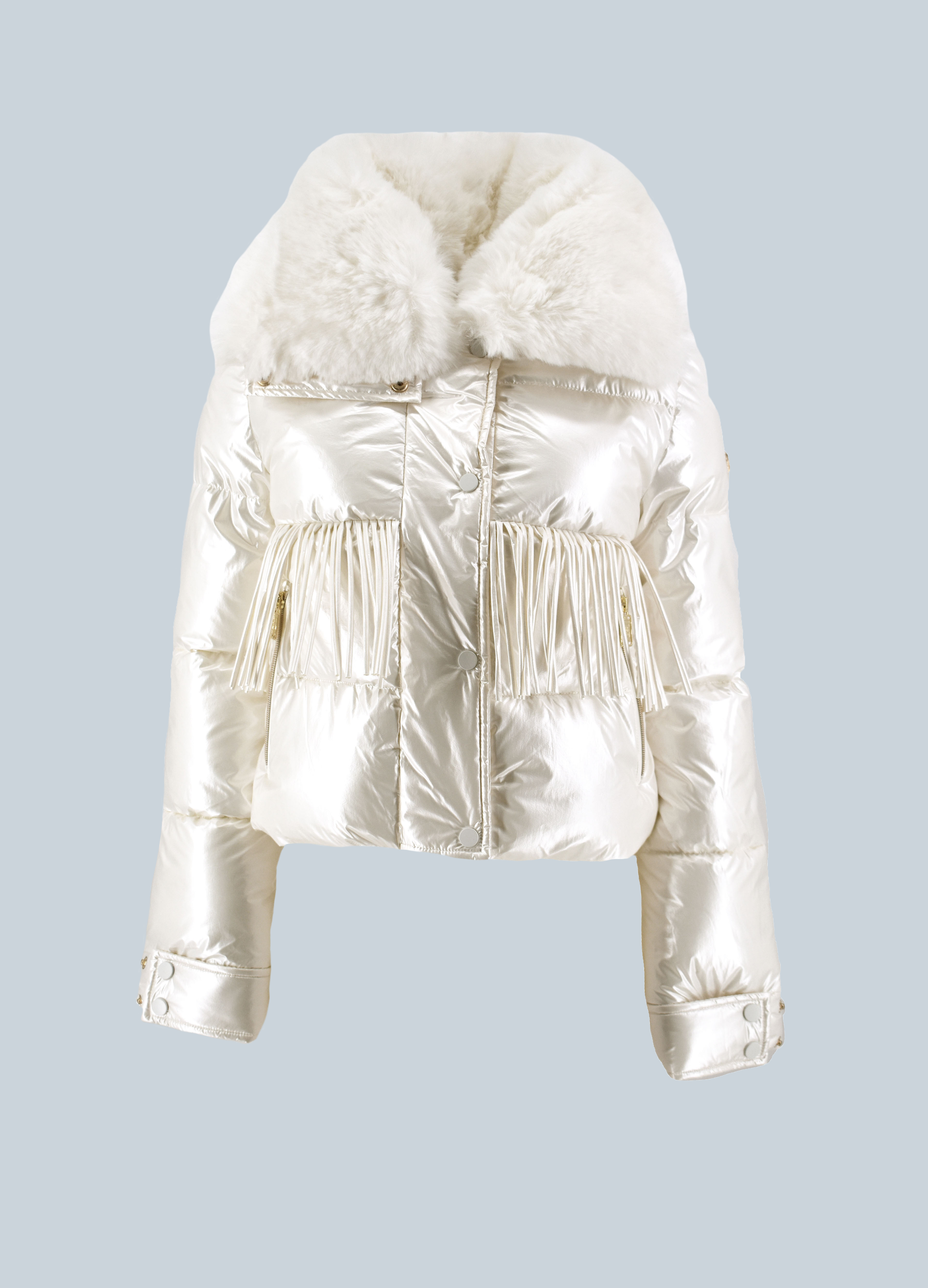 TOD 短款长袖羽绒服,带拉链加纽扣加流苏加可拆卸人造毛领。