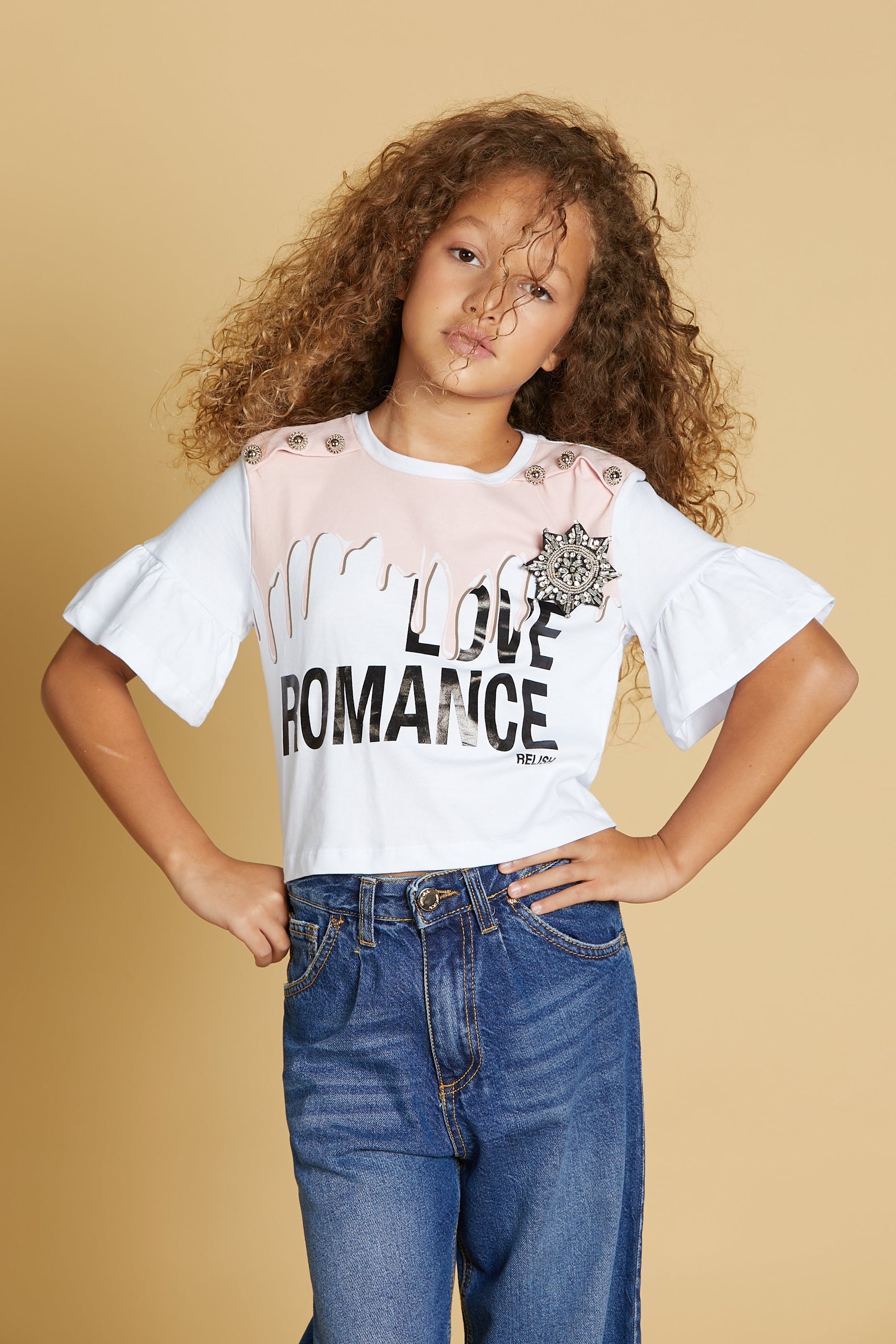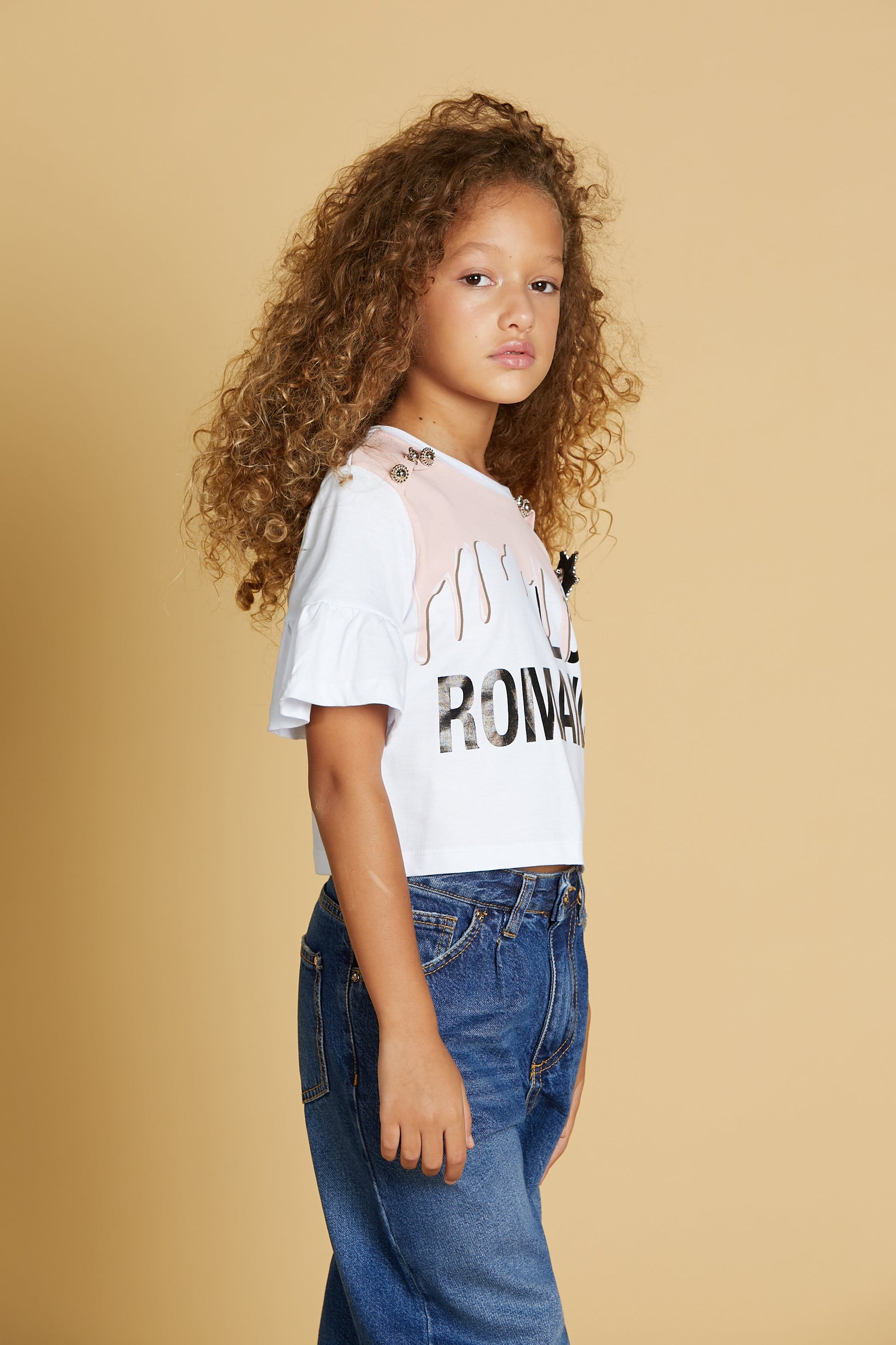 APUS 短款 s/m 荷叶边 T 恤,带印花加肩扣加水钻胸针