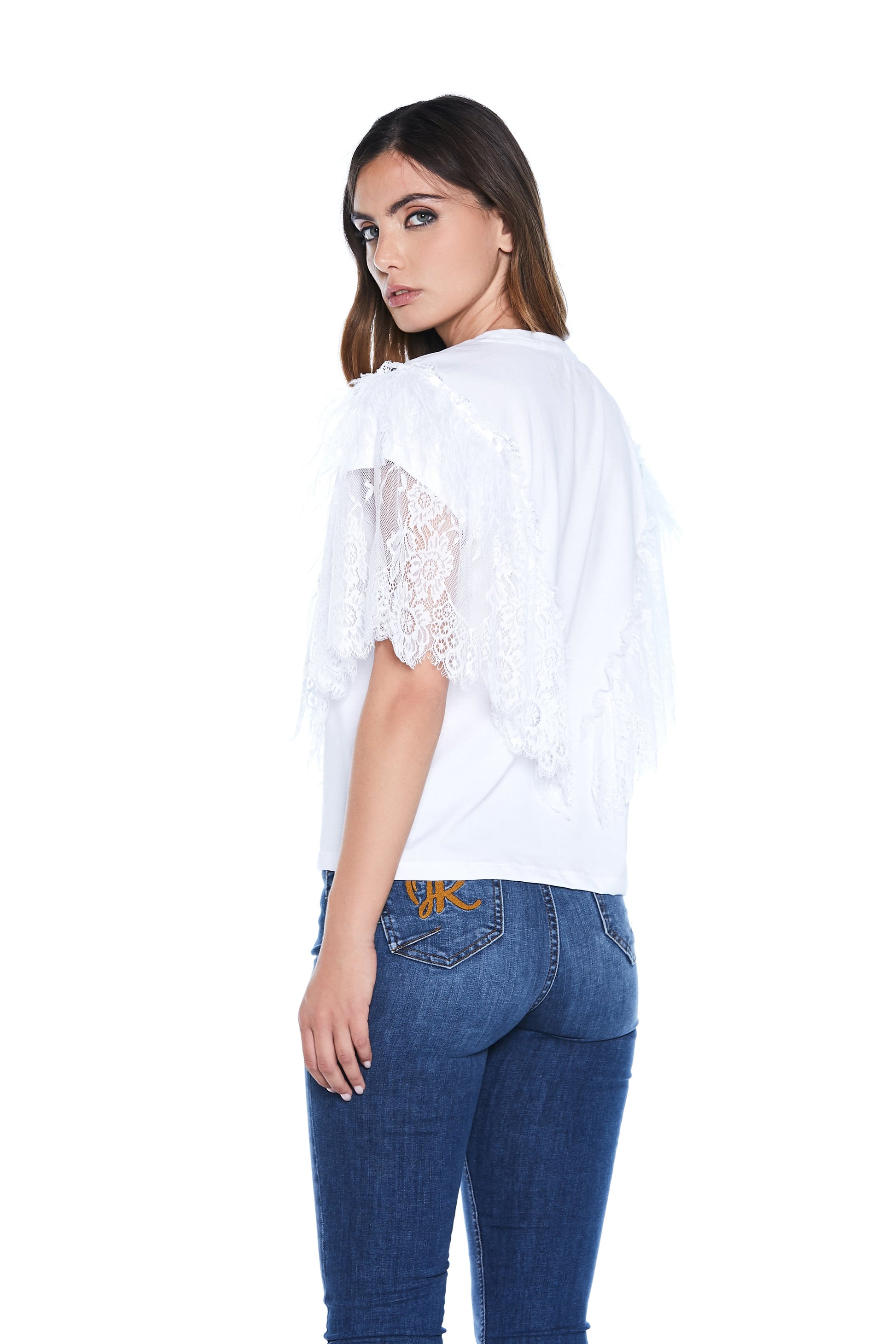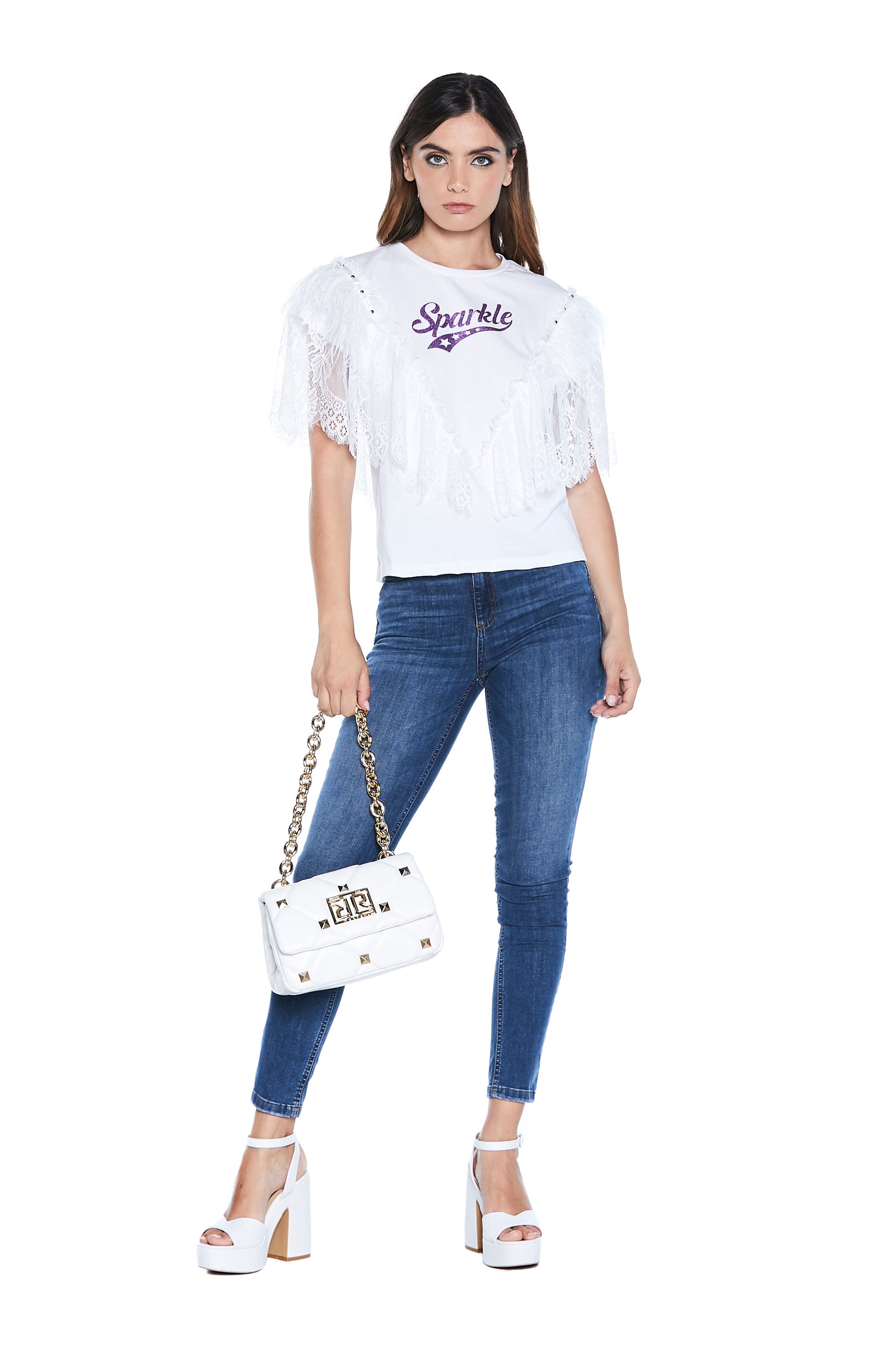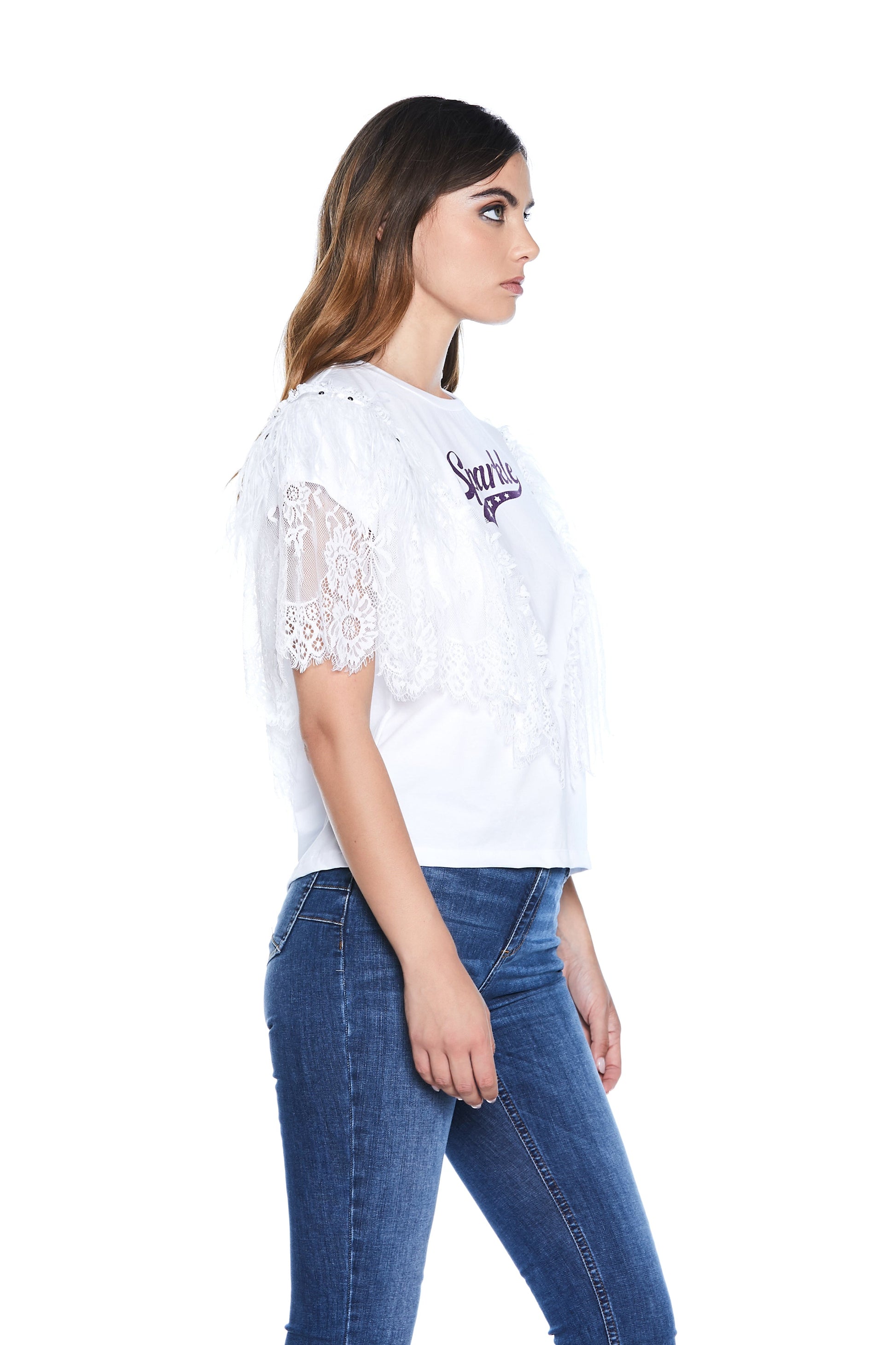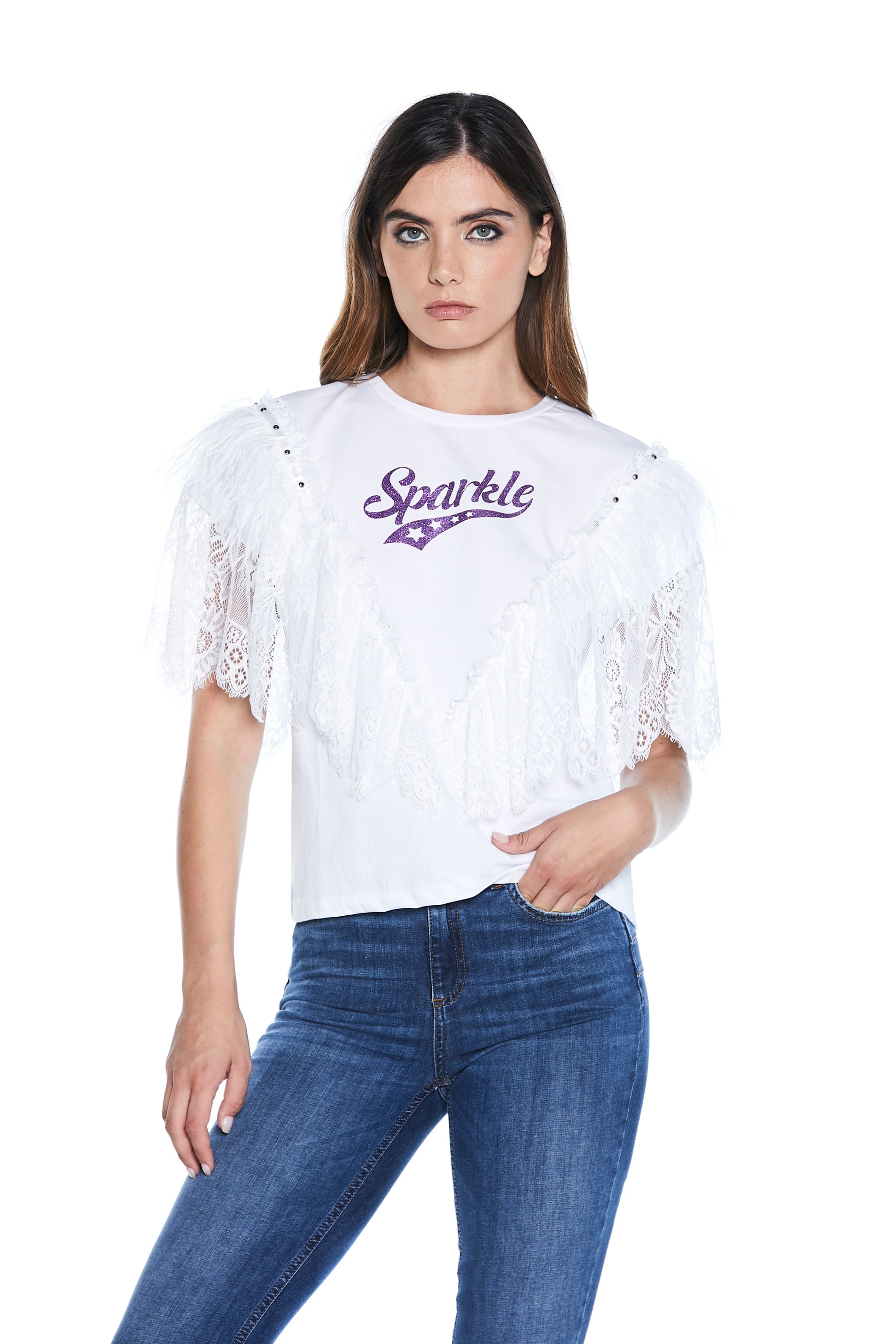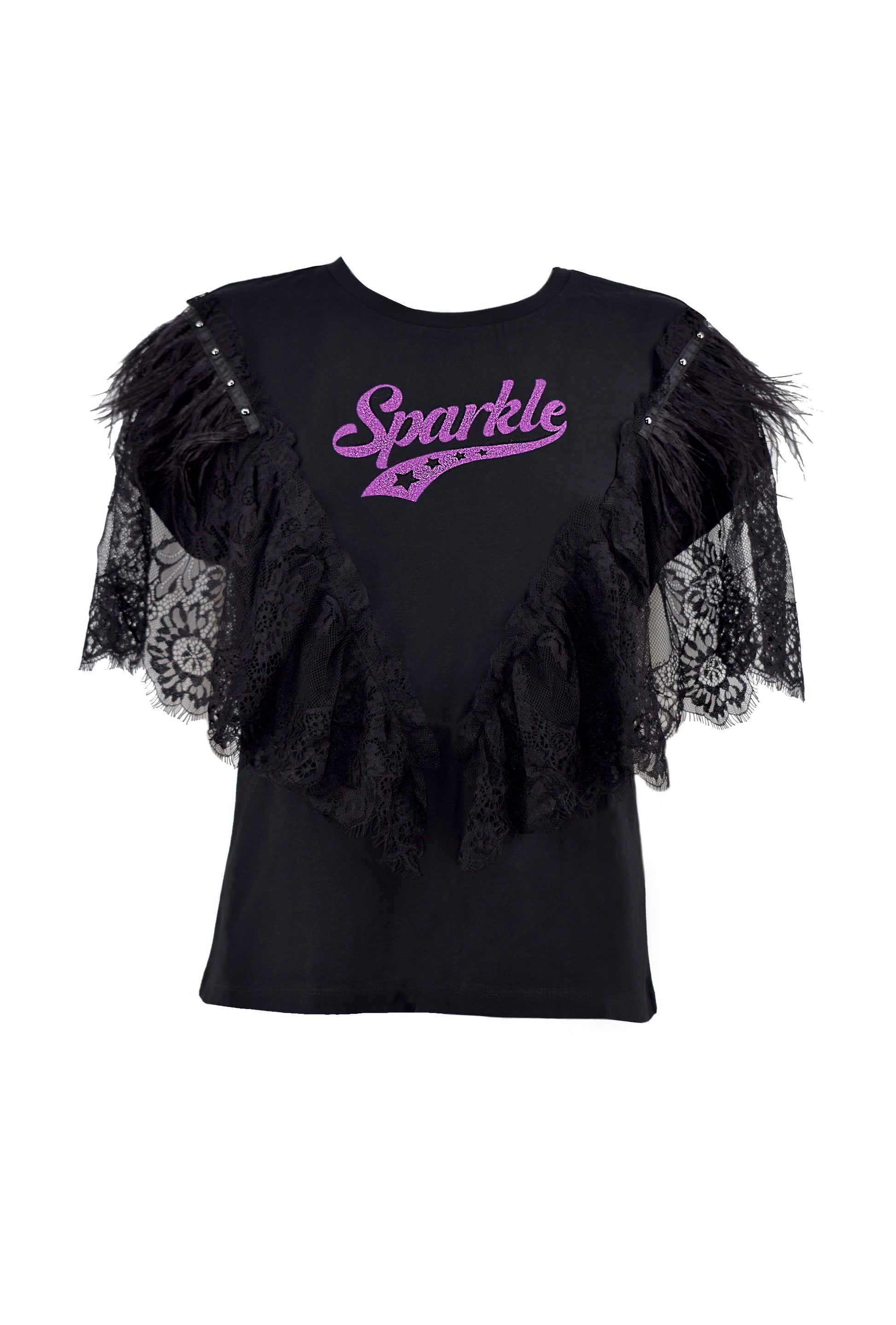 SPARKLE 半袖 T 恤,带蕾丝加羽毛加饰钉加闪光印花