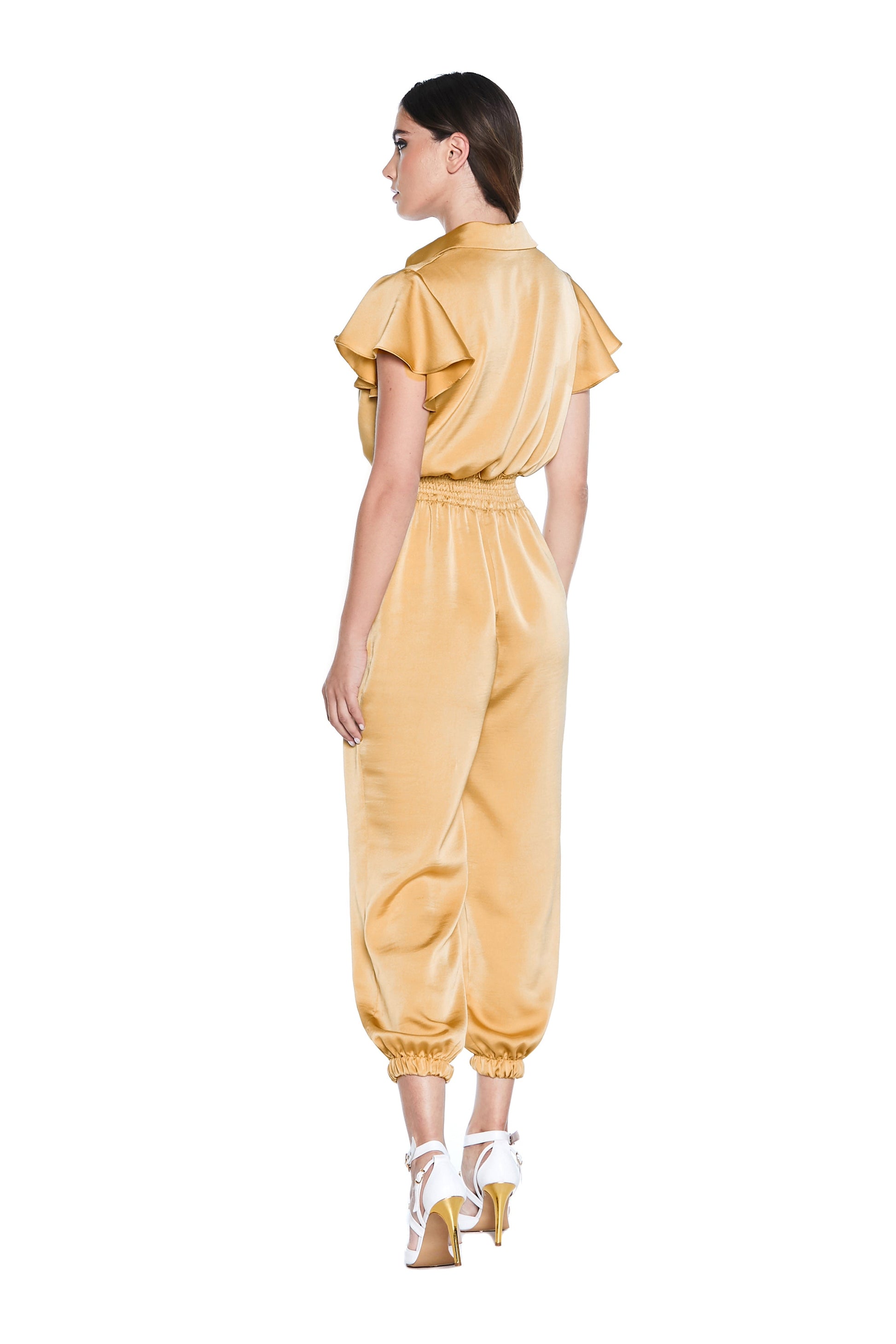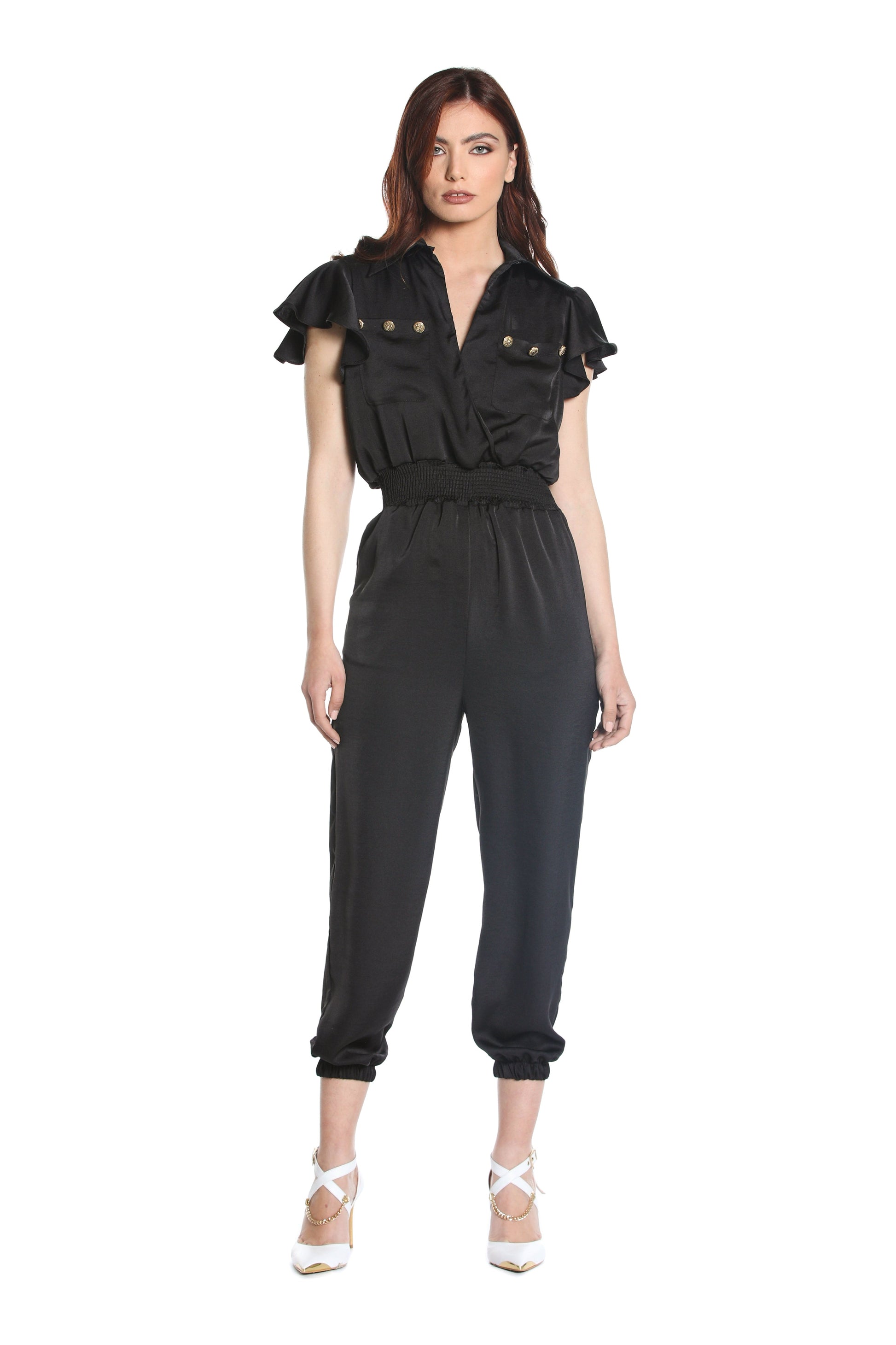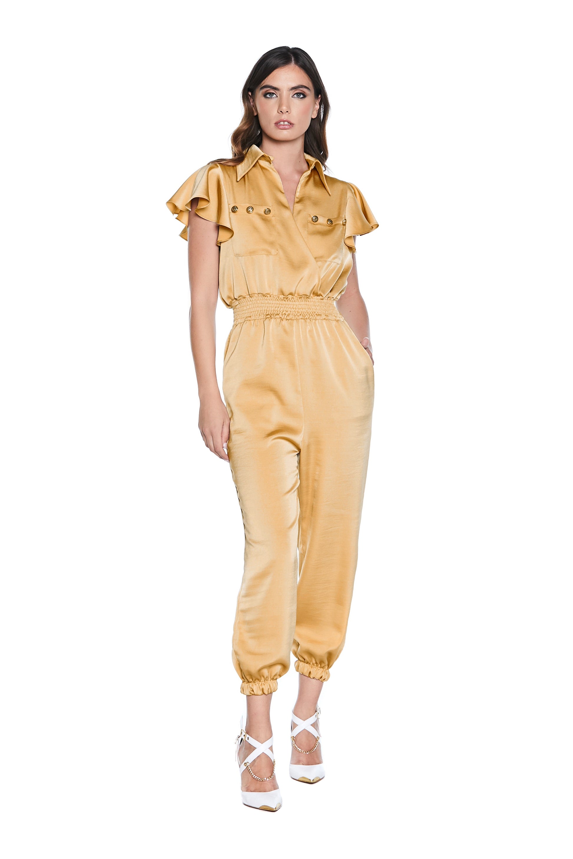 连衣裤 POTRES 长半袖交叉领口加口袋带纽扣加工作服加弹性底部